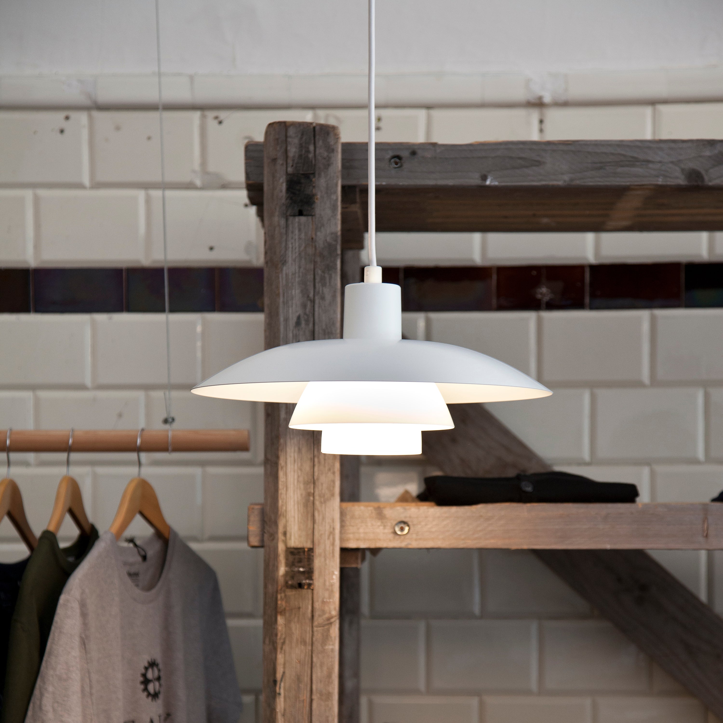 Featuring Poul Henningsen's renowned three-shade system, the PH 4/3 Pendant Lamp by Louis Poulsen ensures glare-free lighting by distributing light evenly through its top shade and smaller lower shades. Crafted from spun aluminum, with a white interior to provide soft, diffuse light and minimal shadows. Introduced in 1966, this lamp is part of a diverse collection that showcases Henningsen's legacy in lighting design.