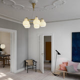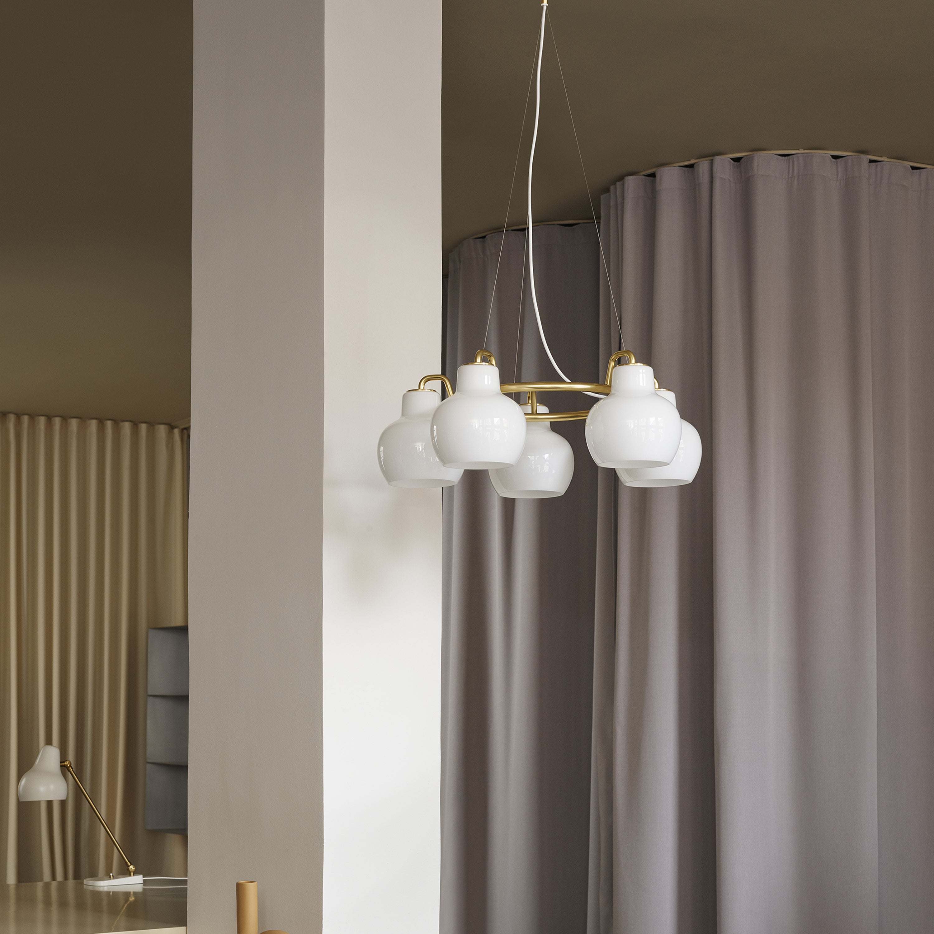 A historic artifact that lives on, VL Ring Crown derives from a 1940s lamp by architect Vilhelm Lauritzen for the Danish Broadcasting House. Fashioned in untreated, polished brass, the chandelier series features glossy white shades in triple-layered handblown opal glass, bringing a distinctive look and warm light to stylish interiors.