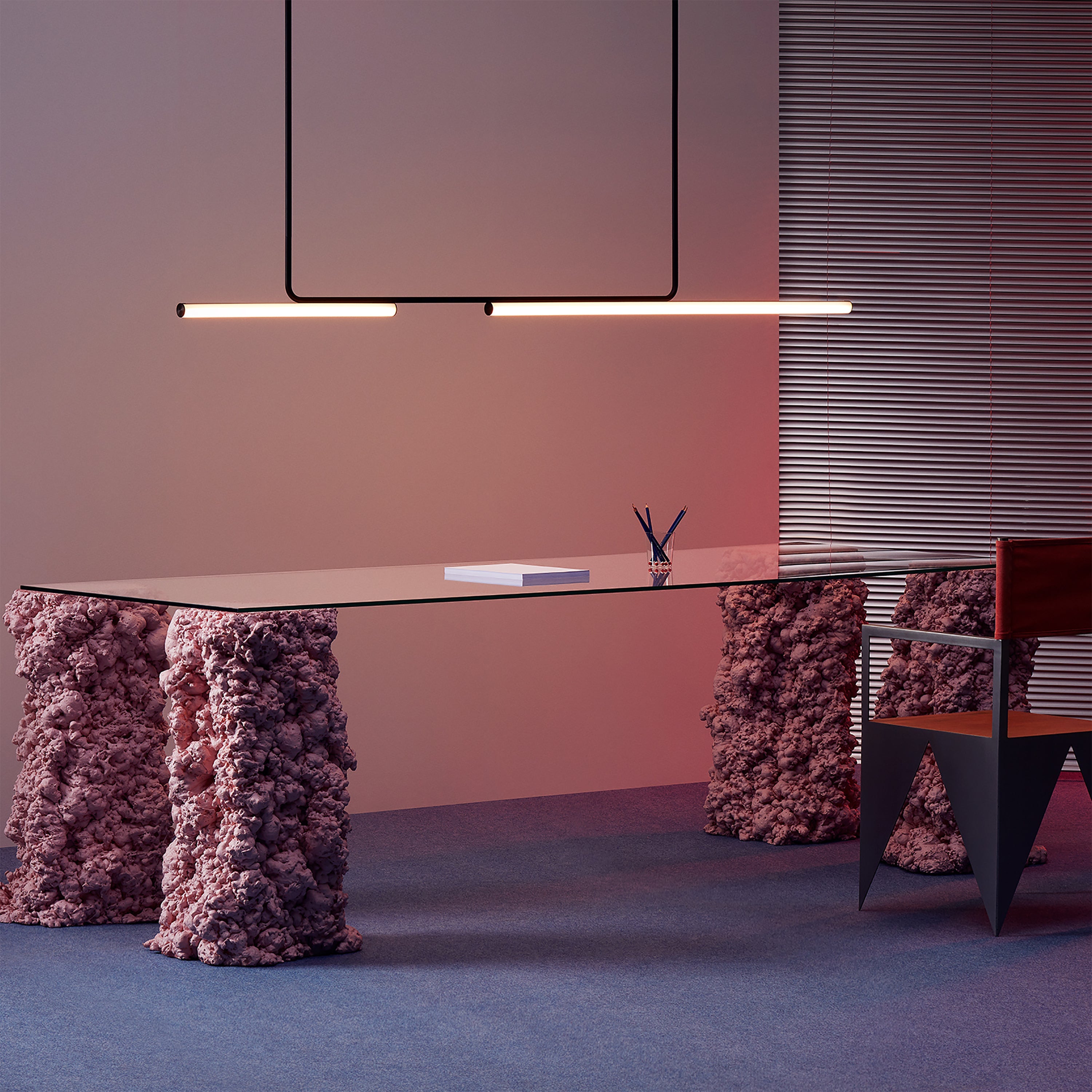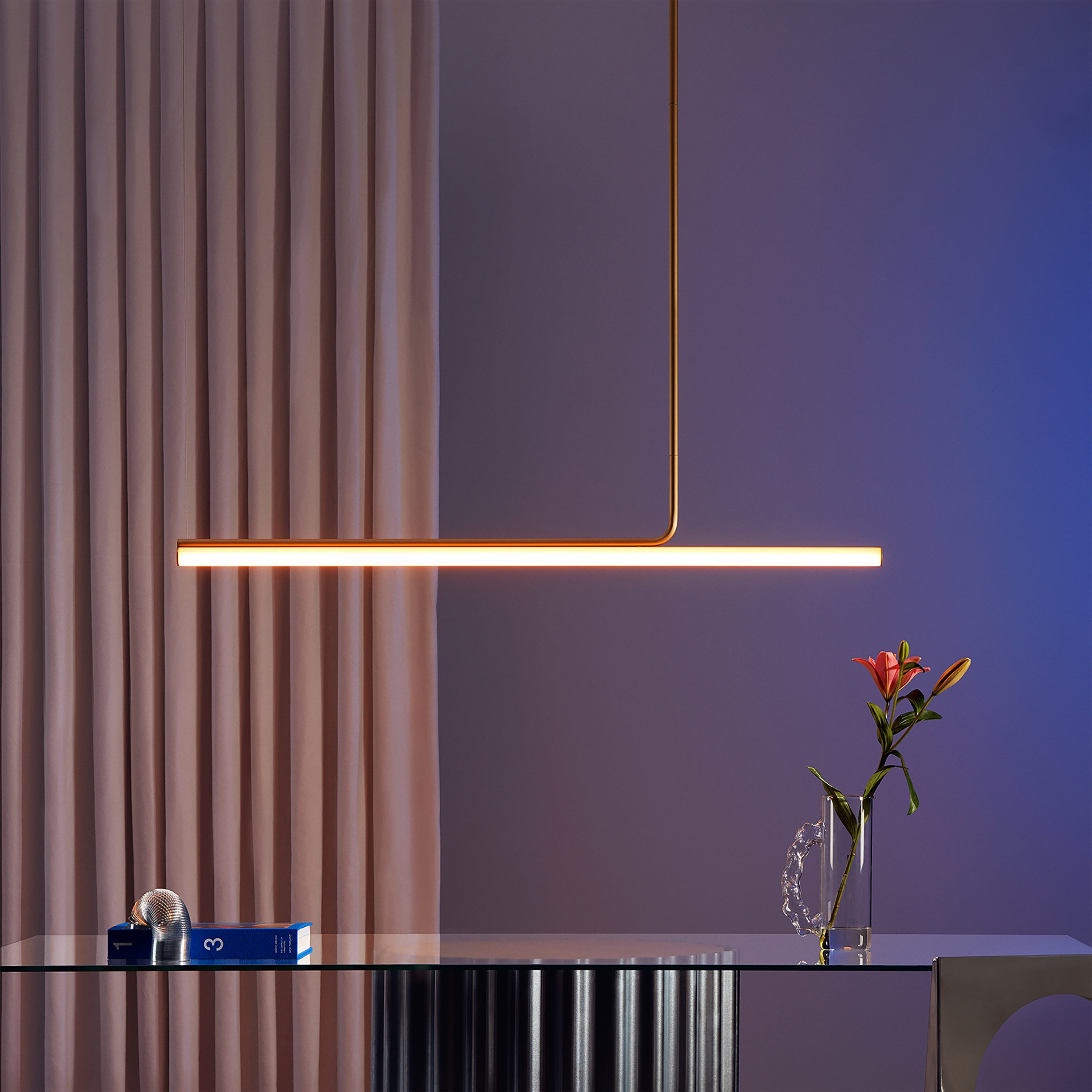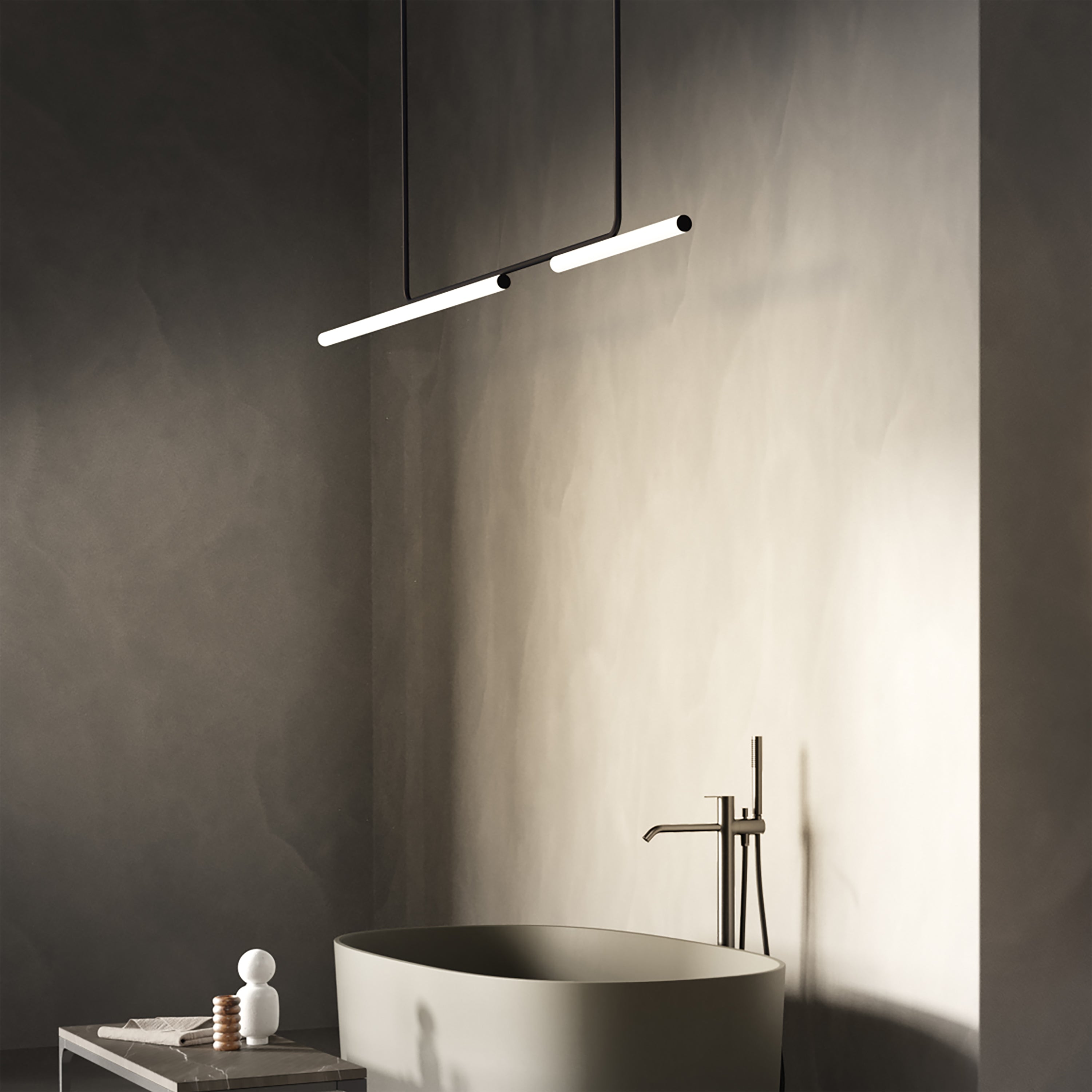 Madrid's studio Ciszak Dalmas collaborates with Barcelona's Marset on Ambrosia, a striking tubular fixture with a gently bended form. The lighting system is available in 4 pre-set lengths with variable-height ceiling extensions and also offers a choice of 3 warm color temperatures, each with adjustable intensity. In shimmery matte gold or graphic black, the linear structure allows for a diffused light that gently illuminates any type of project or surface below and fills a space beautifully.
