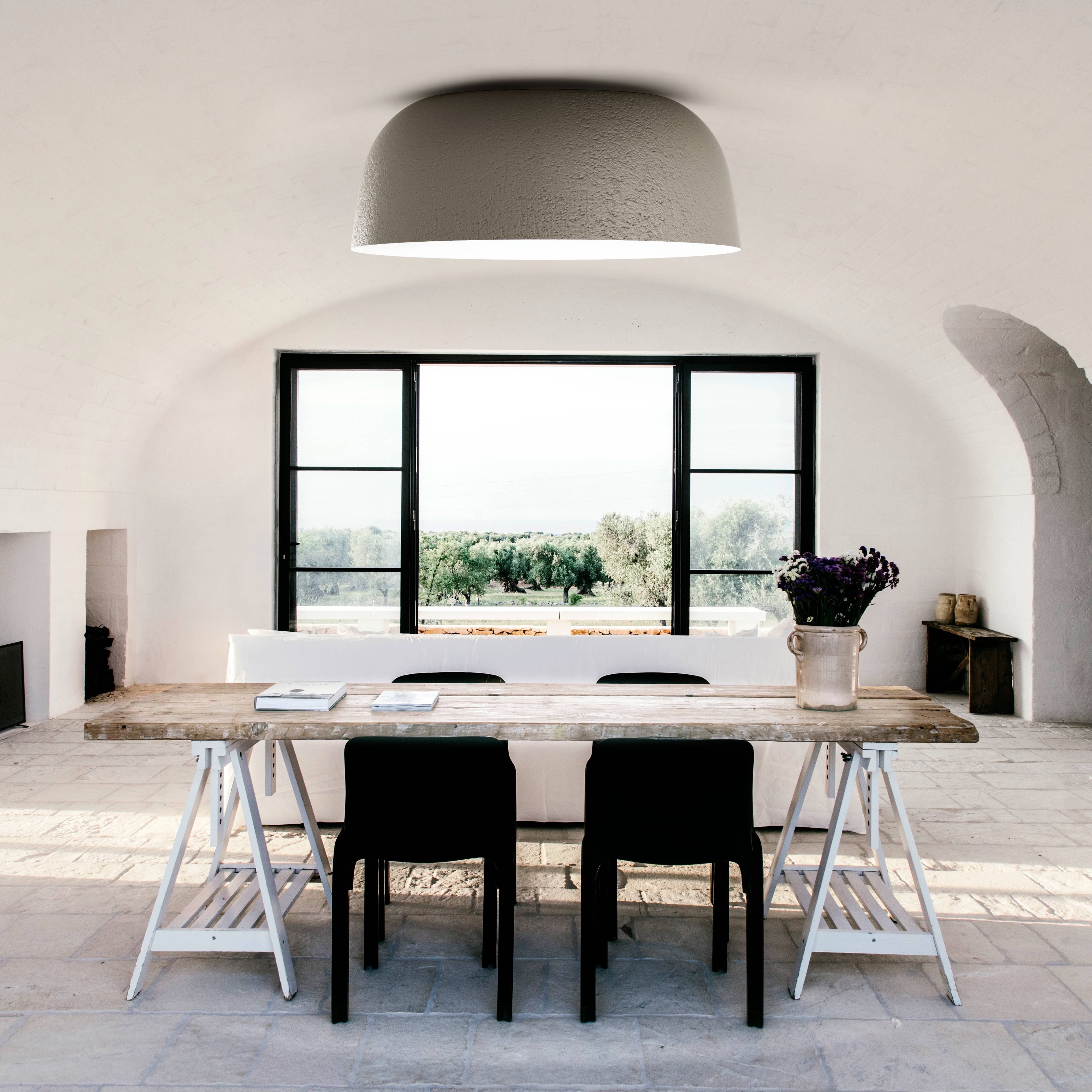 With its voluminous shape and a texture similar to stone, this ceiling light makes a undeniably majestic statement. Using a rotomolding technique allowed designer Joan Gaspar to conceive a fixture with vastly different surfaces and thus the voluminous interior has a smooth white satin-finish to reflect the light that emanates from the lacquered grey aluminum diffuser. With a choice of straightforward colors and 5 different sizes, Djembé makes a definite impression, either individually or in nearly endless combinations.