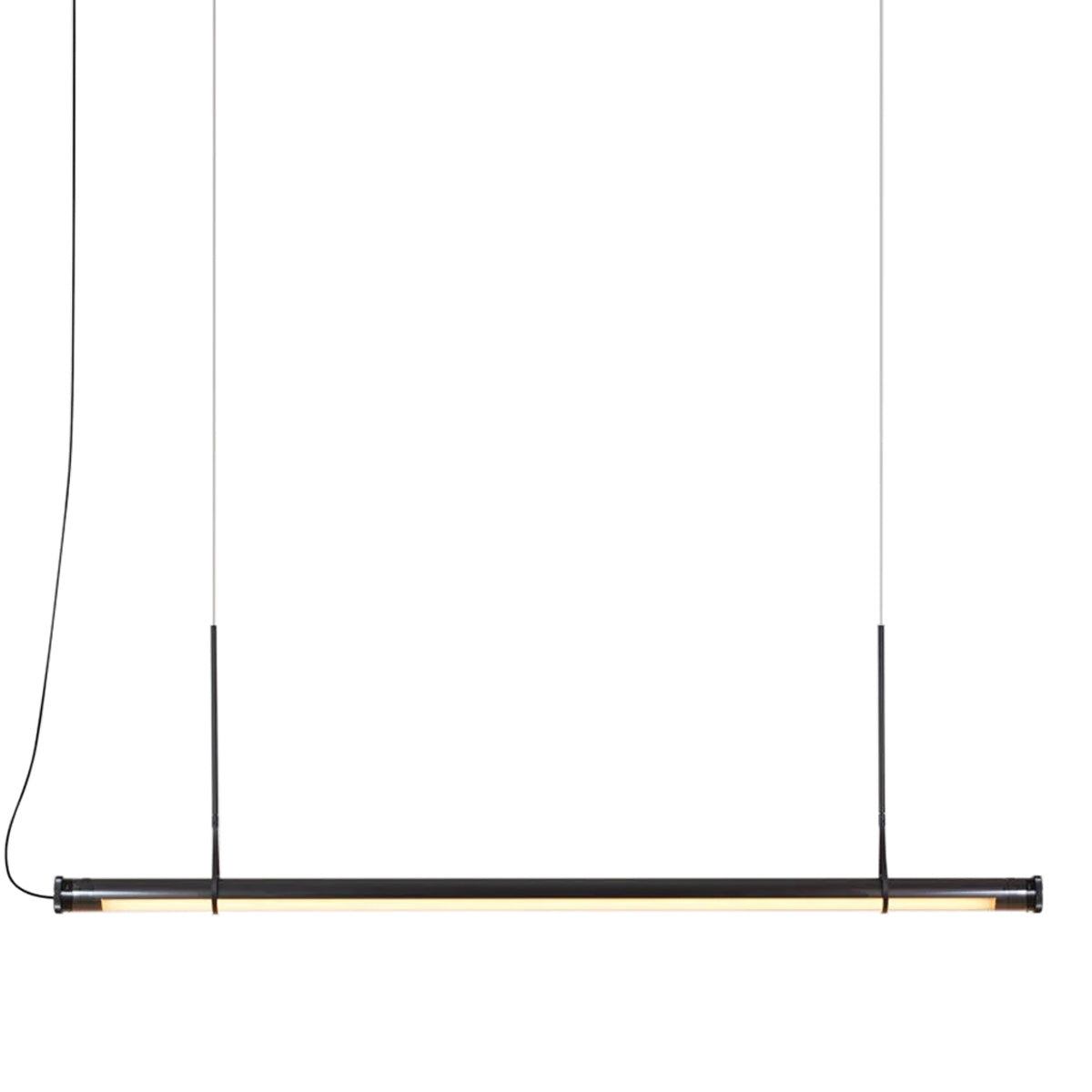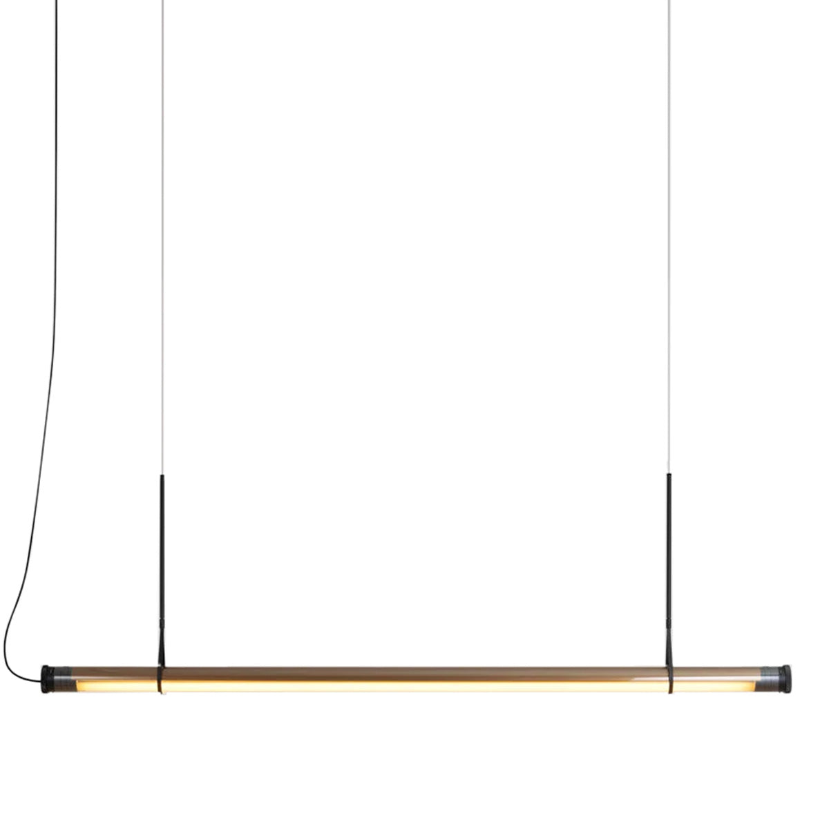 The Fris 215 Pendant Light offers precise control over light direction. It features a transparent glass tube that encloses the light source and a parabolic reflector, which can be rotated to direct the light. Suspended by straps, the pendant allows for flexible arrangement.