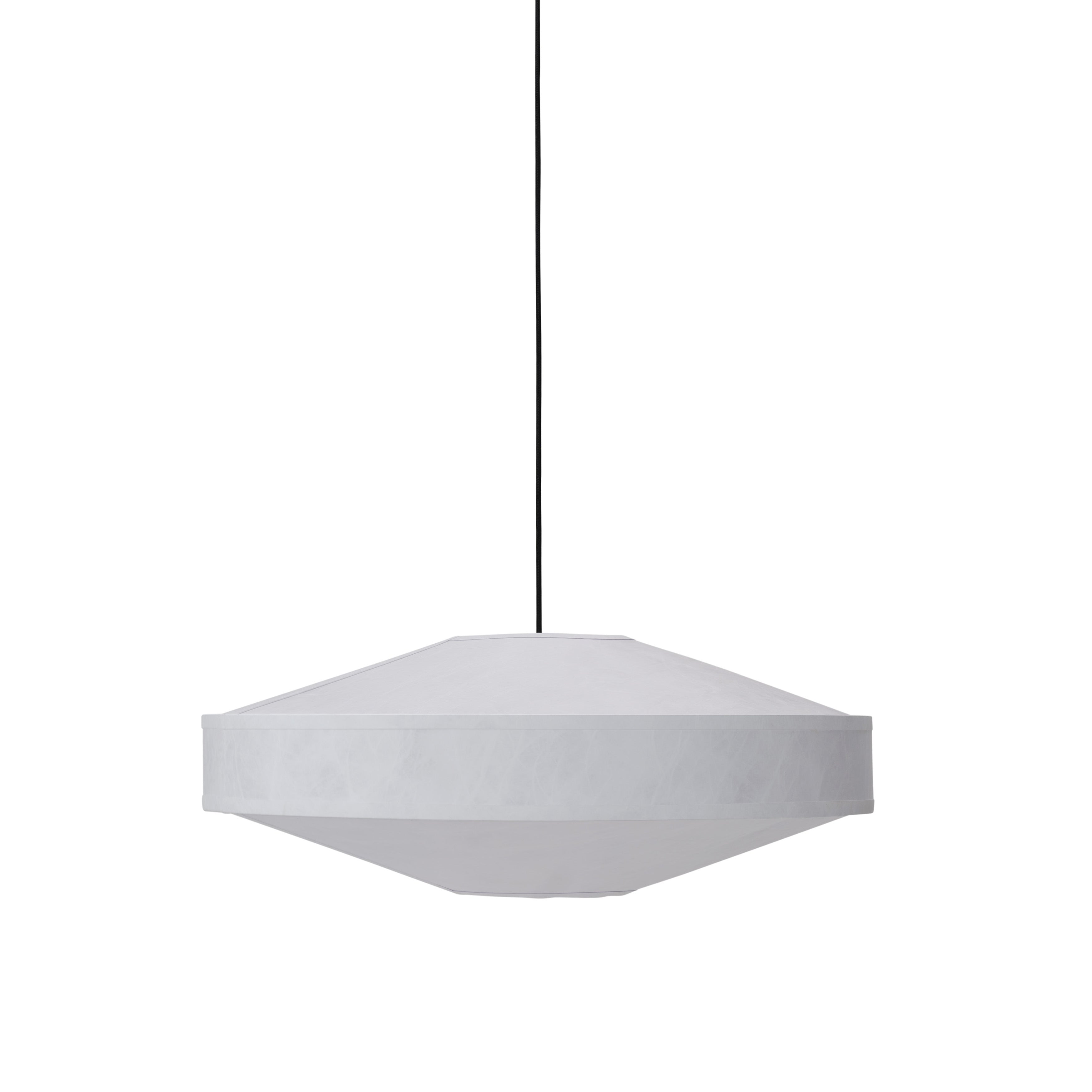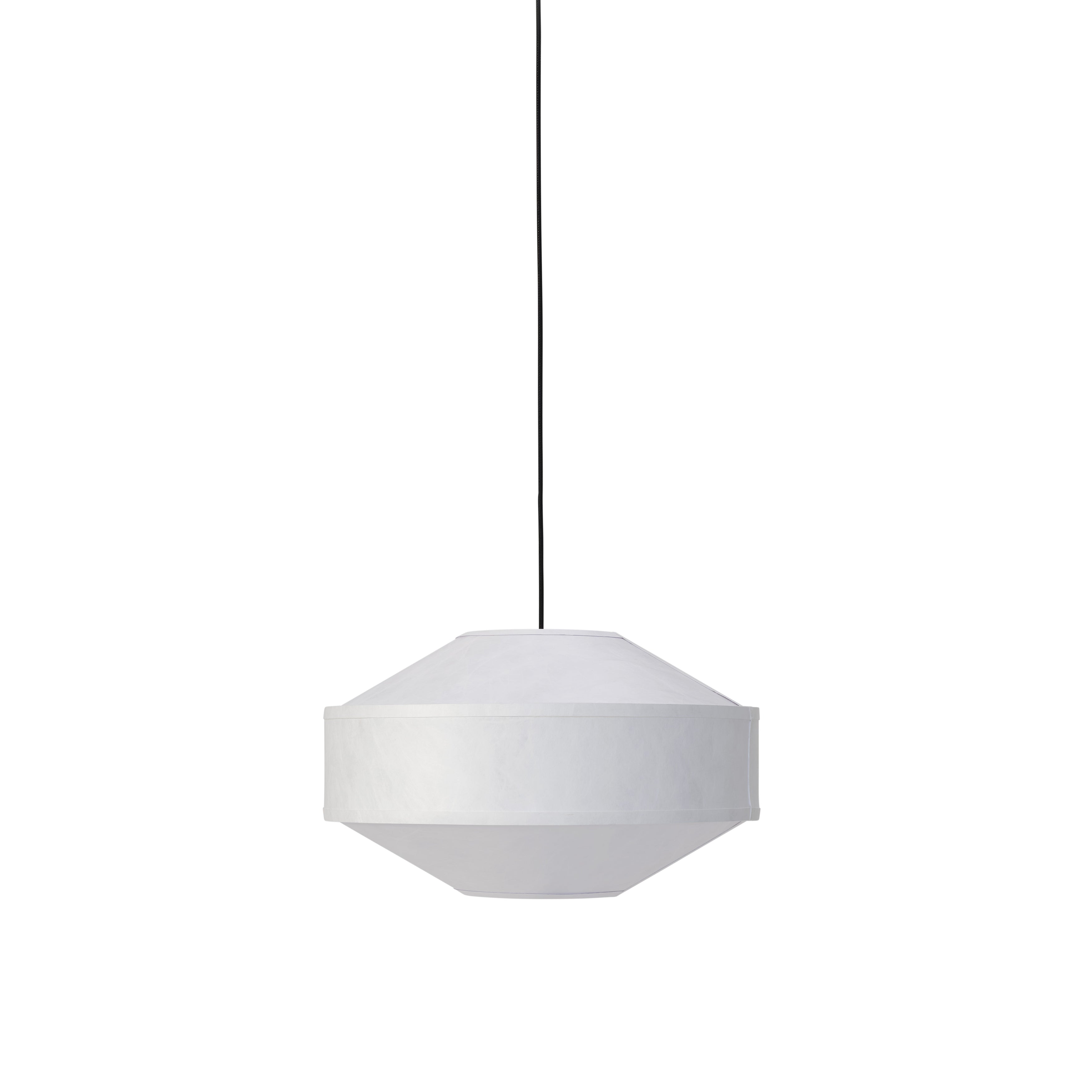 The Pendant Lamp features a geometric design made from folded Tyvek sheets, giving it a sculptural character. The translucent material softly diffuses light, creating a warm and inviting glow. Available in 3 sizes and 2 color options, white and white with black accents. Designed by a Swiss-based studio, Pante & Tourron, celebrated for its innovative use of materials and technology.