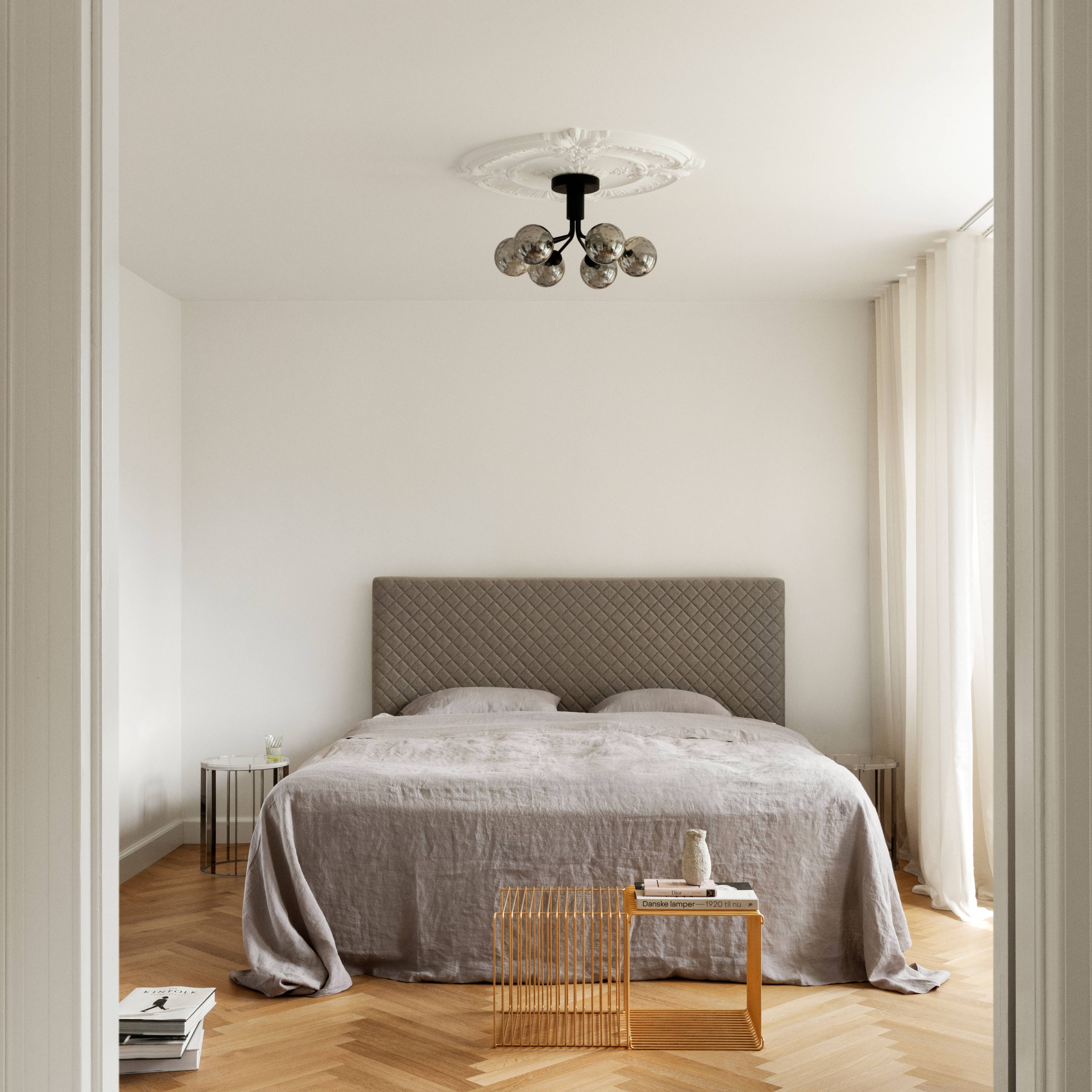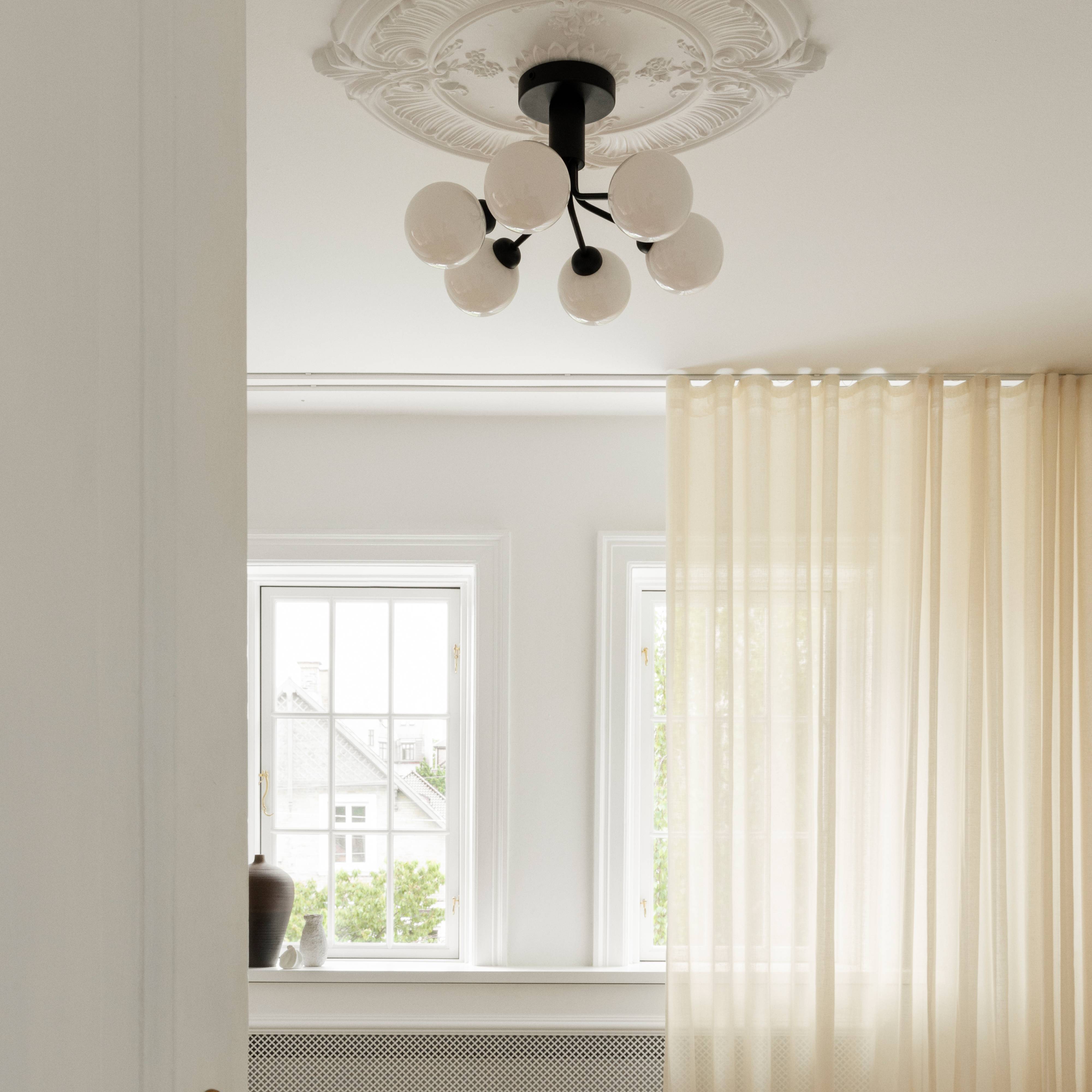 A ceiling-mounted version of Noura’s collection pendant, Apiales 6’s height makes it eminently suitable for rooms with limited drop space available that still call for a chandelier-like fixture. The subtle expression of the radiating frame in either a rich satin black or warm brushed brass metal brings character to any setting. Sophie Refer’s characteristic design is topped with hand-blown globes in either clear optic smoked glass or opaque opal, adding a dynamic play of light and shadow to the atmosphere.
