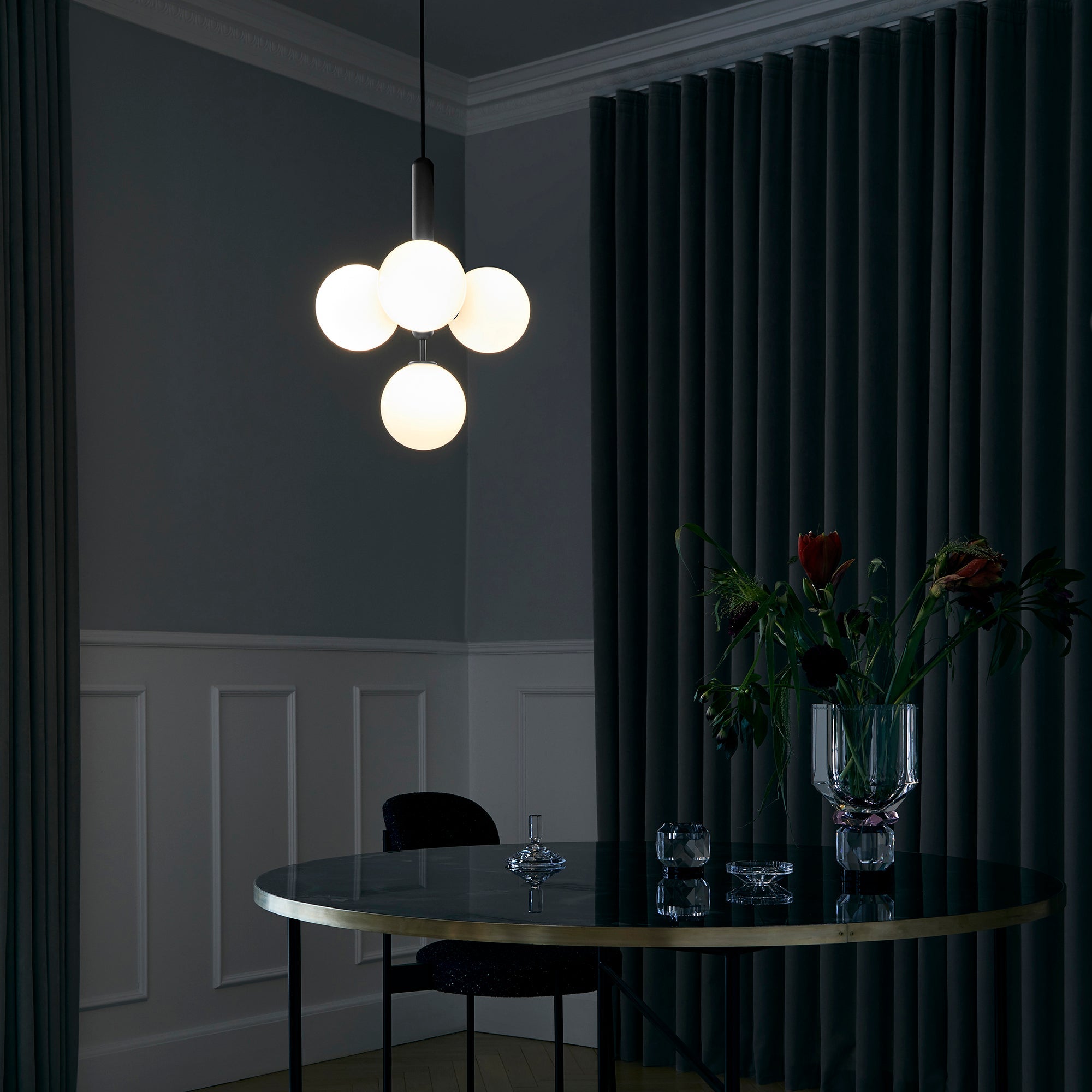 Miira means "beautiful vision" and this chandelier from award-winning Danish designer Sofie Refer of Nuura certainly qualifies in every respect. Four mouth-blown globes in either clear optic or milky opal glass—with slight variances in the final effect which make each piece unique—are clustered around a subtle dark-grey central metal stem, imparting a sense of balance and depth. Soft even light spreads from each glowing orb and creates a lovely cozy atmosphere in any setting.