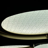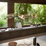 Designer Christophe Pillet’s elegant Berlin series adds a standout suspension light, with 4 of his signature ringed diffusers arrayed across a slender horizontal stem, each rotating 360 degrees. The adjustable round light units offer direct and diffused illumination filtered through insets of sand-blasted wired glass, structured in anodized brass or matte black.