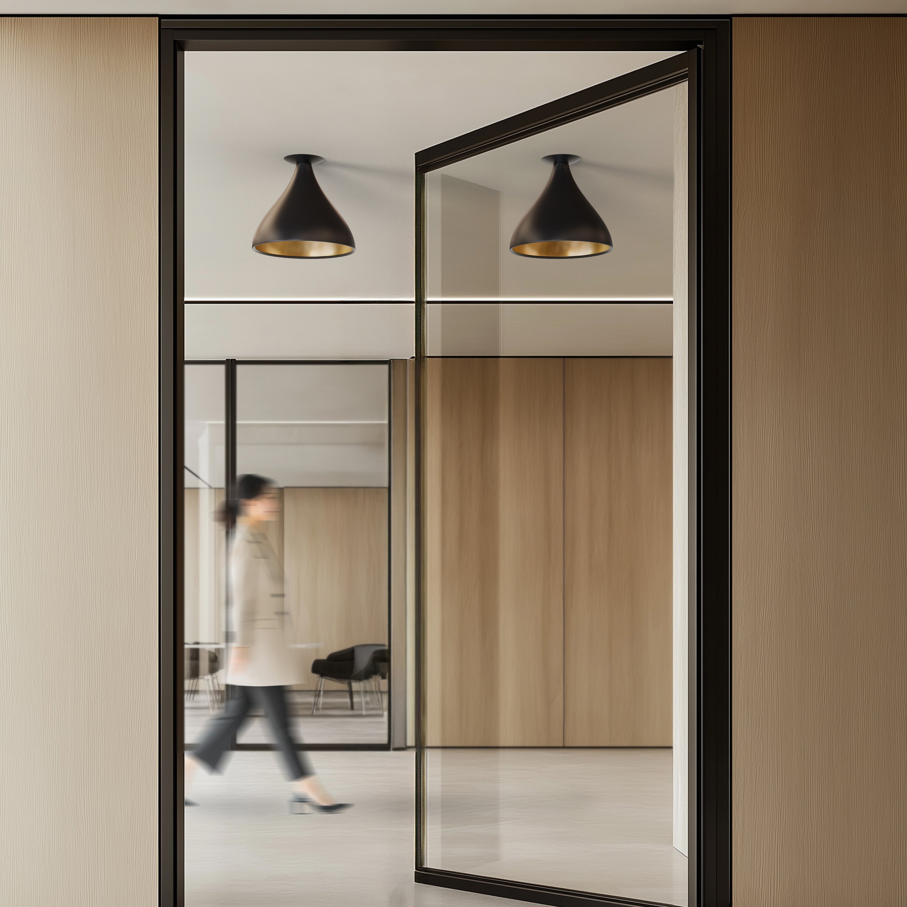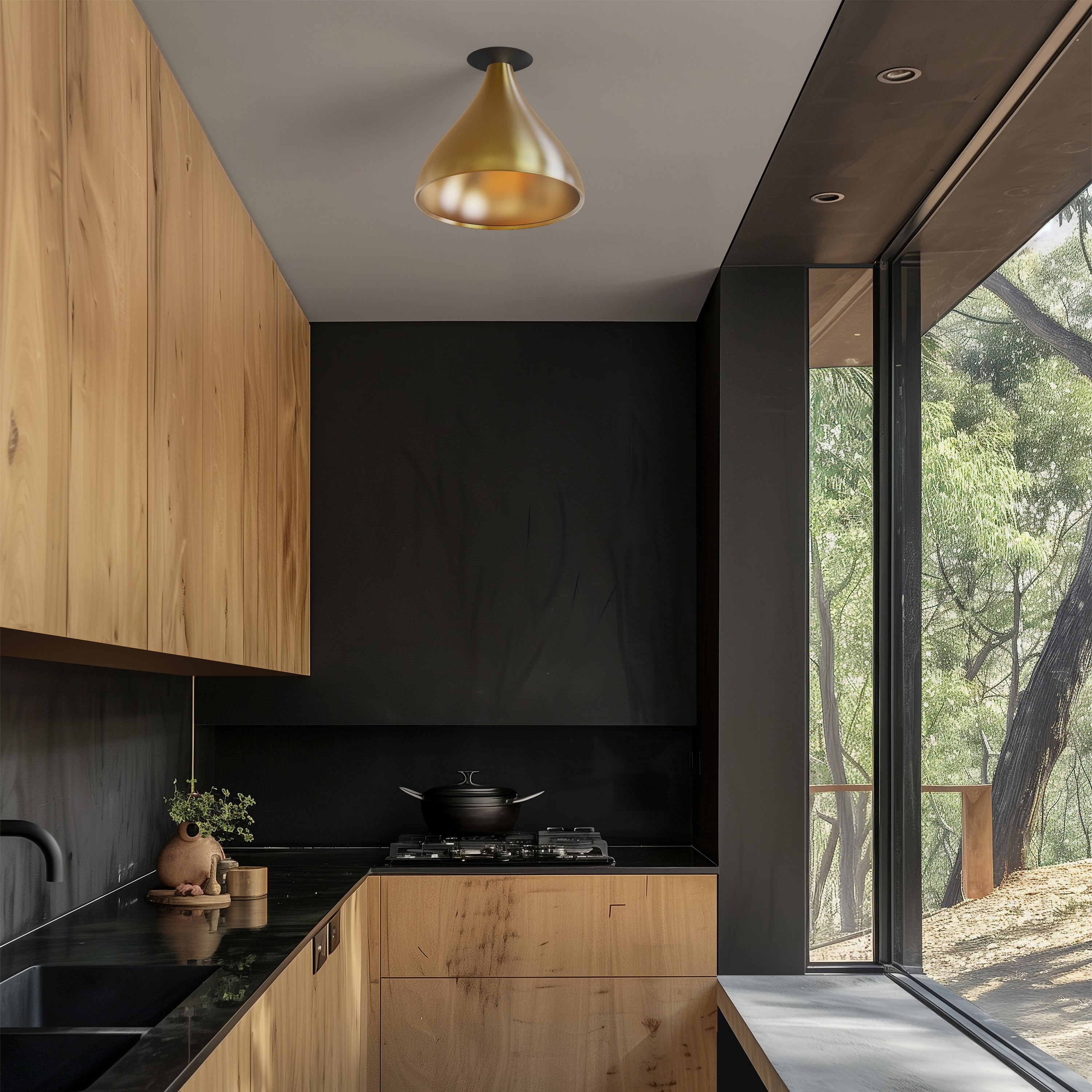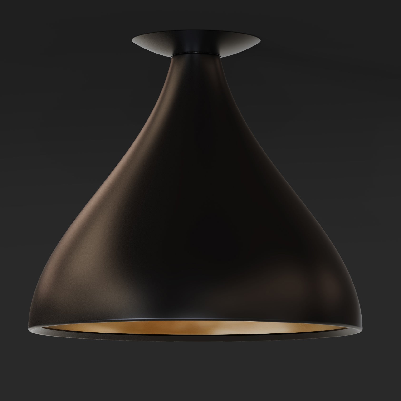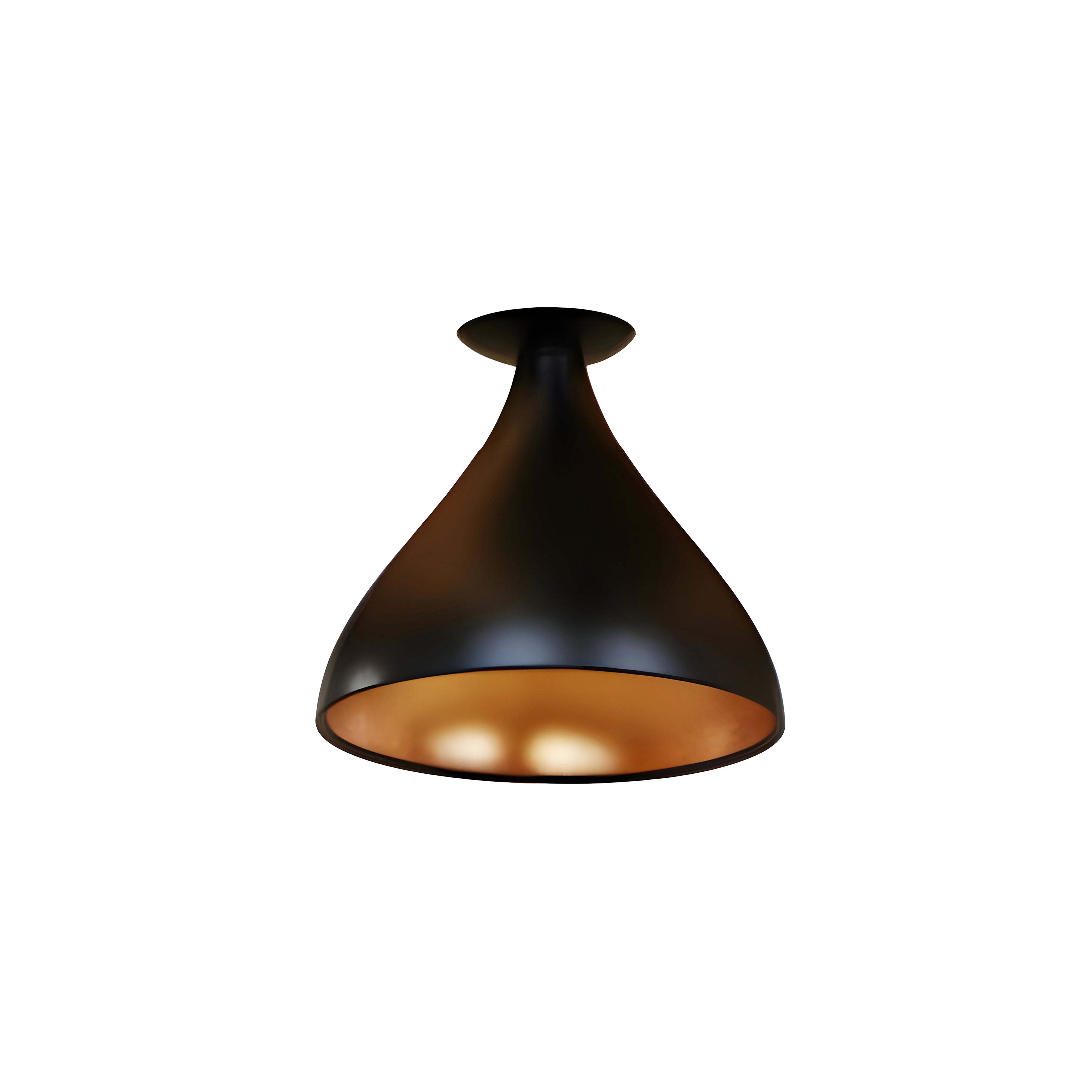 The Swell Flush XL features a smooth, sculptural profile and a warm brass interior that casts a soft, ambient glow. Made from spun aluminum, this ceiling fixture is damp-rated for indoor and covered outdoor settings. Available in narrow, medium, and wide profiles.