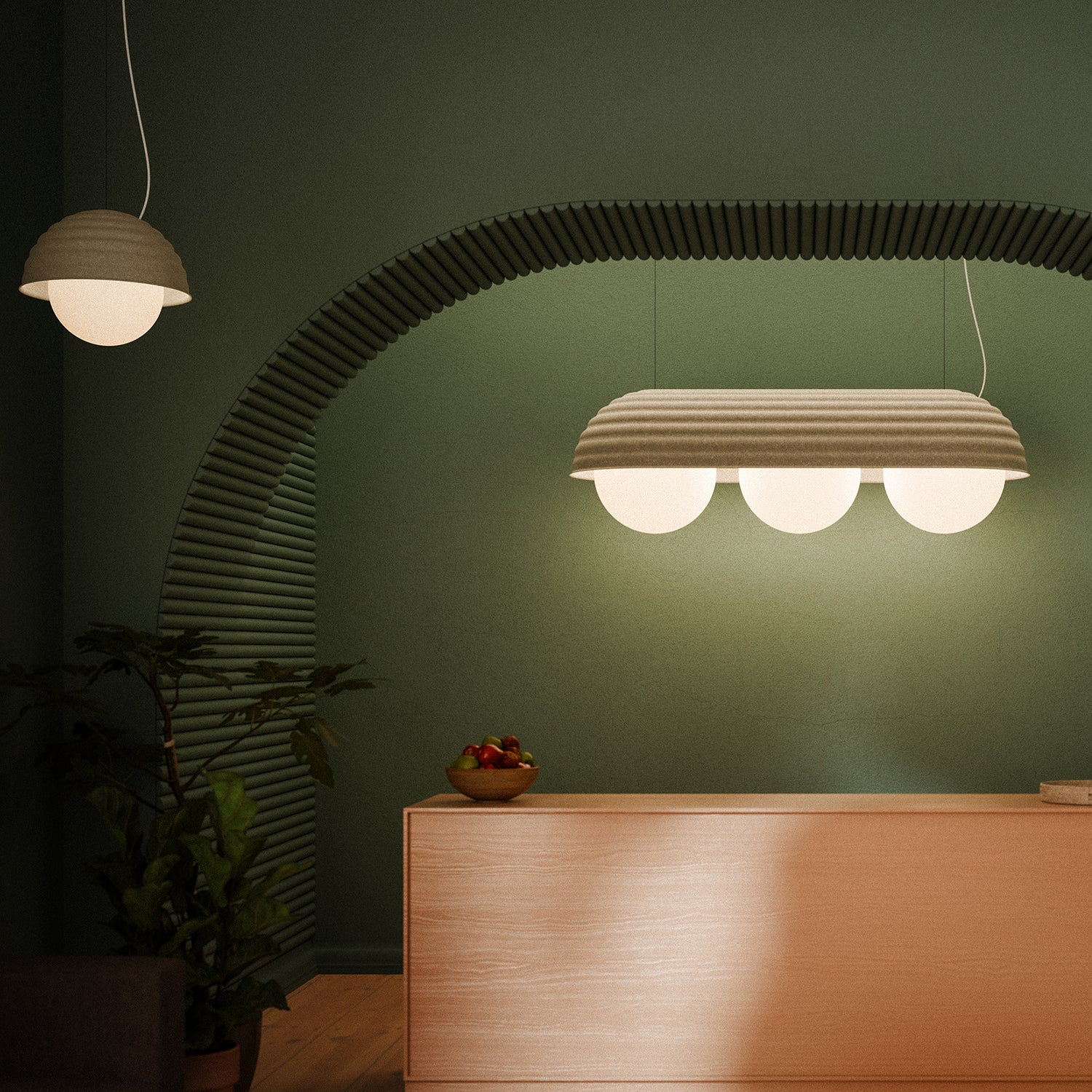 The Bon Pendant is a sculptural lighting fixture that combines an opal glass globe with a molded felt shade and structural aluminum elements, offering soft, diffused illumination with acoustic qualities. Available in small and large, it delivers high color rendering (CRI ~90), multiple color temperatures, and dimmable control. The pendant works well as a focal light in dining areas, living rooms, or entry spaces.