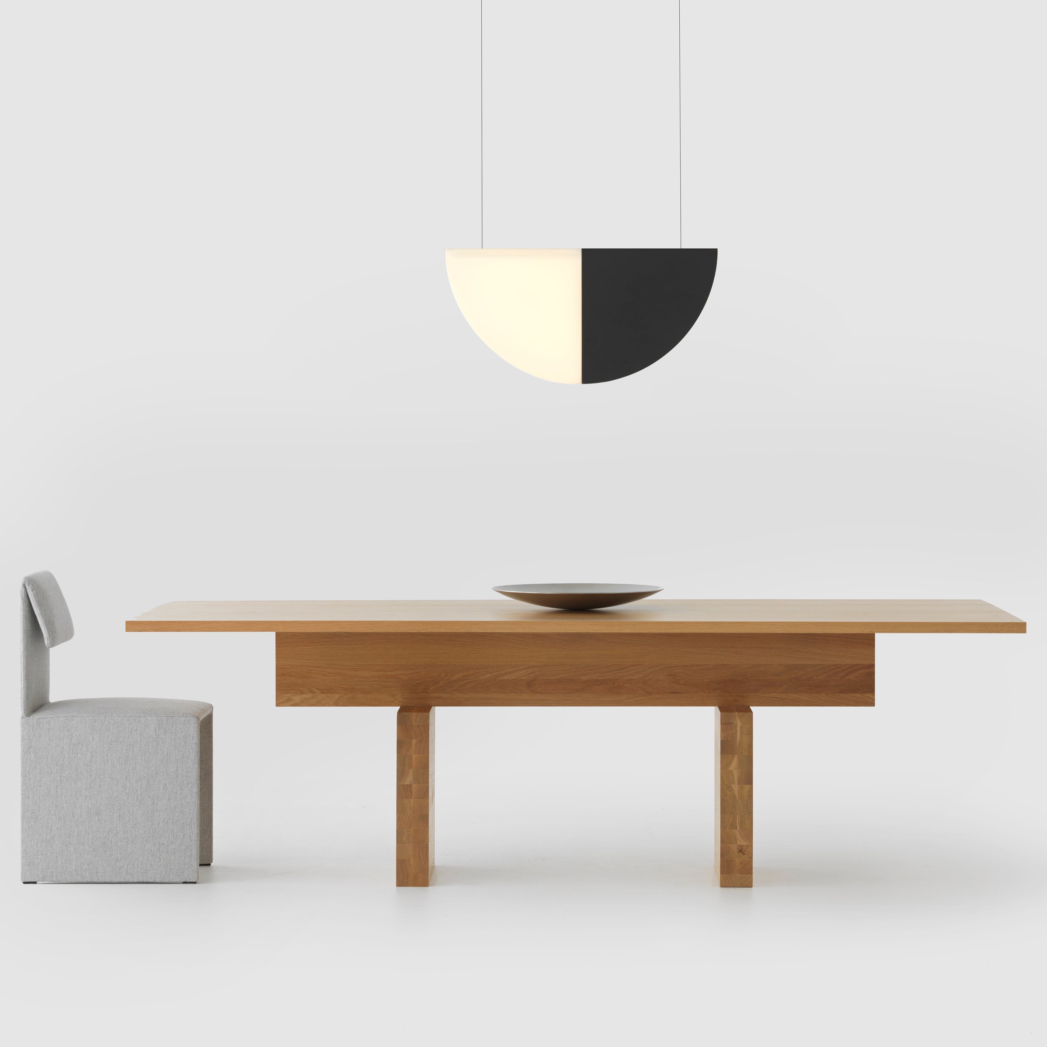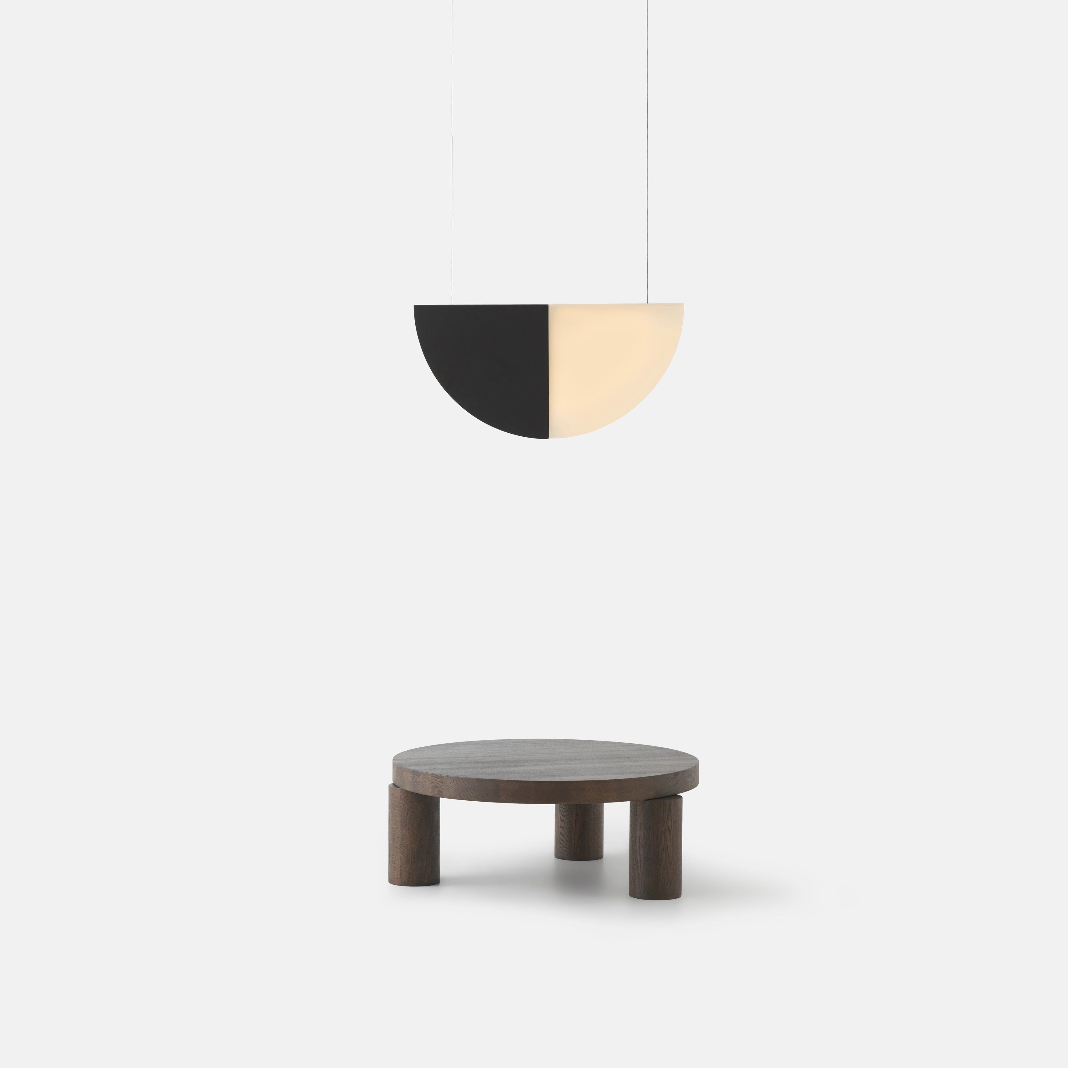 The Phase Pendant by Resident, designed by Estudio Persona, draws inspiration from lunar phases, featuring a crescent-shaped form suspended from slim wires. Its dark bronze body houses a warm LED-lit acrylic diffuser, enhanced with a subtle linen-like texture, creating a beautiful interplay of shadow and light. This pendant functions both as a striking centerpiece and gives a sense of weightlessness. Available in small and large sizes, the Phase Pendant is handmade in New Zealand.