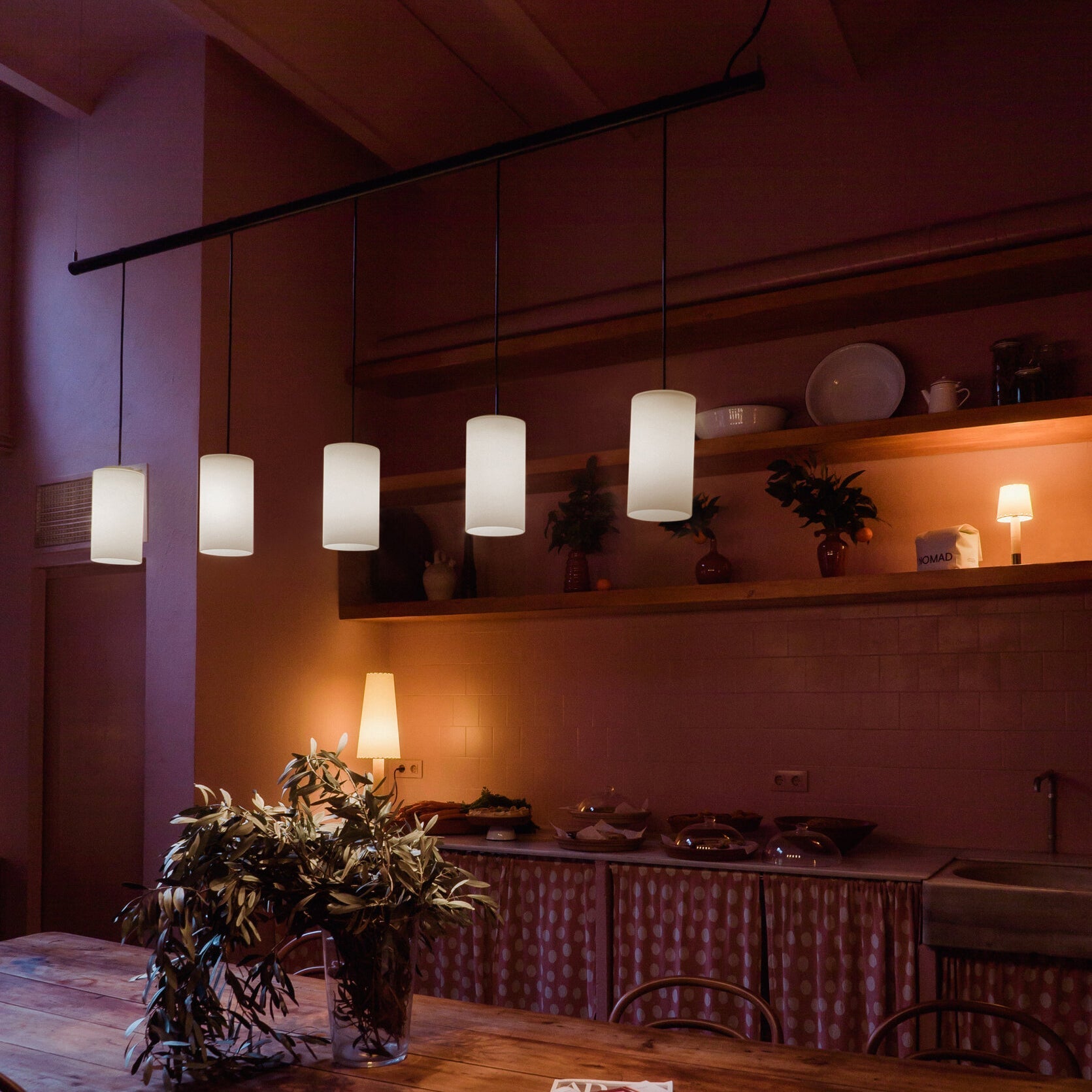 For bigger installations, Lineal offers designer Antoni Arola's pendant in modular sections of 5 columnar lights in a row in single, double and triple-length versions. Each individual light is powered by a central LED capsule and Santa & Cole offers a selection of shade choices. Translucent opal glass provides bright, even illumination, opaque brass serves for spotlighting and a shade in fine handcrafted Sargadelos porcelain brings candle-like warmth.