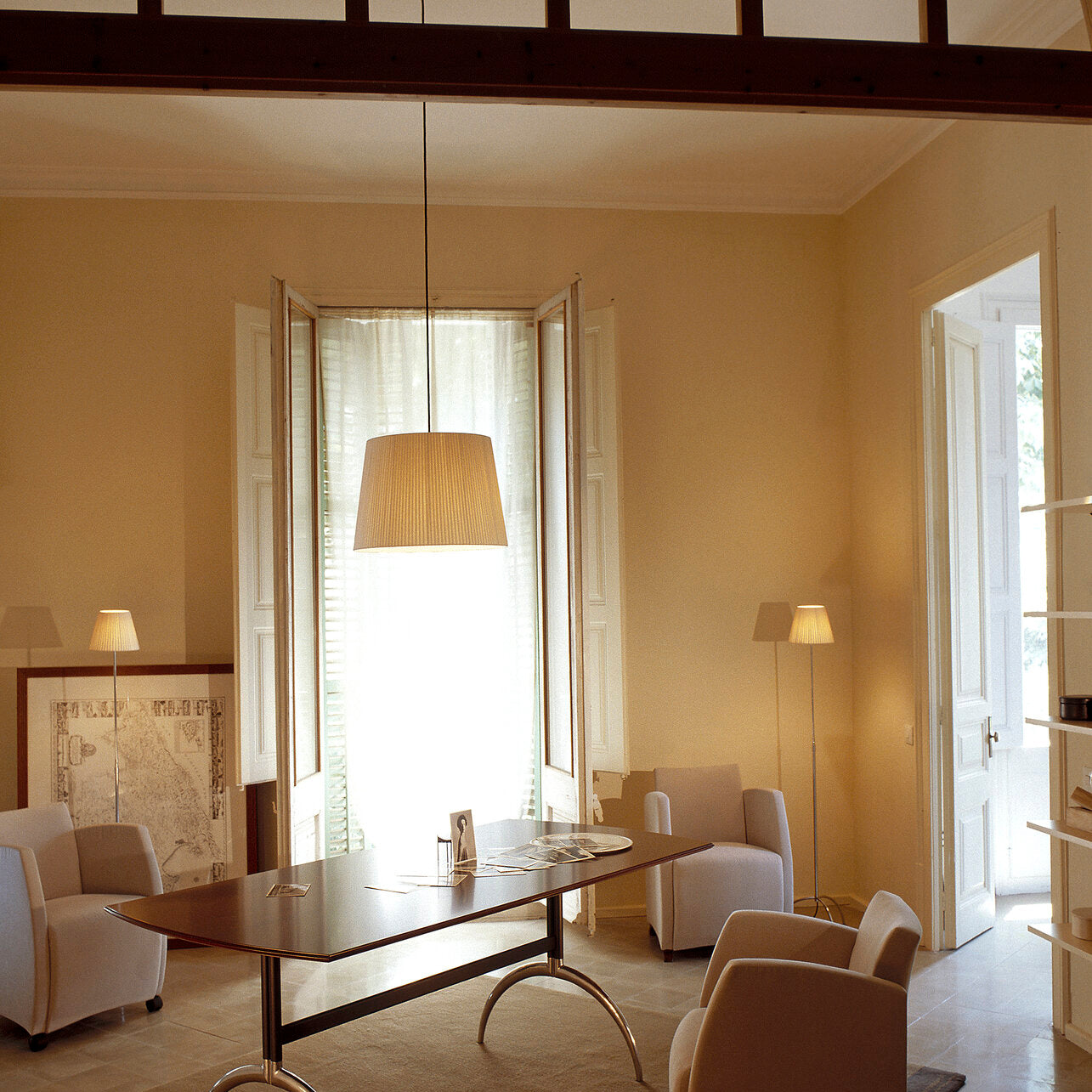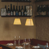Defined by its conical shape and lightweight design, the Sísísí Cónicas MT1 Pendant Lamp offers a versatile lighting solution for a variety of indoor environments. The shade is available in stitched beige parchment, white linen, or ribbon in colors such as natural, red-amber, black, terracotta, mustard, and green. Designed by the Santa & Cole team in 1993, the MT1 accommodates an E27 bulb (max 60W, not included) and features a 300 cm adjustable cable. It includes a metallic canopy in satin nickel or textured black. CE and UL certified, the lamp balances functionality and visual warmth with ease.