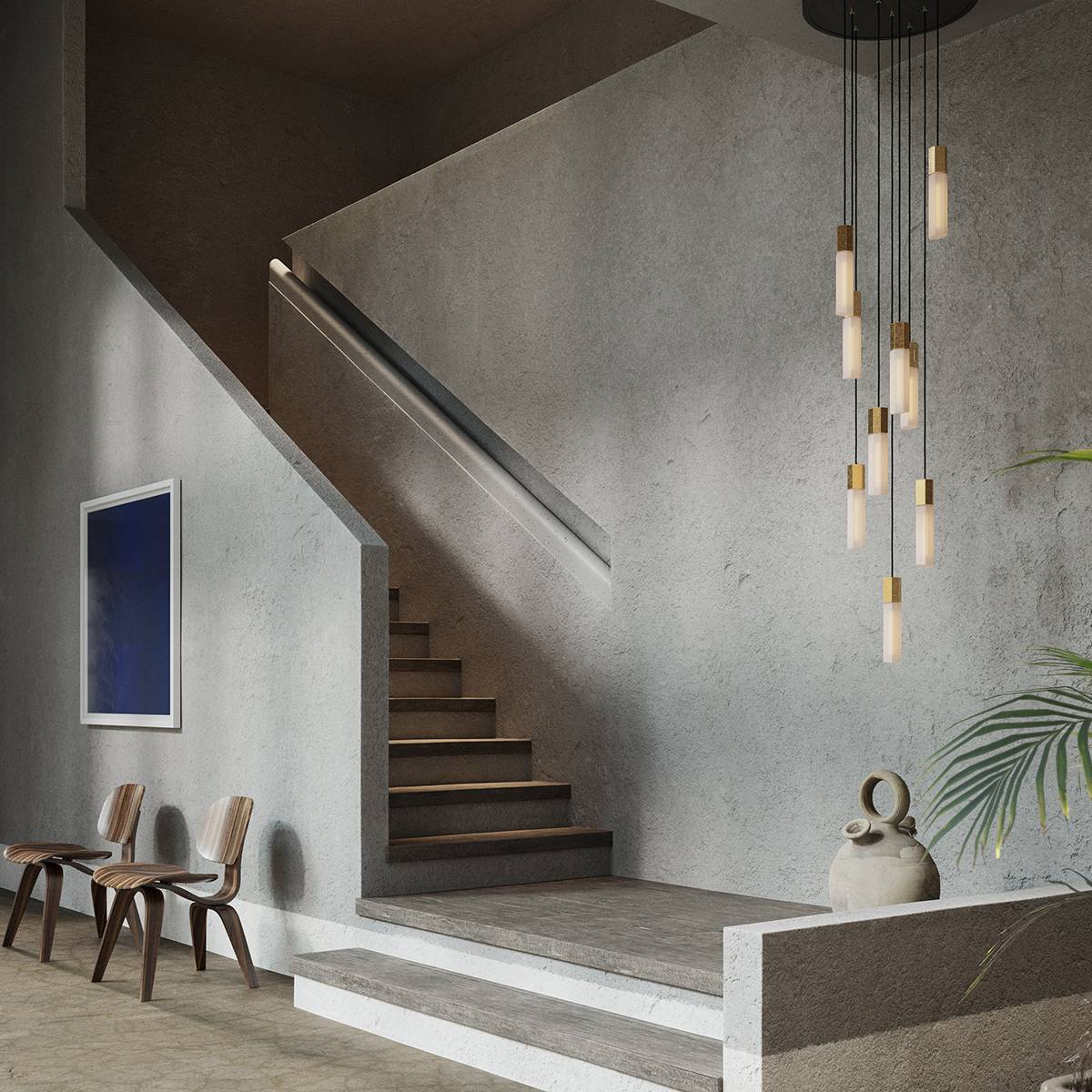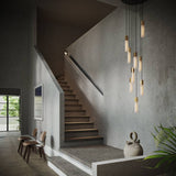 Tala clusters 9 of Basalt's individual pendants to create a dramatic statement light that will transform any large interior space. Resembling volcanic formations, each hexagonal light is fashioned from sand-casted brass or stainless with a raspy texture that contrasts with the polished metal end surface. With dimmable LED technology, each of the mouth-blown translucent glass bulbs emits a wonderful ambient glow in the beautifully sequenced array.