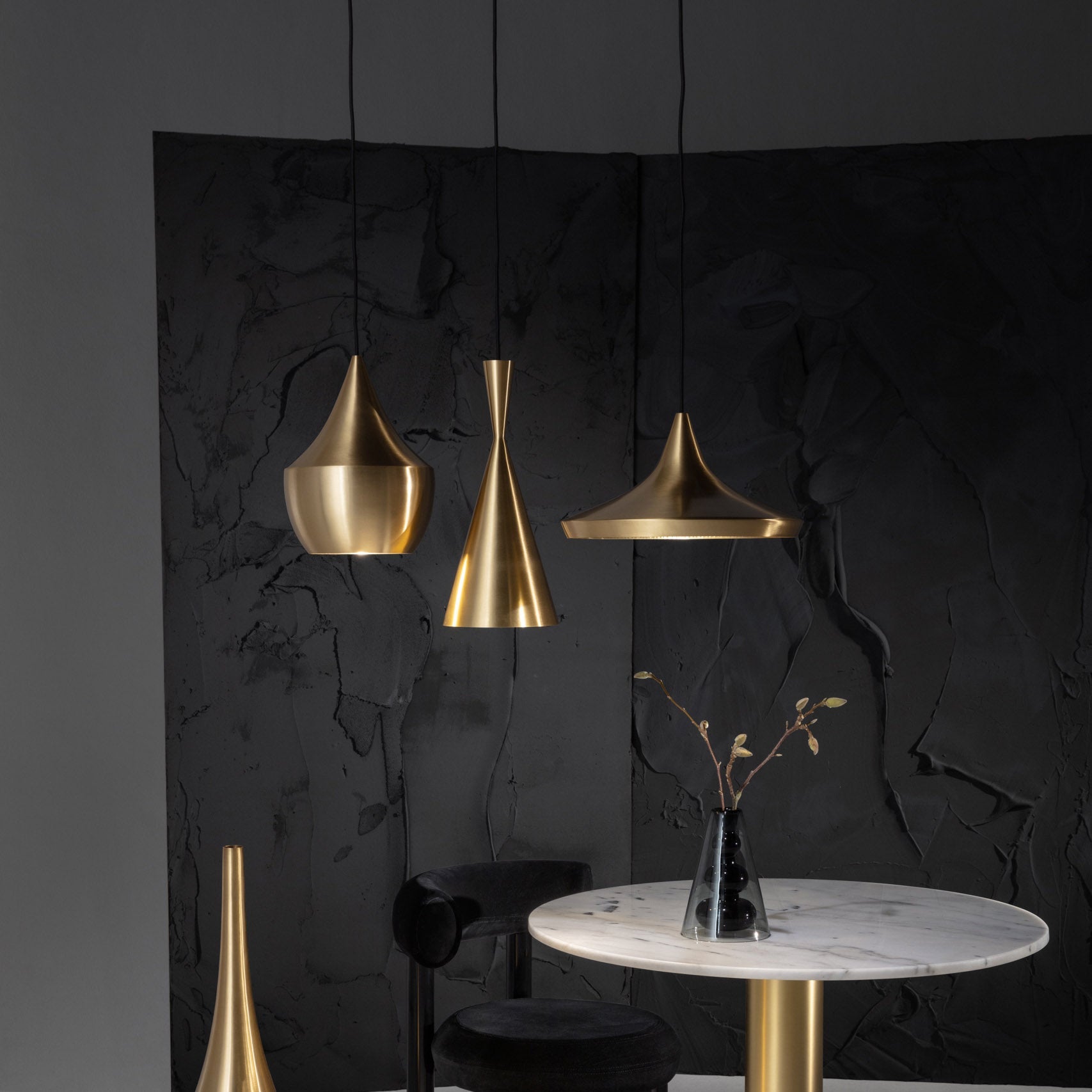 Beat Fat is the filled-out version of British designer Tom Dixon's unique series of pendant lights. Originally conceived during a field trip to India with his Royal College of Art students, the shapes are based on traditional brass cooking pots and water vessels. Using the same time-honored techniques, the lamps are spun and hand-beaten by skilled craftsmen from Moradabad in Northern India. But the technology is pure 21st Century, utilizing an LED light source. The firm Tom Dixon, established in 2002 by the renowned designer and his partner David Begg, encompasses everything from chairs to fragrance as well as a deep dive into lighting. Tom has been recognized with OBE honors and his work sits in museums across the globe including London's Victoria and Albert, New York's Museum of Modern Art and Paris' Centre Georges Pompidou.