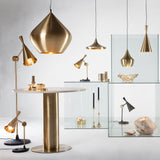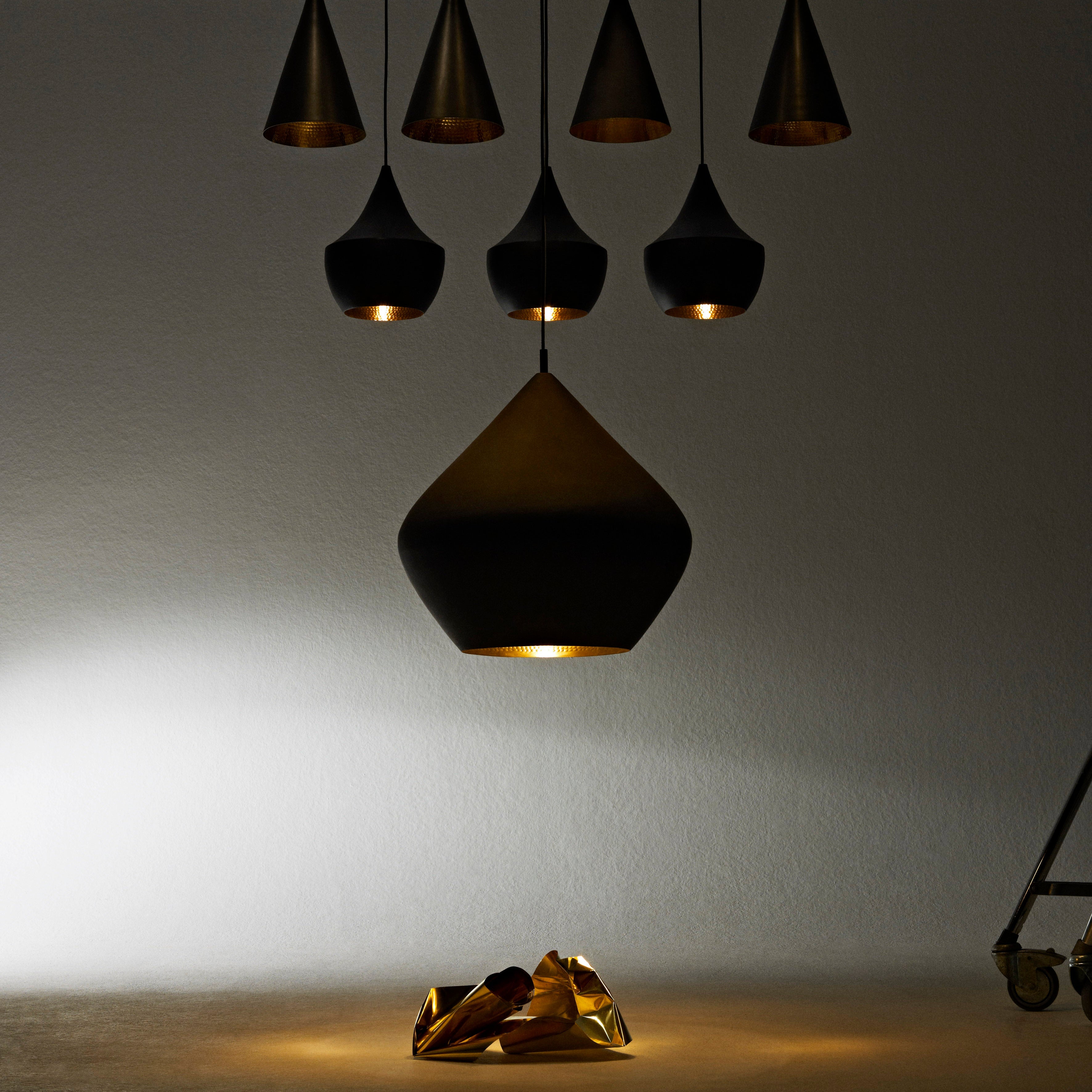 Beat Stout throws a attractive curve into British designer Tom Dixon's lineup of pendant lights. Originally conceived during a field trip to India with his Royal College of Art students, the shapes are based on traditional brass cooking pots and water vessels. Using the same time-honored techniques, the lamps are spun and hand-beaten by skilled craftsmen from Moradabad in Northern India. But the technology is pure 21st Century, utilizing an LED light source. The firm Tom Dixon, established in 2002 by the renowned designer and his partner David Begg, encompasses everything from chairs to fragrance as well as a deep dive into lighting. Tom has been recognized with OBE honors and his work sits in museums across the globe including London's Victoria and Albert, New York's Museum of Modern Art and Paris' Centre Georges Pompidou.