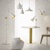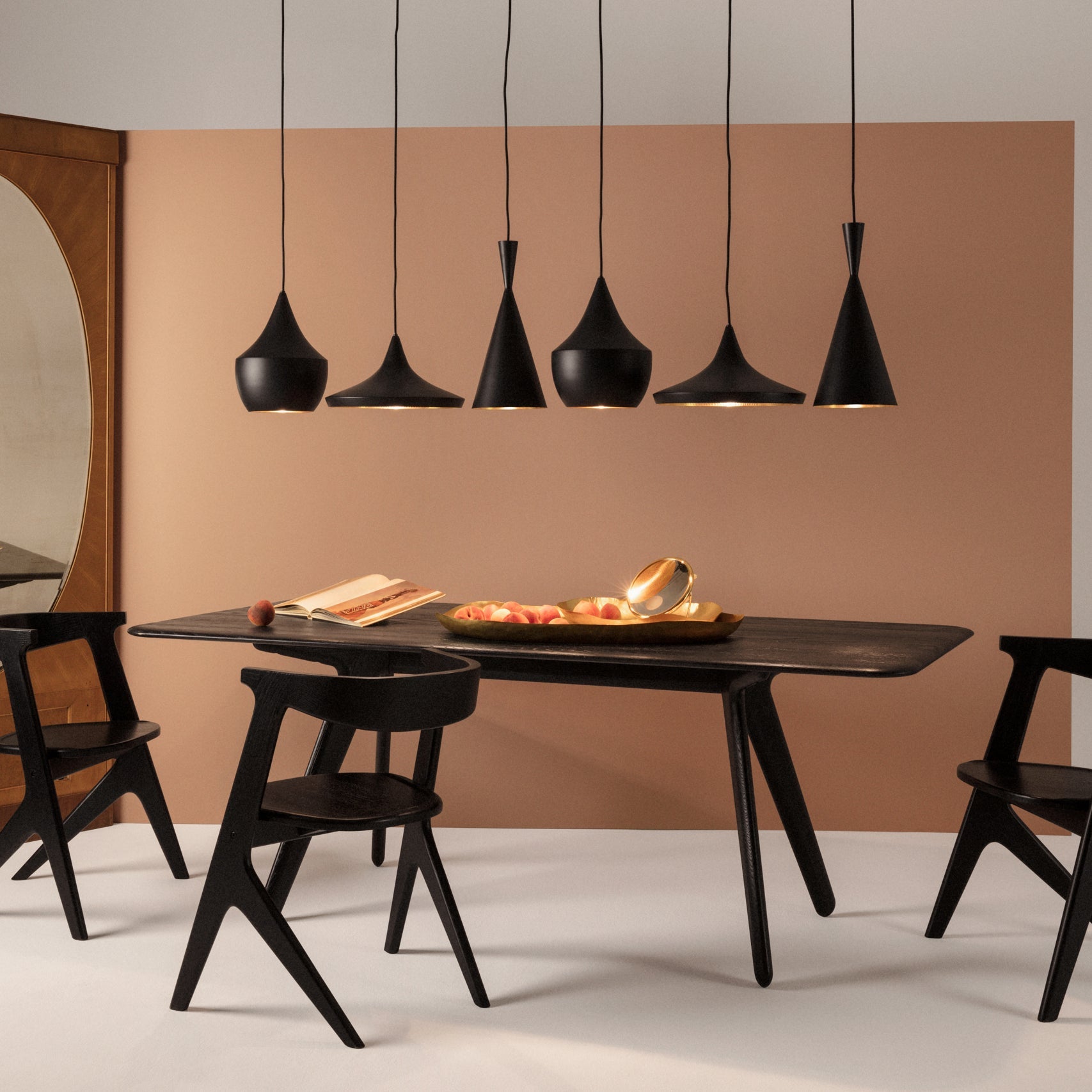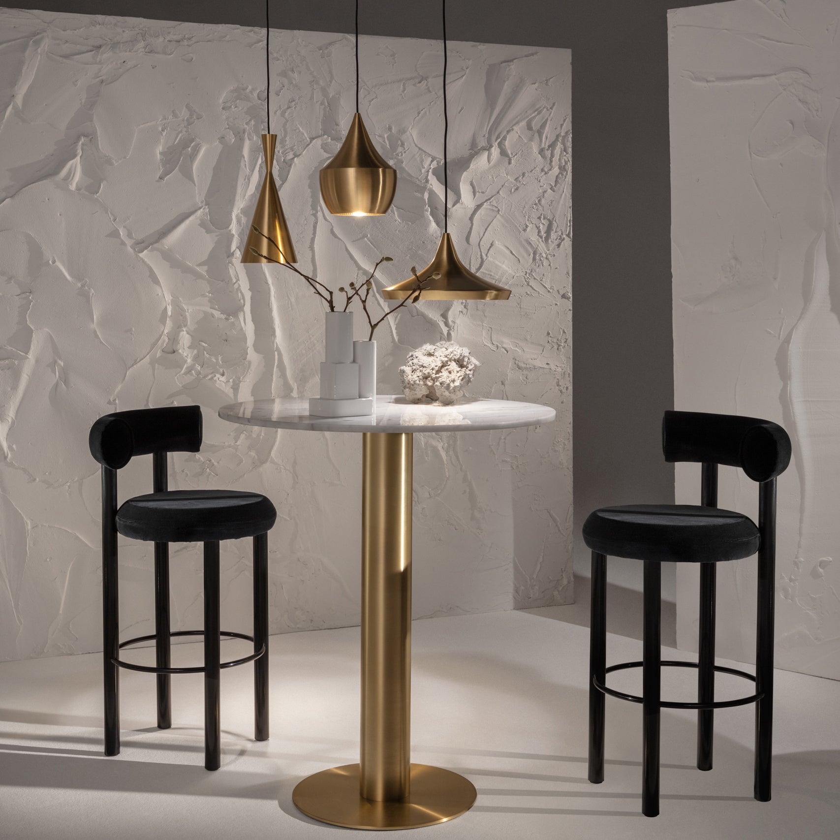 And the Beat goes on-with the Beat Wide variation in British designer Tom Dixon's unique series of pendant lights. Originally conceived during a field trip to India with his Royal College of Art students, the shapes are based on traditional brass cooking pots and water vessels. Using the same time-honored techniques, the lamps are spun and hand-beaten by skilled craftsmen from Moradabad in Northern India. But the technology is pure 21st Century, utilizing an LED light source. The firm Tom Dixon, established in 2002 by the renowned designer and his partner David Begg, encompasses everything from chairs to fragrance as well as a deep dive into lighting. Tom has been recognized with OBE honors and his work sits in museums across the globe including London's Victoria and Albert, New York's Museum of Modern Art and Paris' Centre Georges Pompidou.