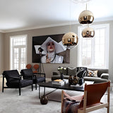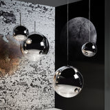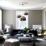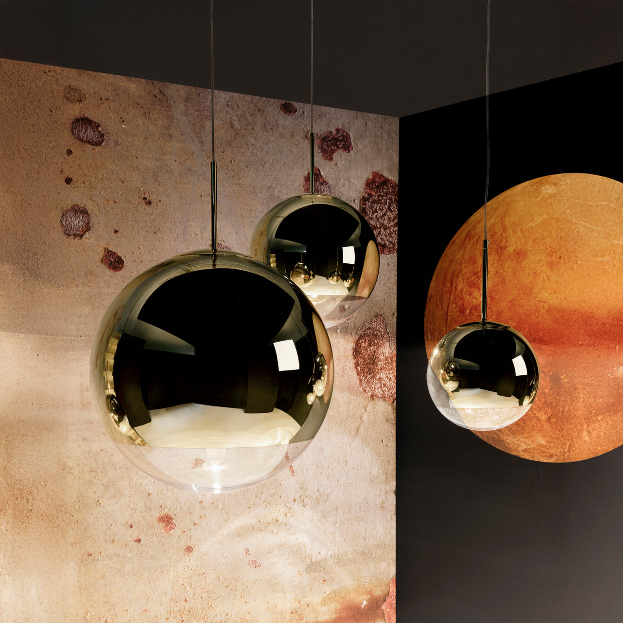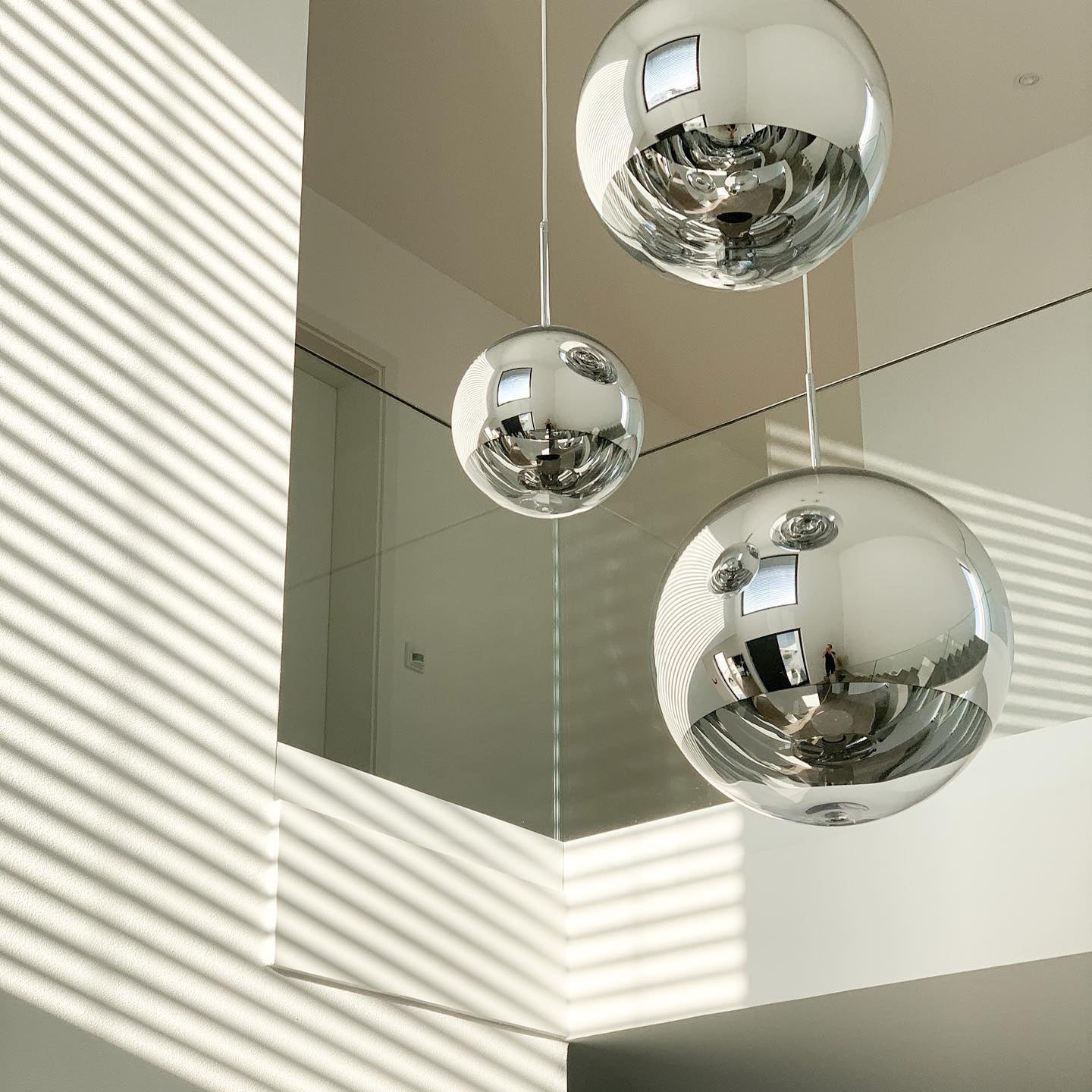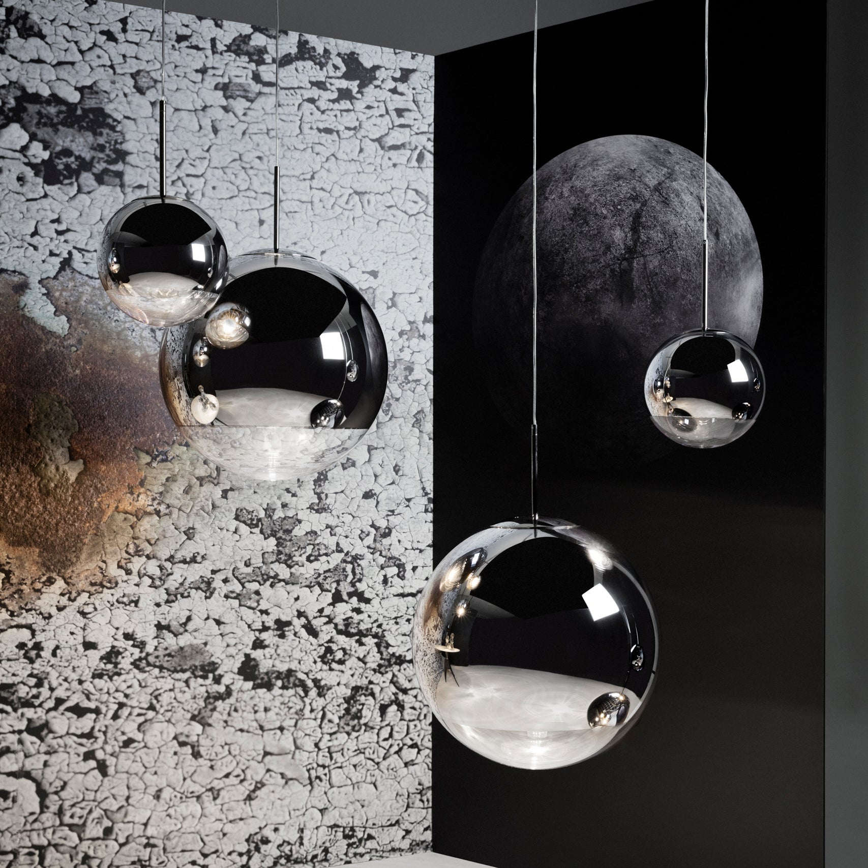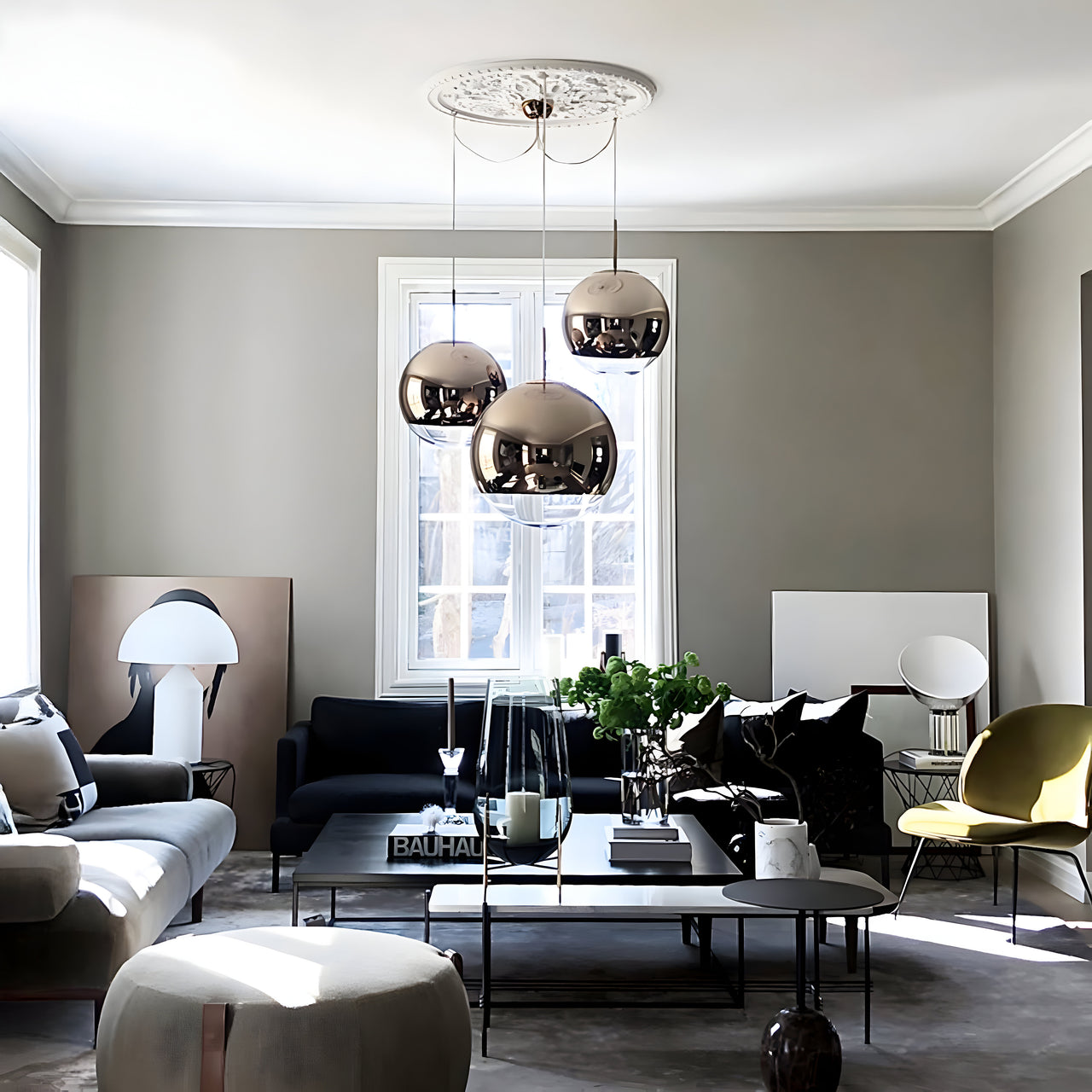 A trio of reflective spheres suspended from a circular canopy forms the Mirror Ball Pendant System – Trio, creating a striking focal point in any setting. Each globe is made from blow-molded polycarbonate and vacuum metallized on the interior, producing a mirrored surface that reflects its surroundings while softly diffusing light. Integrated LED modules offer energy-efficient, dimmable illumination. Available in chrome or gold finishes, the graduated arrangement adds depth and sculptural presence.