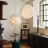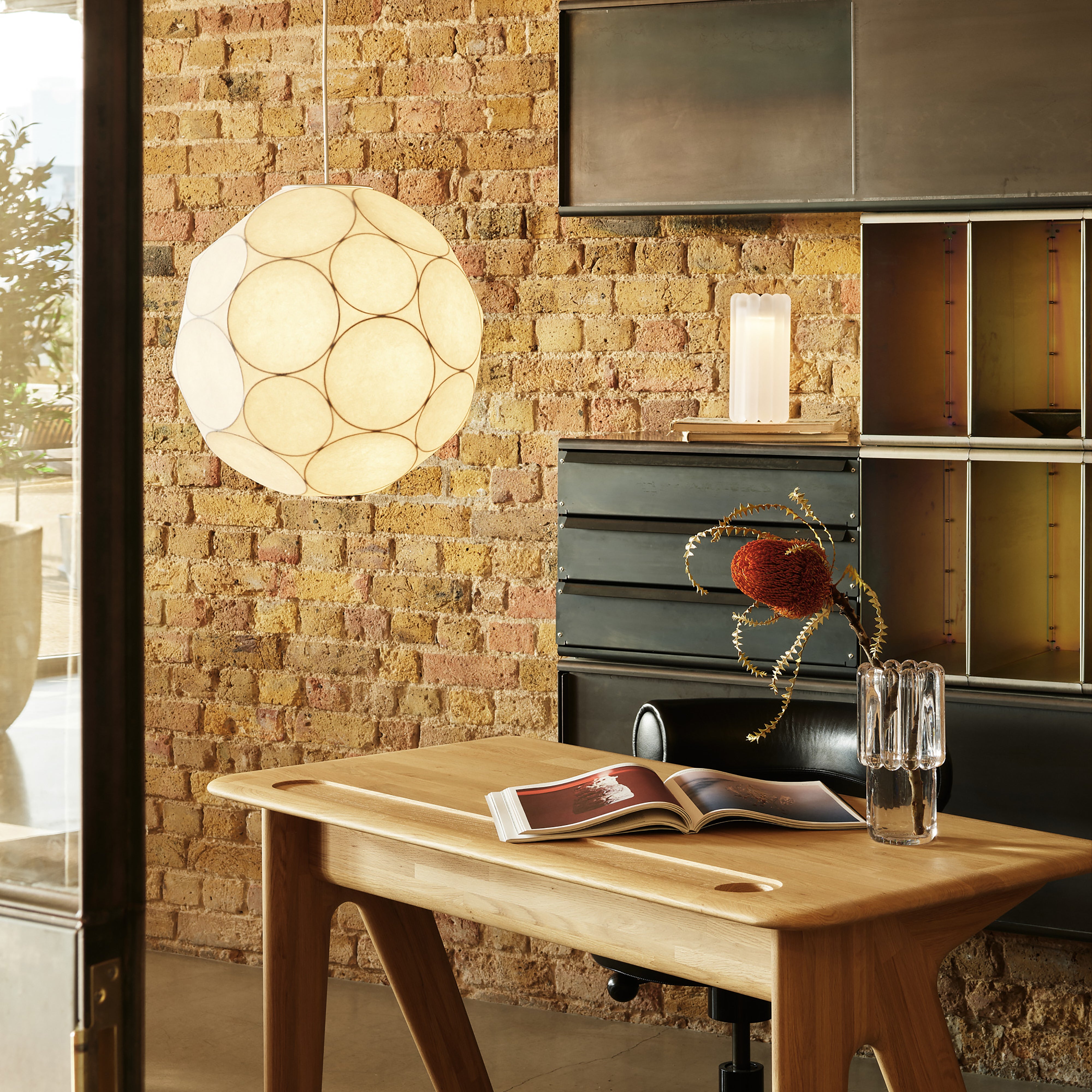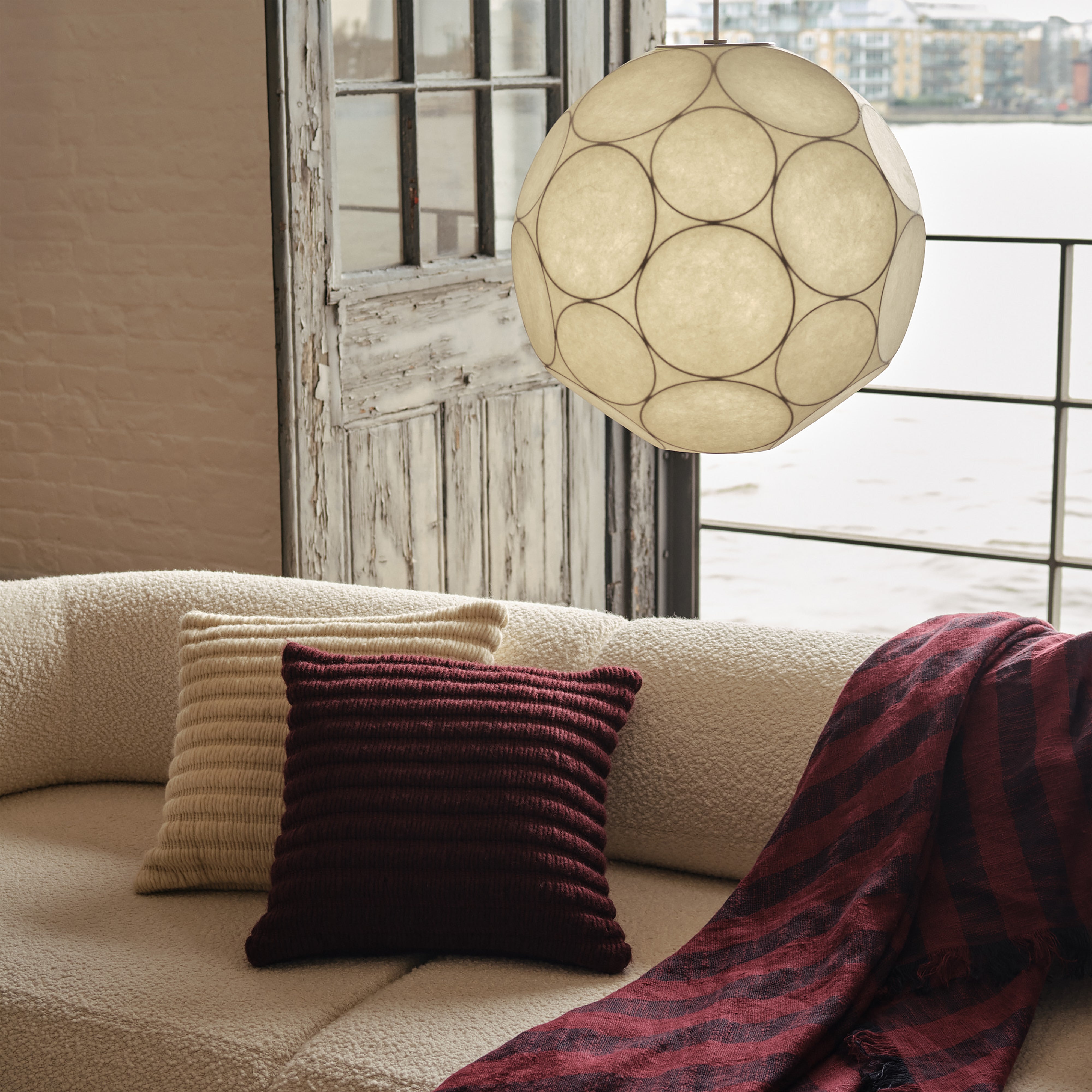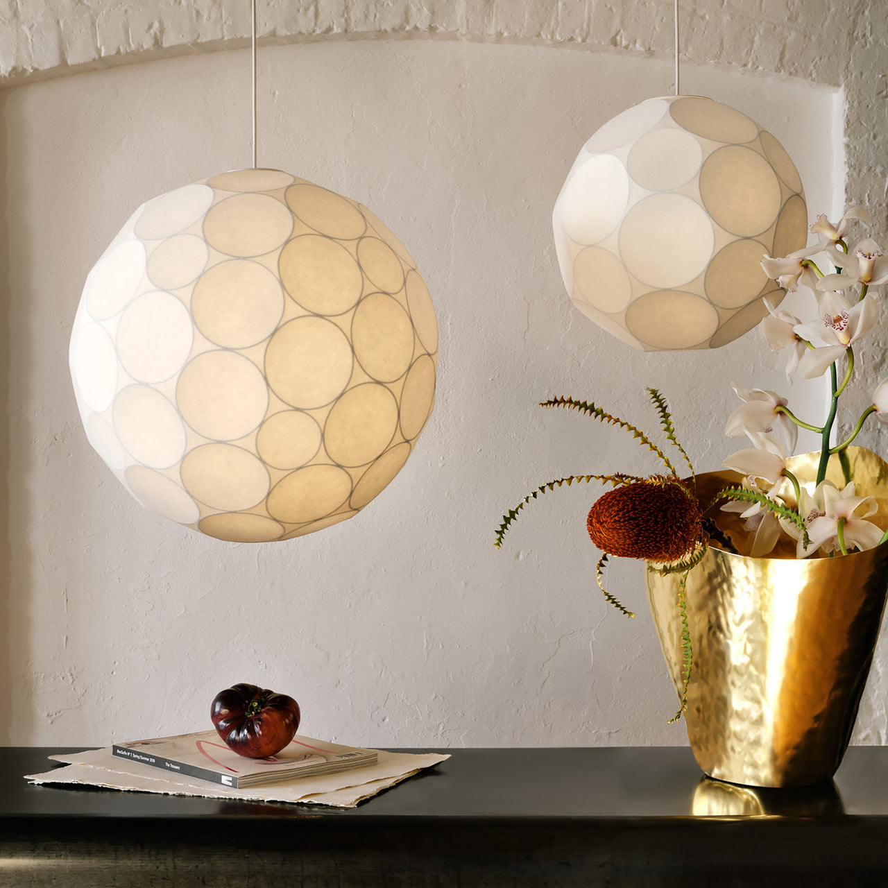 The Soft Pendant transforms a simple spherical form into a light sculpture that feels both weightless and atmospheric. Its structure consists of a fine steel framework coated in a translucent layer of sprayed thermoplastic polyurethane (TPU), creating a soft, cocoon-like shell that gently diffuses light in all directions. When unlit, the surface has a matte, tactile quality, and when illuminated, it glows with a calm, lantern-like warmth that fills the space without glare. Available in two sizes.