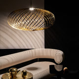 Pliant ribbons of stainless steel fan out around a custom Tom Dixon LED ring in this multiway pendant. Spring's airy formation can be adjusted to a variety of shapes—a flatter one that's reminiscent of a spirograph drawing, a "flying-saucer" configuration or a fuller silhouette akin to a pumpkin. Plated in a warm brass finish and available in 3 sizes, the spiral design allows the voluminous shade to be easily flat-packed for moving.