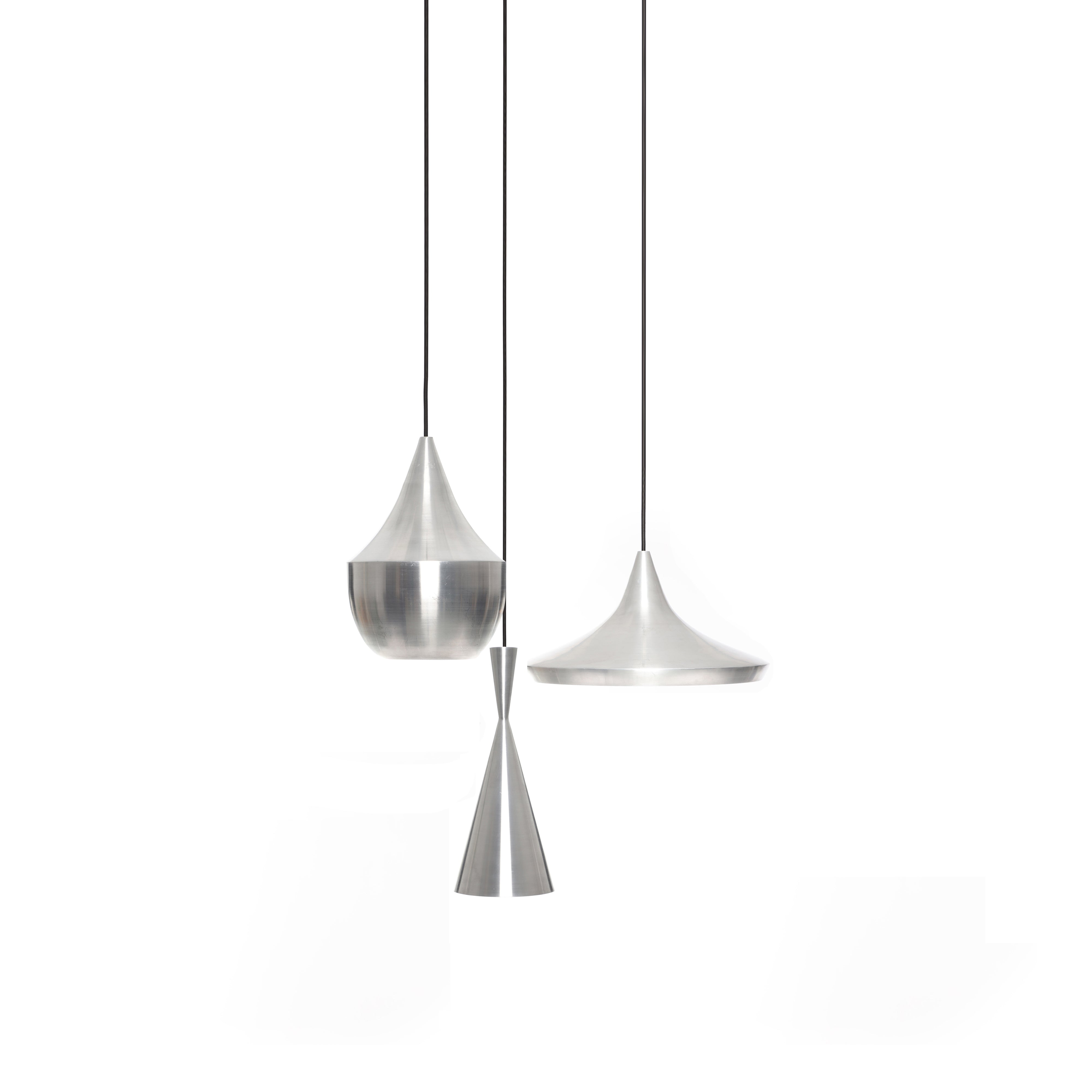 The Unbeaten Trio System Pendant features three unique pendant shapes—Fat, Wide, and Tall—suspended from a single canopy. Each piece is handcrafted from hand-spun and hand-brushed aluminum, showcasing the natural texture and finish of the material. Integrated LED modules provide bright, energy-efficient lighting with dimmable functionality. This system creates a bold focal point, fitting well across a range of spaces.