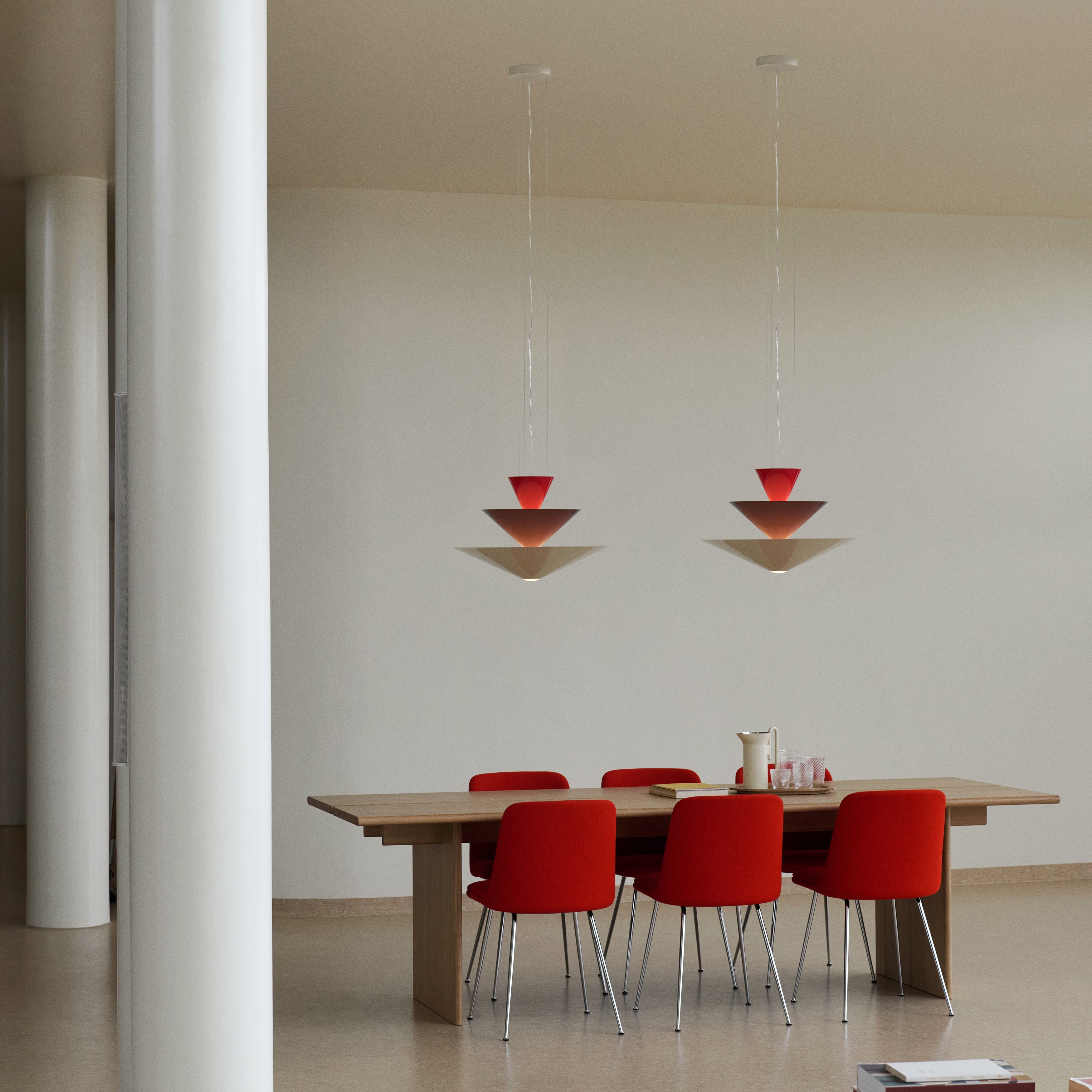 This chandelier features bold tiers of spun-aluminium cones that emit both upward and downward LED light. Available in two sizes (LN14 and LN15), it comes in two color combinations. The design draws inspiration from the traditions of Murano glass and references the geometric forms found in Gio Ponti’s Murano chandeliers. It includes fully integrated, dimmable LEDs with a warm 2600 K color temperature.