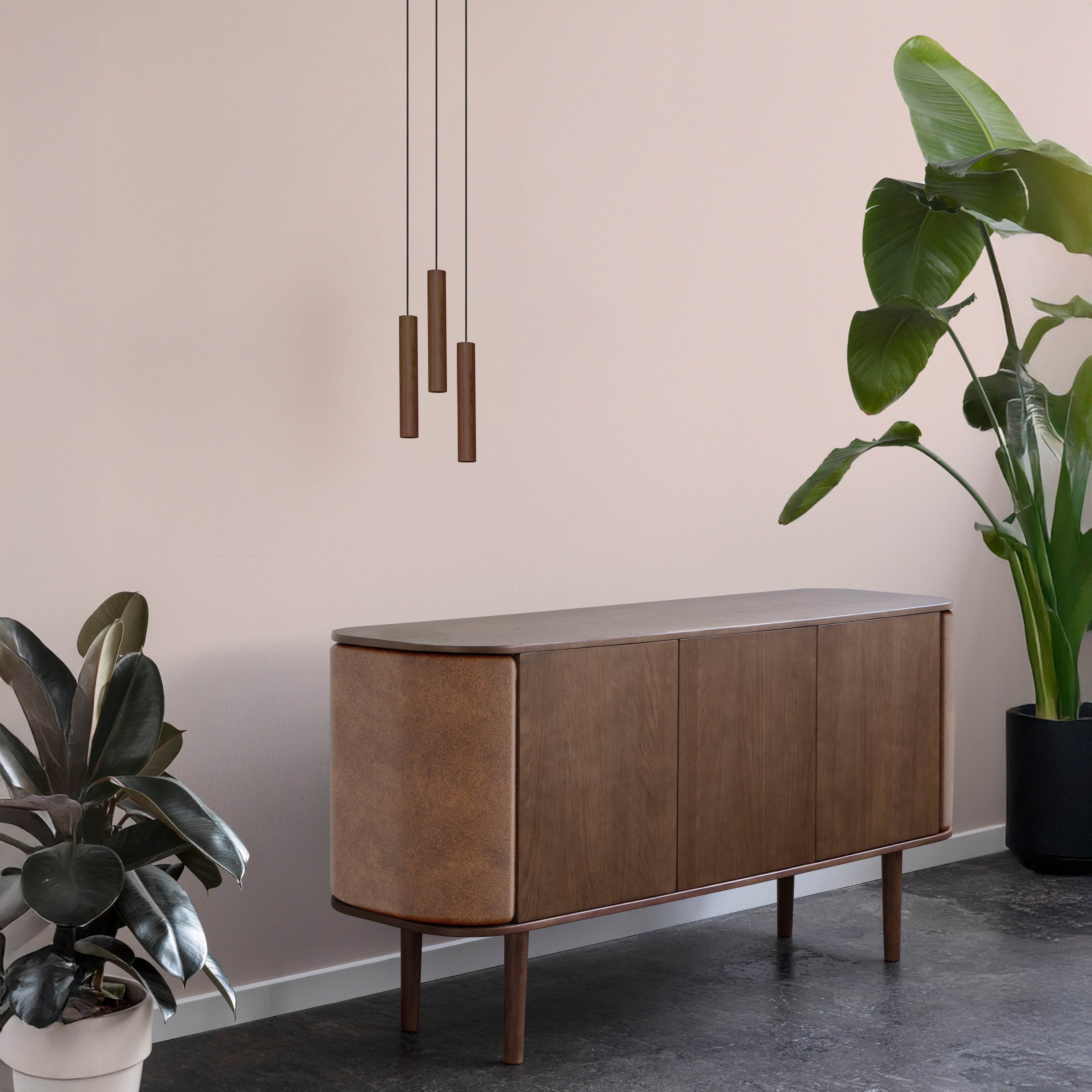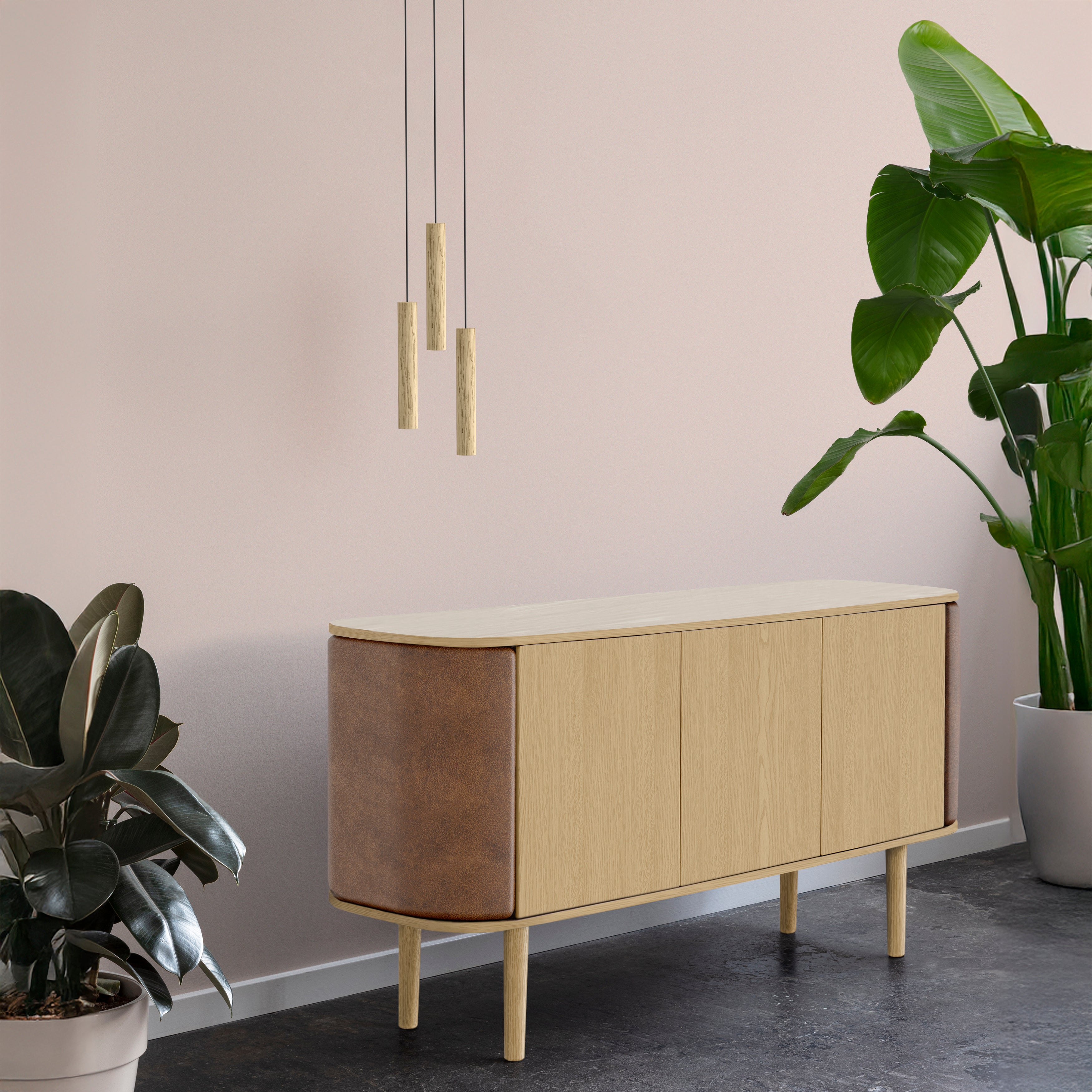 The Chimes Cluster 3 Pendant Lamp features three solid oak cylinders suspended from a black metal canopy, each containing a warm LED spotlight for precise lighting. Inspired by the vertical lines of trees in dense forests, this design brings a hint of Nordic nature indoors. The Chimes Cluster 3 is perfect for lighting dining areas, and kitchen islands, or adding a warm ambiance to living spaces.