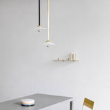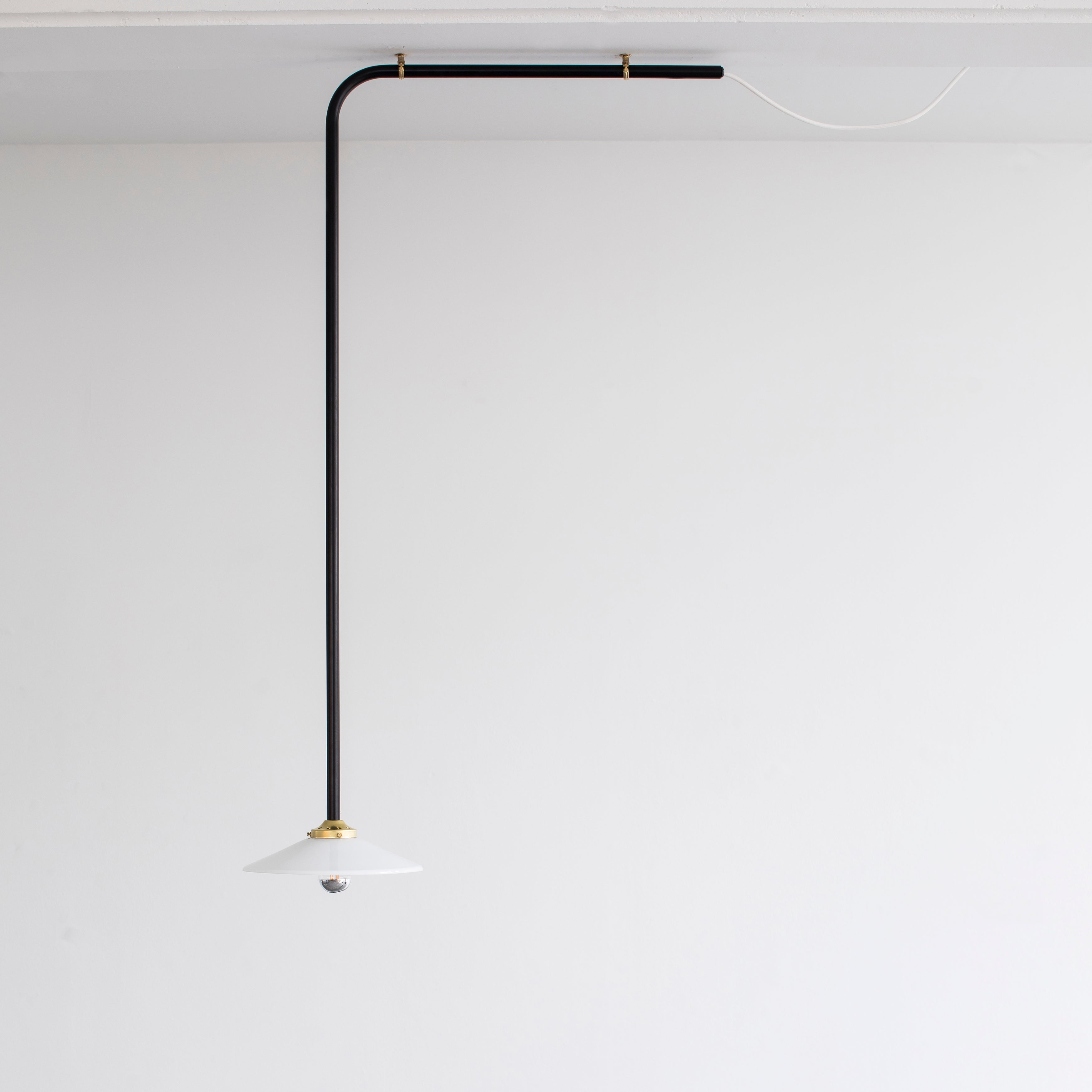 The versatile mid-range version of Fien Muller and Hannes Van Severen’s ceiling light has a moderate drop height apropos for a variety of settings. As graphic as a crisp line drawing, N°2 elevates its bent-metal tube structure with a lacquered finish in black or brass. The elemental glass shade replicates an original industrial model that the designers came upon in a flea market.