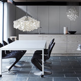 Statement-making with its "extra" proportions, this version of Verner Panton's 1964 Fun pendant is made for expansive dining tables and lofty environs. Five tiers of shimmering mother-of-pearl discs are arrayed from the circular chrome structure with its awesomely wide span. The shell-like shapes sway gently when there's a breeze and the quality of warmly refracted illumination is exceptional.