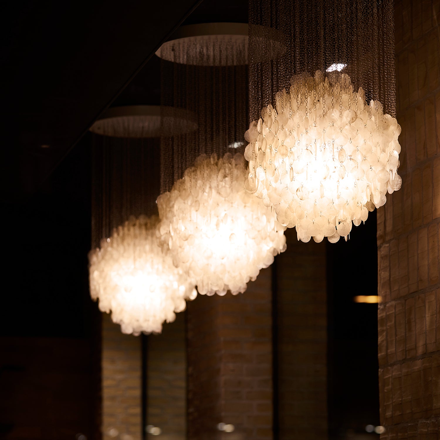 An outsize cluster of shimmering shell shapes will definitely turn heads in this Fun series pendant. Mounted on a lacquered wooden ceiling plate, the seashell discs are suspended on small-ring chains made of stainless steel. It’s a tour-de-force take on Danish icon Verner Panton’s 1964 design with its incomparable filtered illumination.