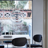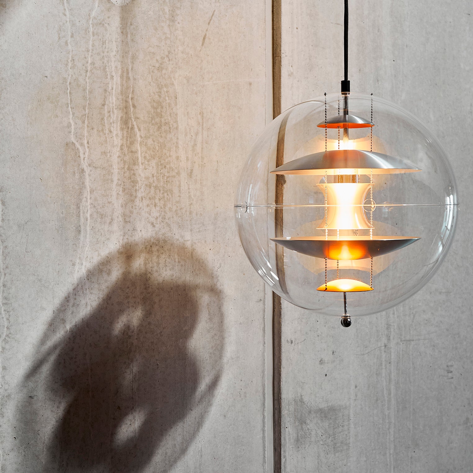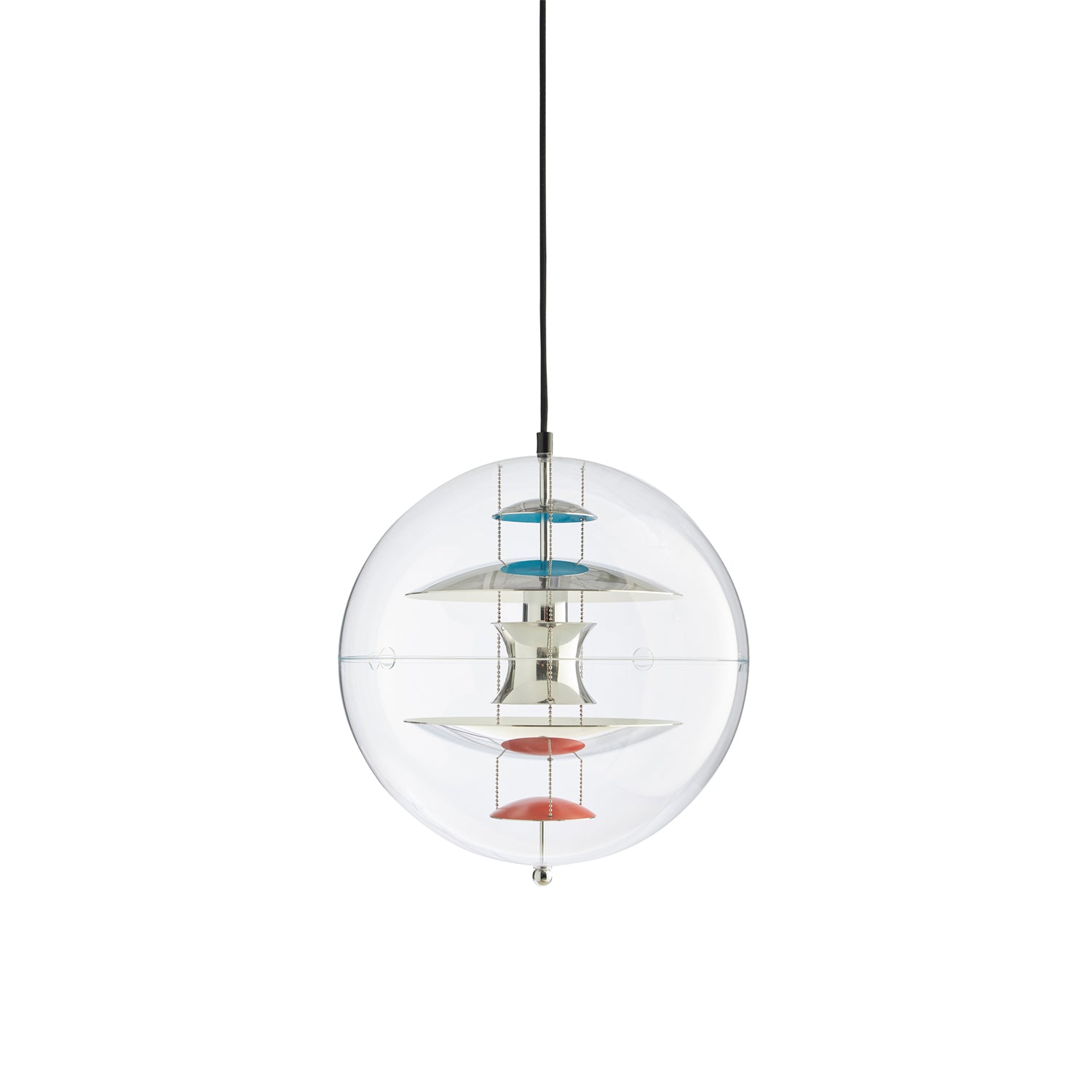 Danish icon Verner Panton’s trailblazing Space Age style reaches its peak with his circa 1969 pendant VP Globe. A clear acrylic sphere reveals chromium-plated reflectors suspended on thin chains and finished with colored accents. Available in a choice of sizes, Panton’s beau ideal of futuristic design transcends time and space in its continuing appeal.