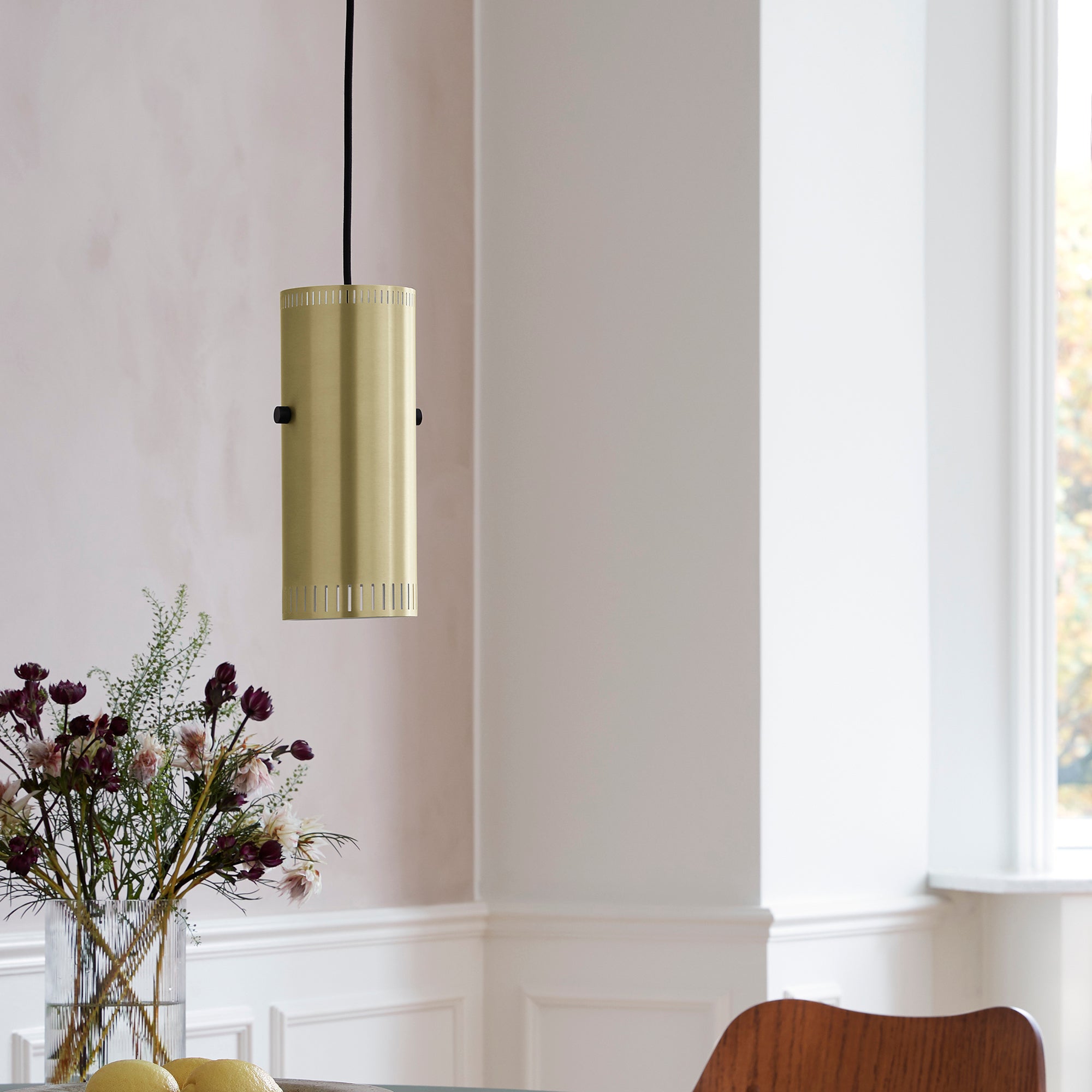 The Trombone Cylinder Pendant features a cylindrical metal shade with a white interior that reflects light effectively. Narrow vertical slits at both ends allow light to filter through, creating a distinctive illumination effect. Available in brushed brass or brushed aluminum finishes, enhancing various interior settings.