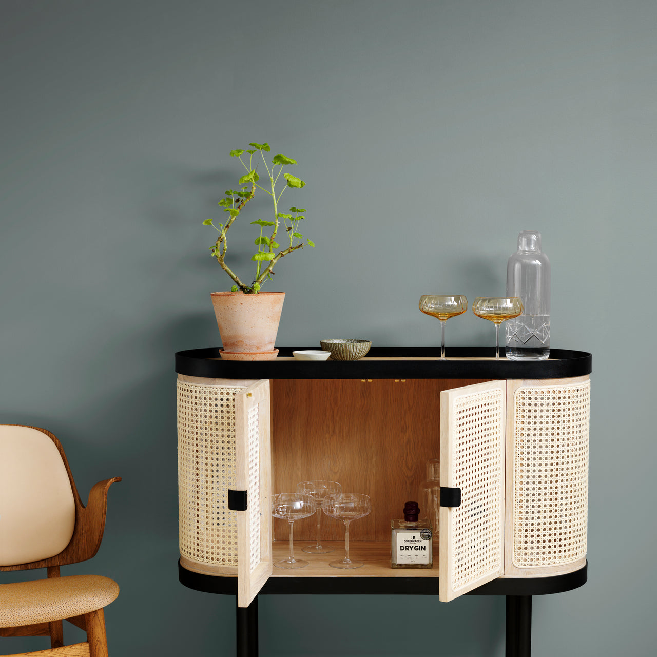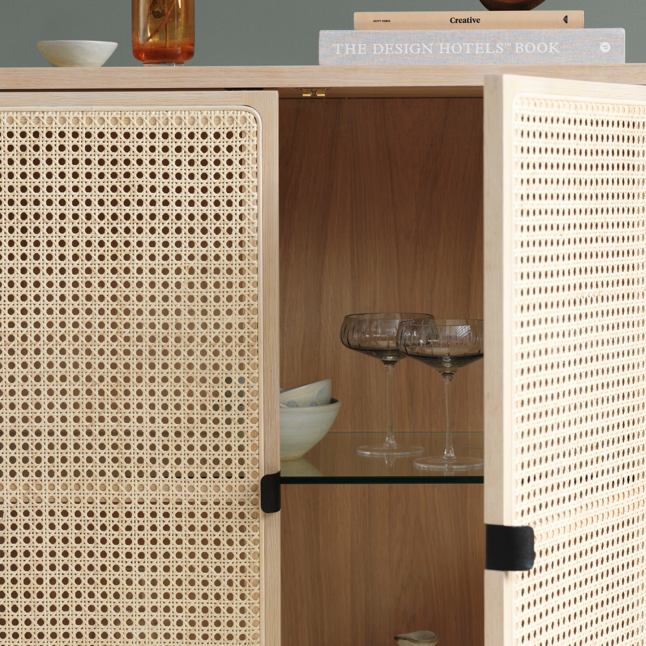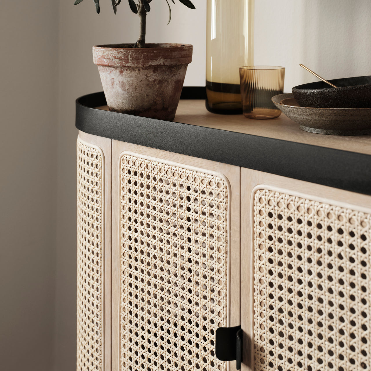 Warm Nordic adds an elegant bar cabinet in natural wood and wicker with a characteristic black frame to its Be My Guest range that also functions as decorative storage in a living room, office or bedroom. Harmonious round corners and the translucent materiality of woven French cane combined with oak ensure a warm radiance while the inky metal frame brings bracing contrast.