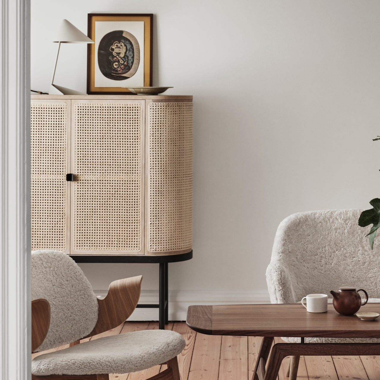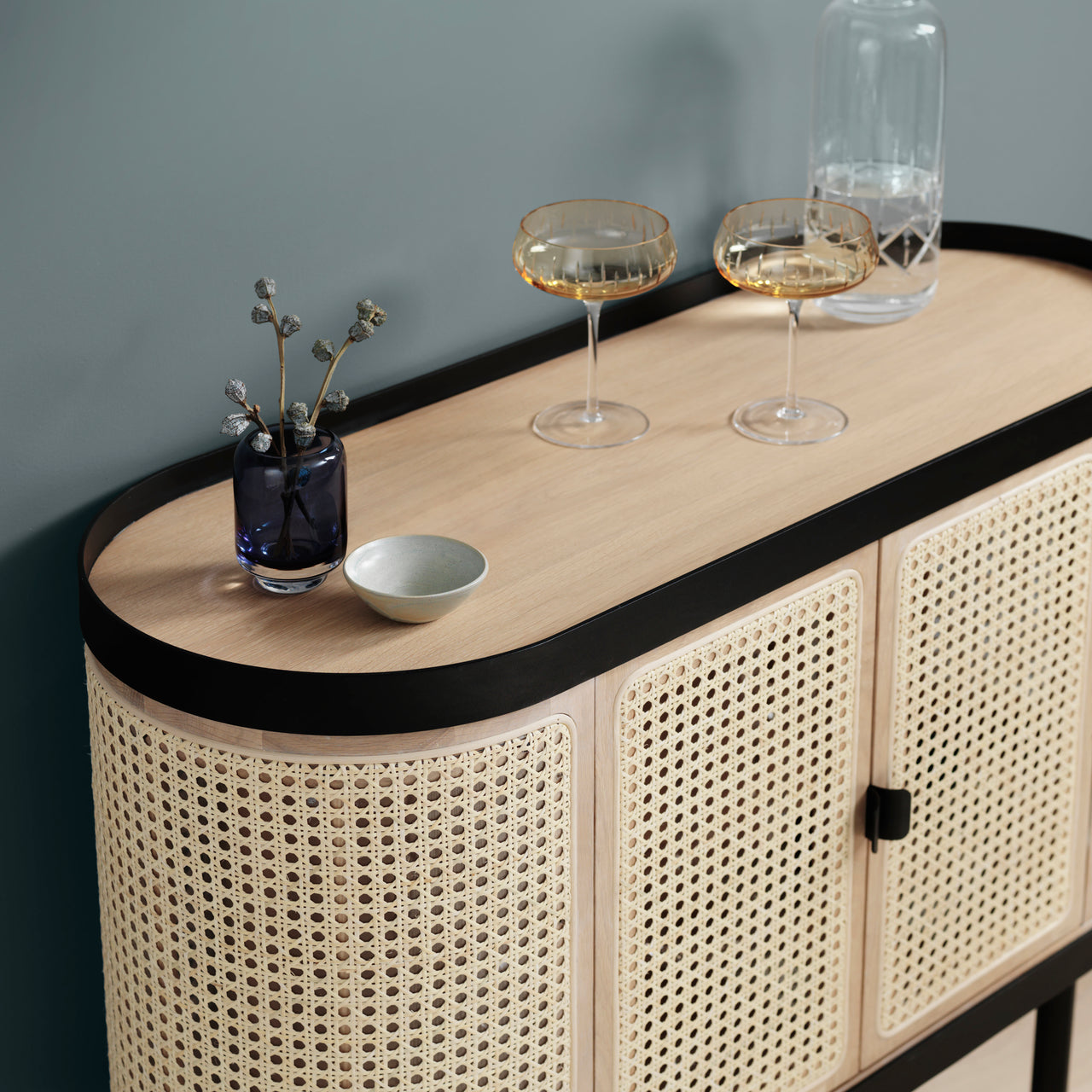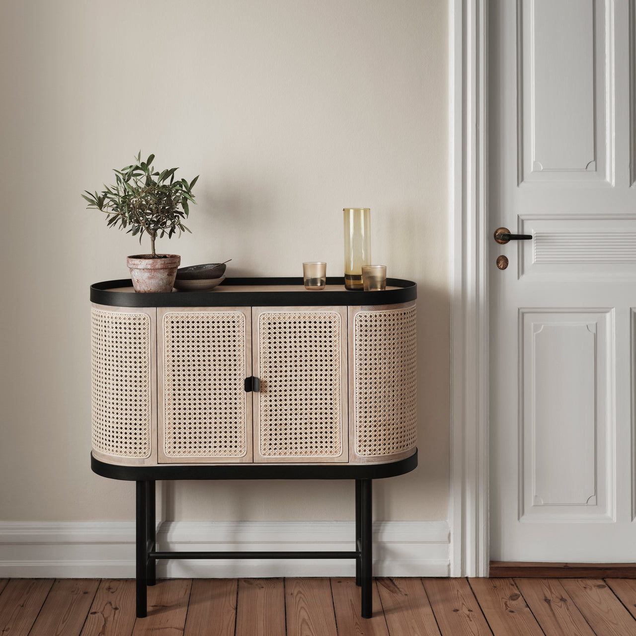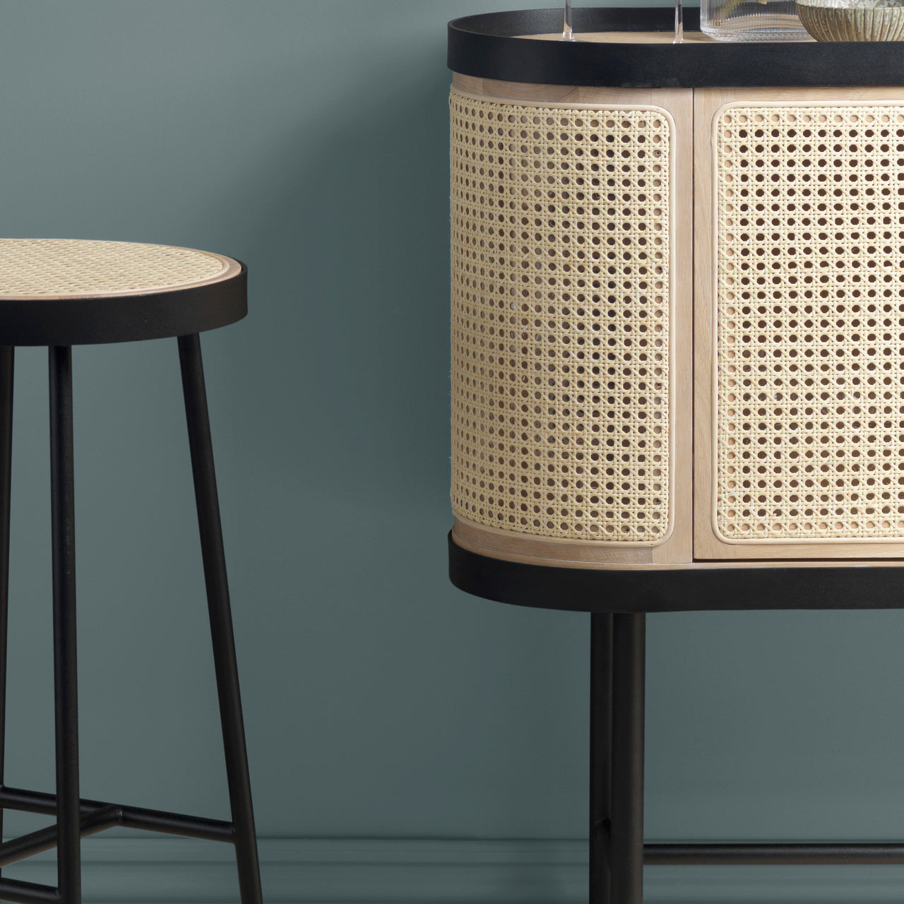 Warm Nordic adds an elegant bar cabinet in natural wood and wicker with a characteristic black frame to its Be My Guest range that also functions as decorative storage in a living room, office or bedroom. Harmonious round corners and the translucent materiality of woven French cane combined with oak ensure a warm radiance while the inky metal frame brings bracing contrast.