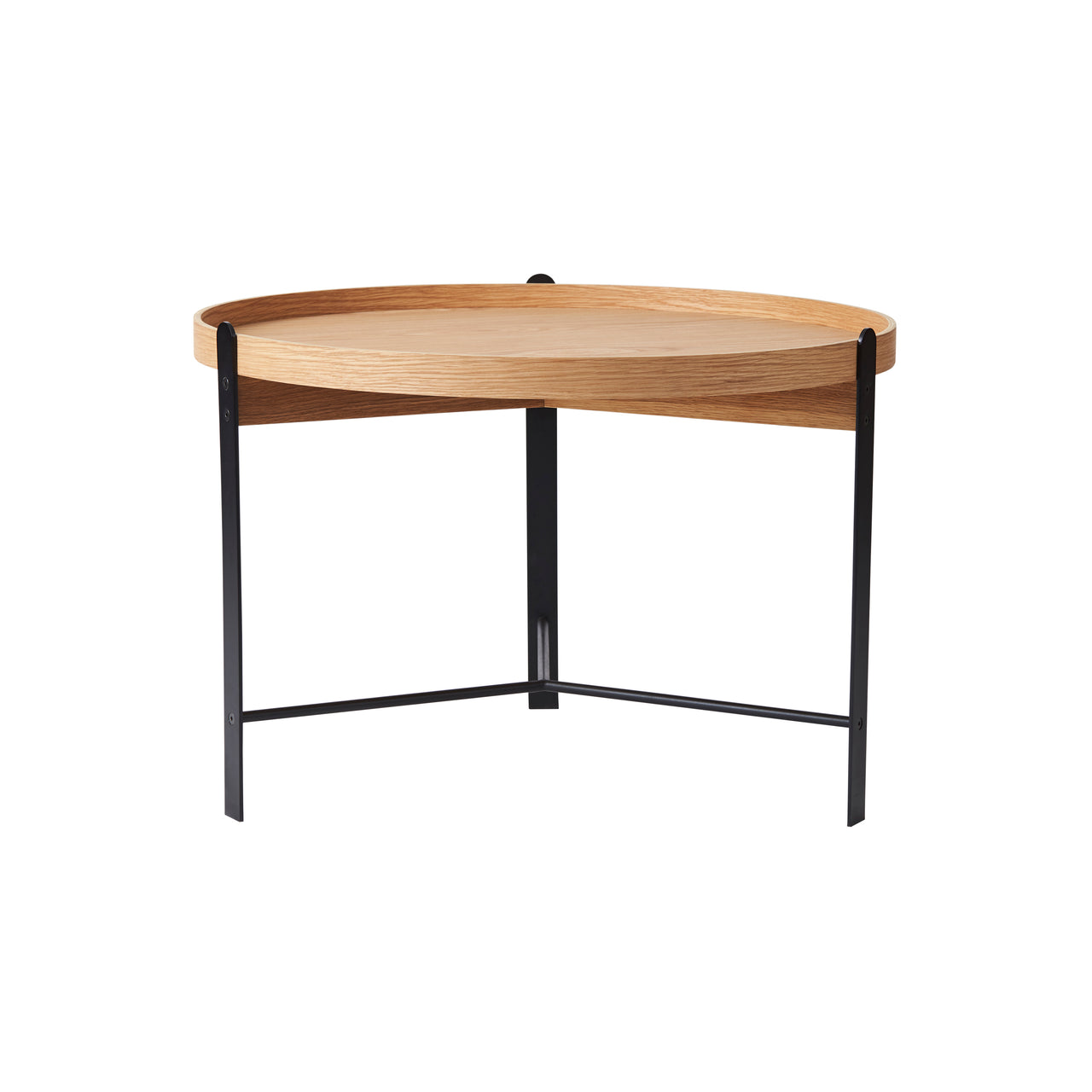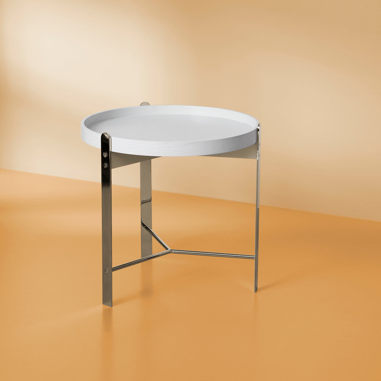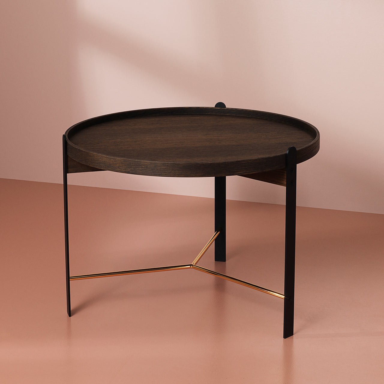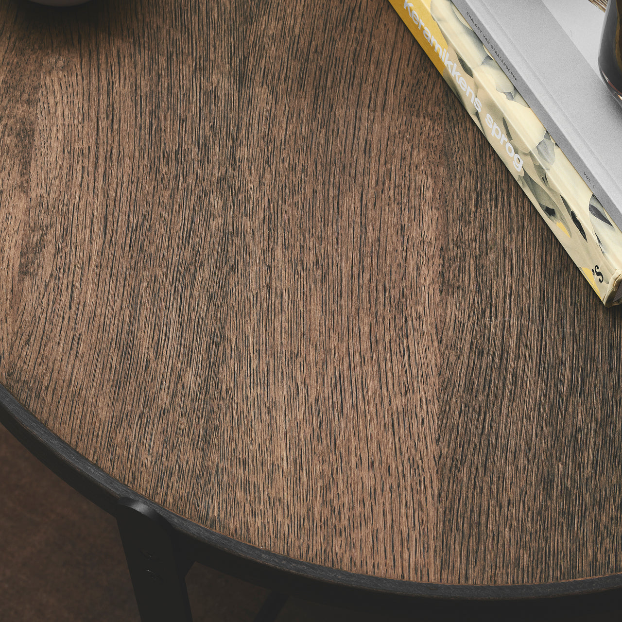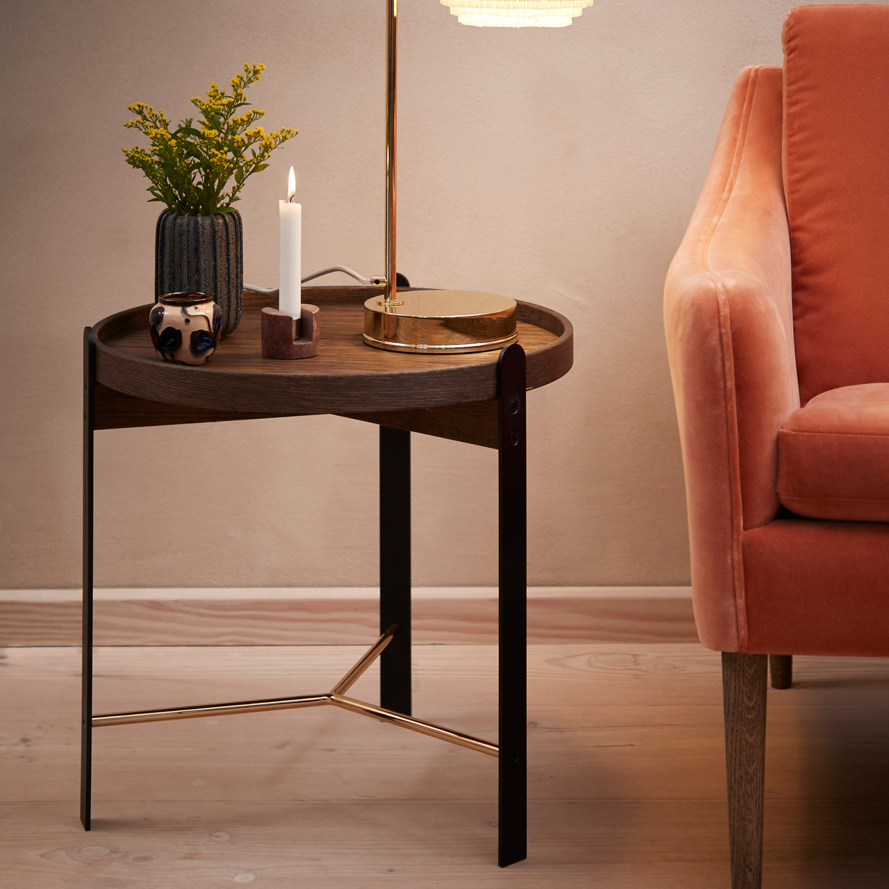 Charlotte Høncke brings a stylish twist to Scandi style with Compose, a round occasional table devised in a unique combination of warm woodgrain and sleek metal. In its 2 sizes—the smaller also doubling as a side or bedside table—Warm Nordic offers several intriguing oak surface options, with the 3-legged frame in complementary chrome, brass or lacquer finishes.