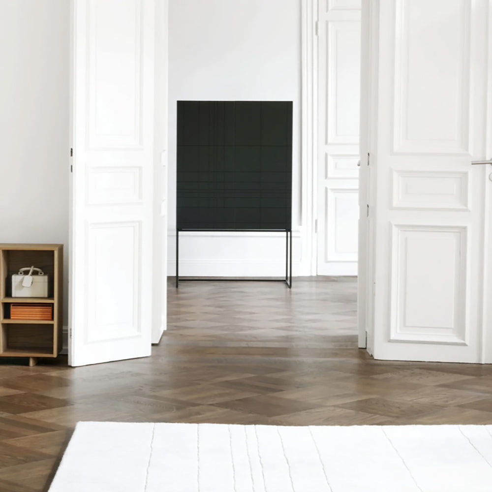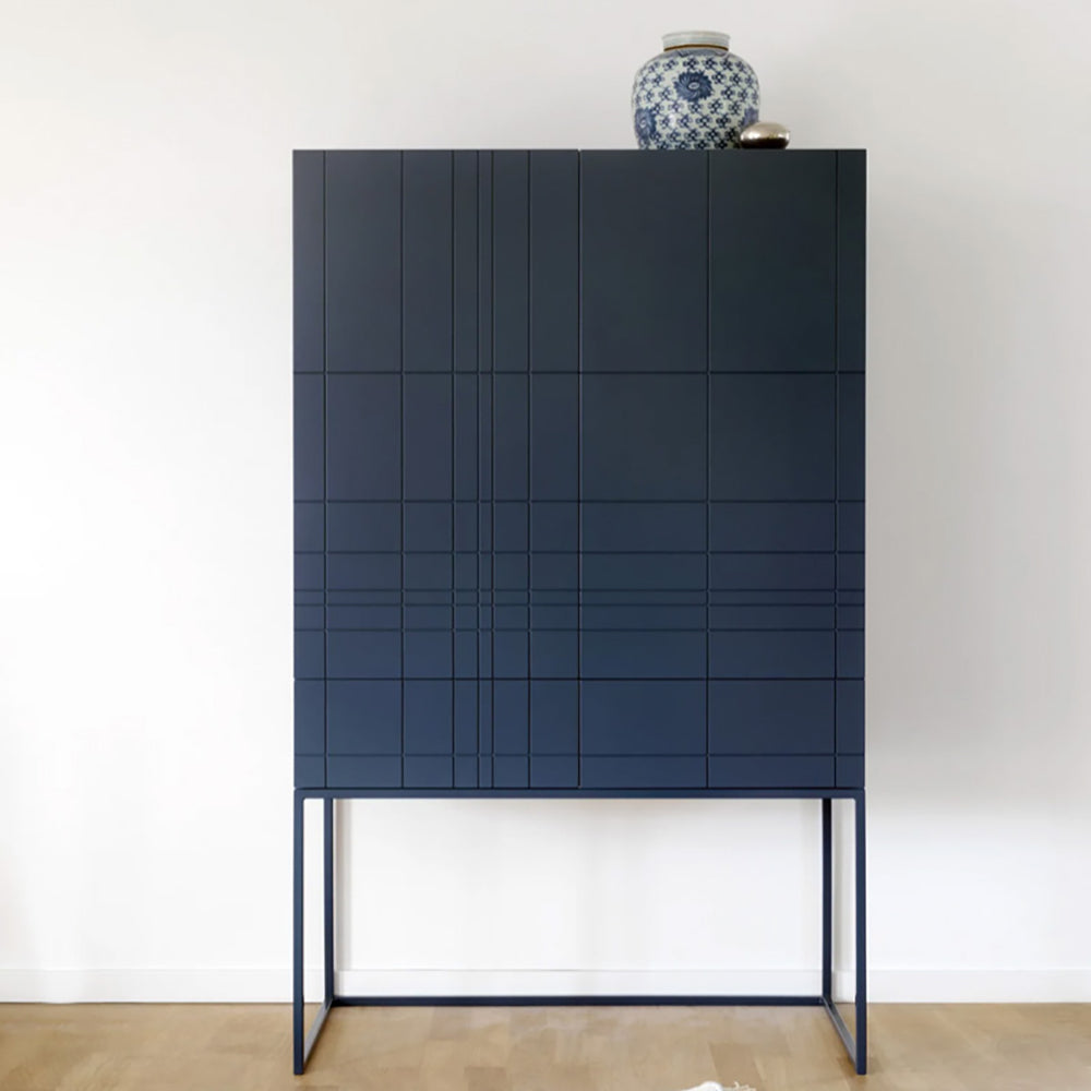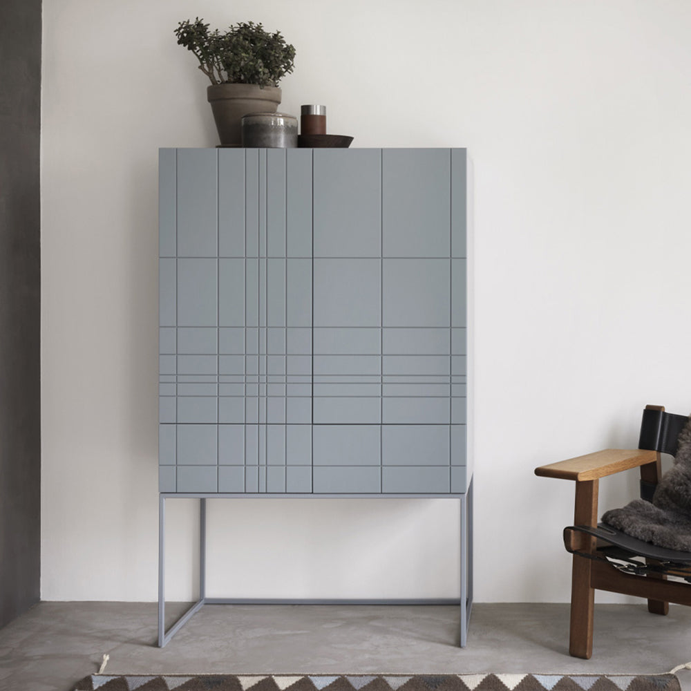 Swedish maker Asplund adds a vertically oriented cabinet to its striking Kilt Light series by Claesson Koivisto Rune. Concealing generous storage behind 2 doors, 90 also adds 2 side-by-side drawers at the bottom. Expressly made in Sweden, the lacquered MDF unit is available in a range of Nordic hues with a geometric pattern that riffs on a classic tartan. The powder-coated metal base is available either to match or in a contrasting color.