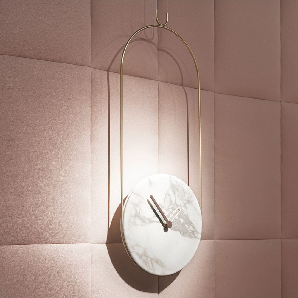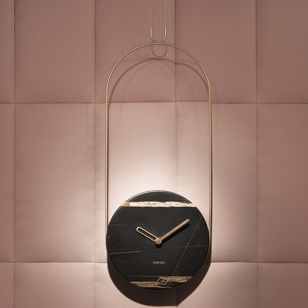 Suspended in a delicately proportioned balance, Colgante features a slim oval that frames the wall clock’s face fashioned in solid walnut wood or genuine marble in a choice of luxurious varieties. Handmade in Spain, Nomon’s timepieces offer the finish of a fine piece of furniture and are precision-powered by a German-origin quartz