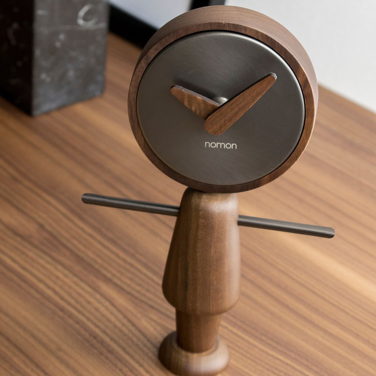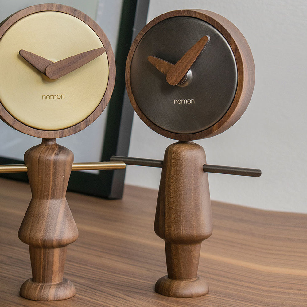 Whimsically shaped like a stick figure, Nene stands tall on a night table or sideboard in Nomon’s refined mix of solid oak or walnut with either brass or graphite accents. Handmade in Spain, the table clock is powered by a German UTS mechanism, combining everyday luxury with reliable functionality.