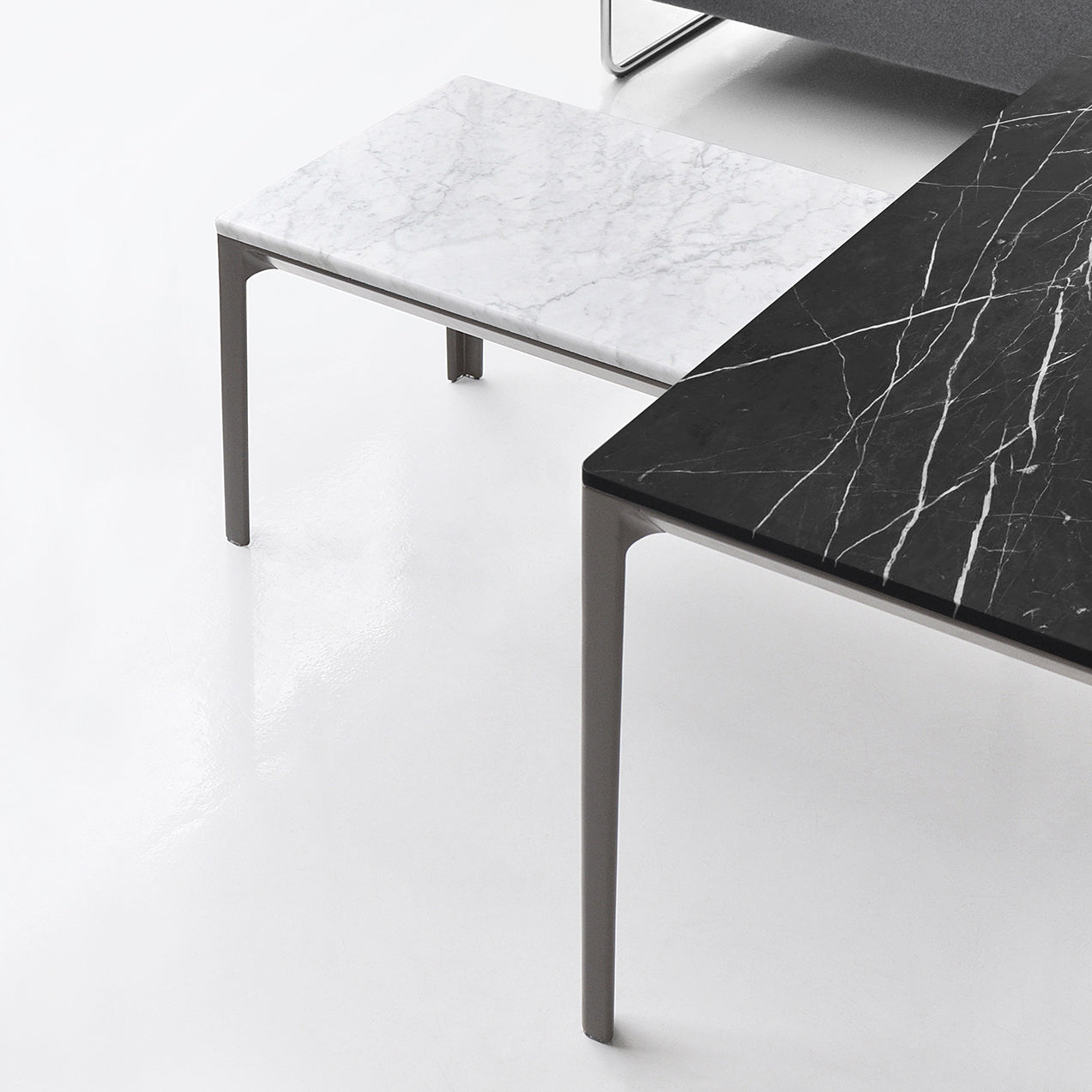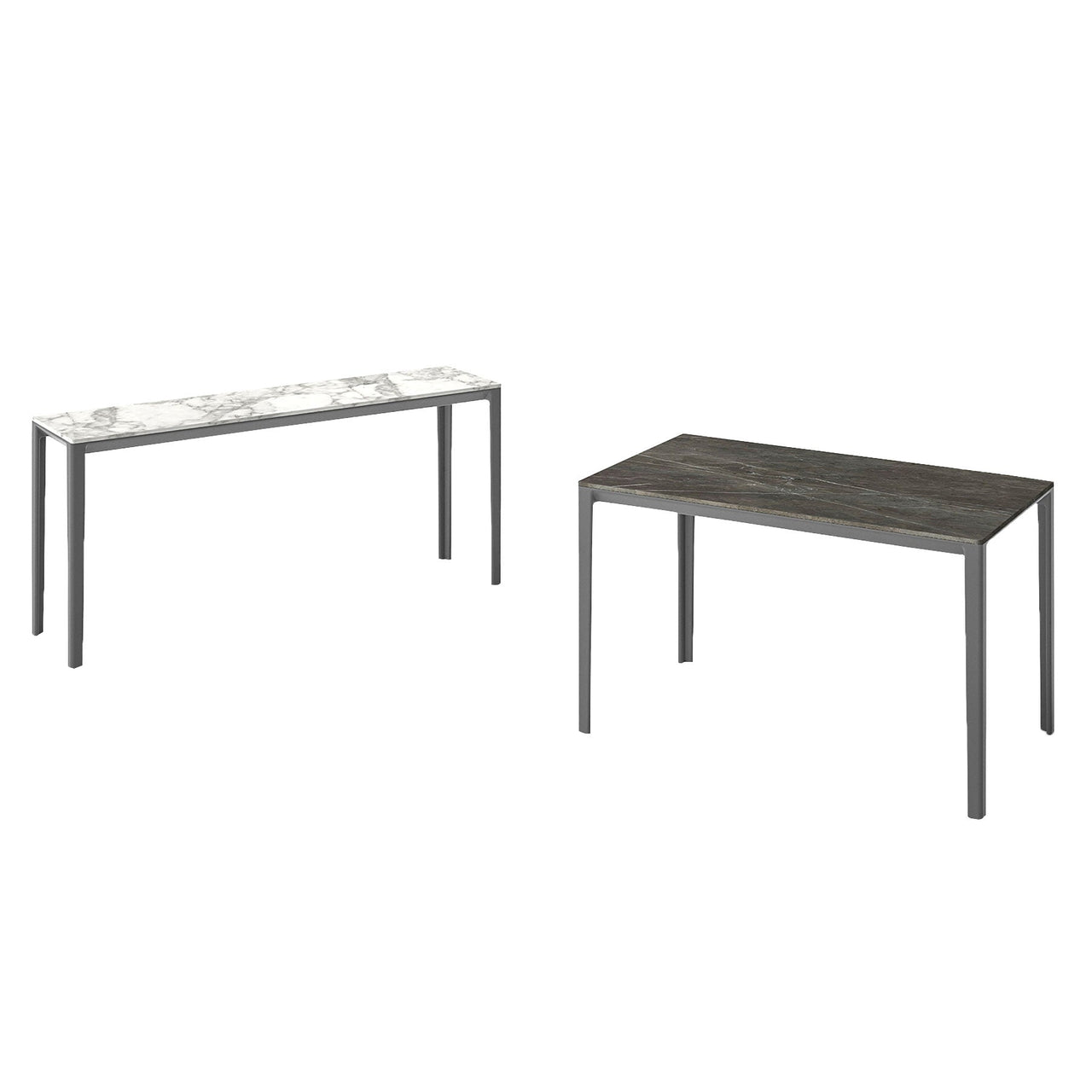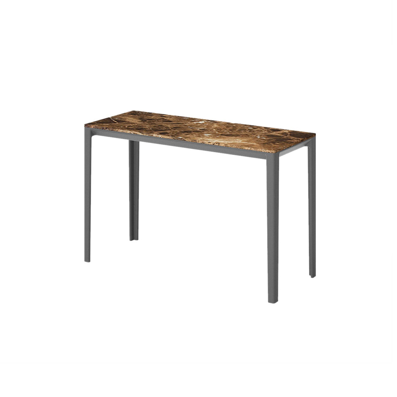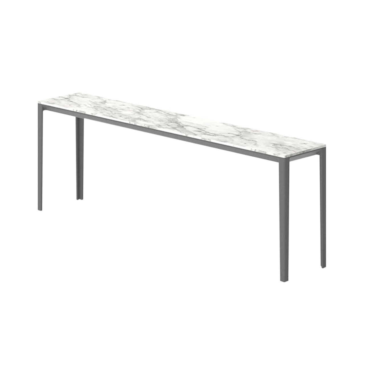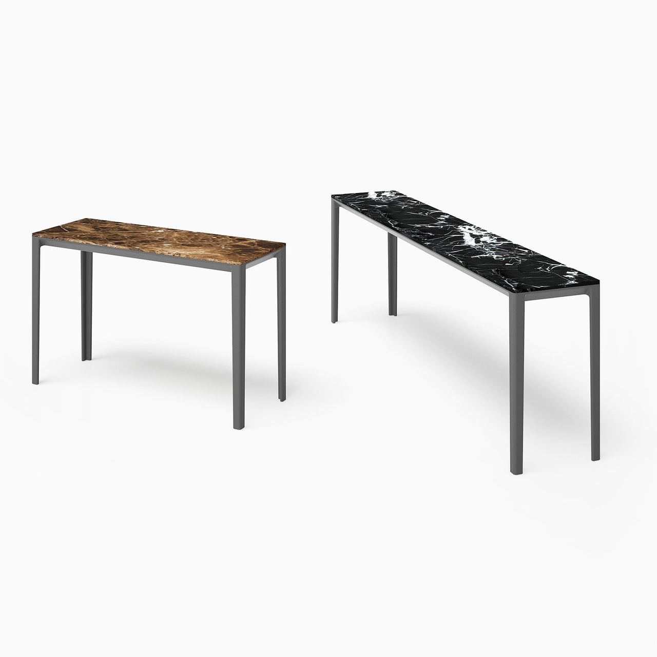 A console that doesn't overpower its surroundings, Able lends a sense of visual lightness to and sleek finesse to a room. Available in 4 sizes, there's one to fit every space. Complementing the beveled-edge tabletop, the curving frame is fashioned in cast aluminum with a subtle graphite finish. Remarkably lightweight but impressively sturdy, the console is available with its top surface in a choice of wood, marble and Polaris laminate.