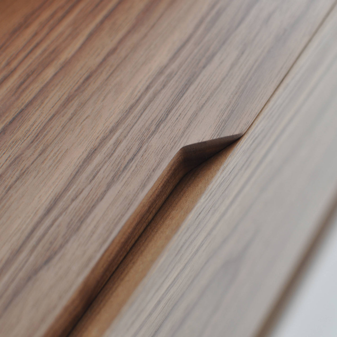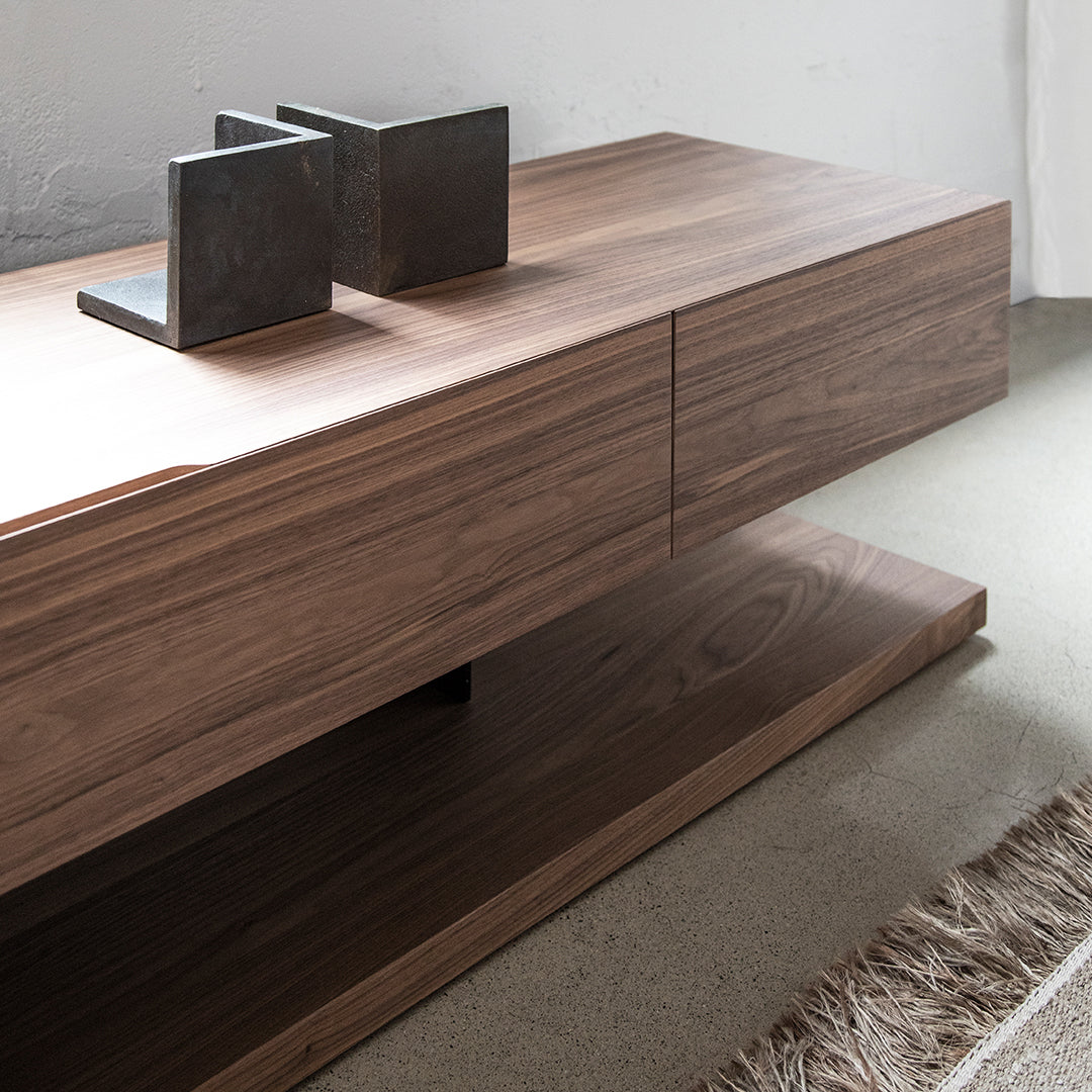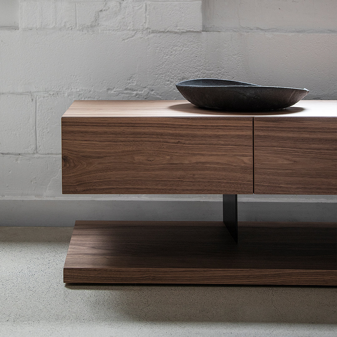 Faced with a single veneered panel, the woodgrain pattern extends across Standard Console, with its center flip-down compartment and 2 drawers. The floating effect of this elegant storage unit is achieved with steel "fins" that separate the base from the body. (Each base comes with imbedded levelers allowing perfect placement on any floor.) Cable management and generous interior space make Standard especially apropos for media components while its striking appearance makes it a standout in any room.