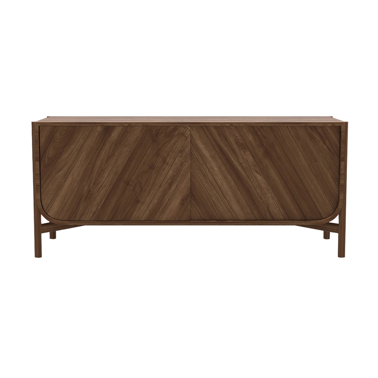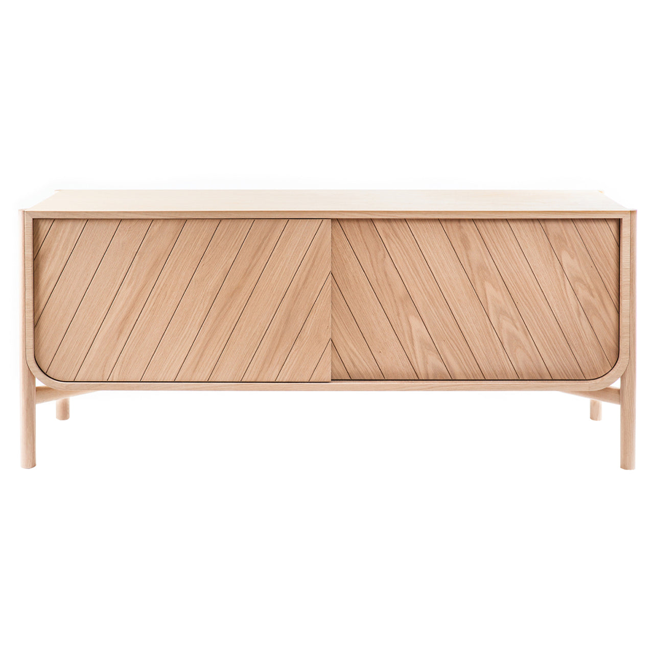 With its distinctive curve in the shape of a ship's hull and the diagonal lines of the frontispiece resembling hoisted sails, Pierre-François Dubois gives his Marius Sideboard a nautical air. Sliding doors allow access from both sides to the generous storage space inside, with one shelf spanning the expanse and a pair of handy cord outlets. From French design brand Hartô, in natural oak finish with doors to match or in contrasting light grey or petrol blue.