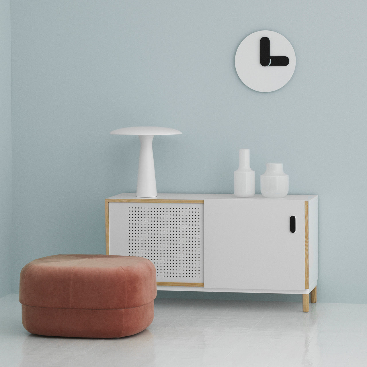 Theme and variations. For the Kabino Sideboard, designer Simon Legald jazzily improvised on the classic low rectangular cabinet by bopping around with unexpected details. One of the steel sliding front-door panels is perforated; the other is not. Slotted handles, smoothly integrated into the doors, are staggered in their placement. And warm ash trim adds a counterpoint to the sleek metal. As Simon says, "I like to work in the cross field between craftsmanship and industry." Kabino is available with white or grey doors and is at home all over the office or house in a living room, dining room, hallway or bedroom. The cabinet also accommodates electronics and the perforated door allows use of a remote control even when closed. From Normann Copenhagen, which equally believes in upending traditional expectations to pleasing effect.