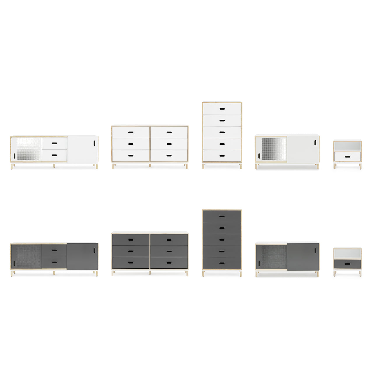 Form and function get equal footing in the versatile Kabino series of storage pieces from Normann Copenhagen. Designer Simon Legald highlights the details rather than hiding them in this sideboard with a set of drawers and dual sliding panel doors. The signature open handles hew to an industrial look while a natural frame of ash adds visual warmth. Equipped for electronics with an inside cable outlet and a perforated panel to allow use of a remote control. Soft-close drawers function silently, underscoring the elegant utility of this standout piece.