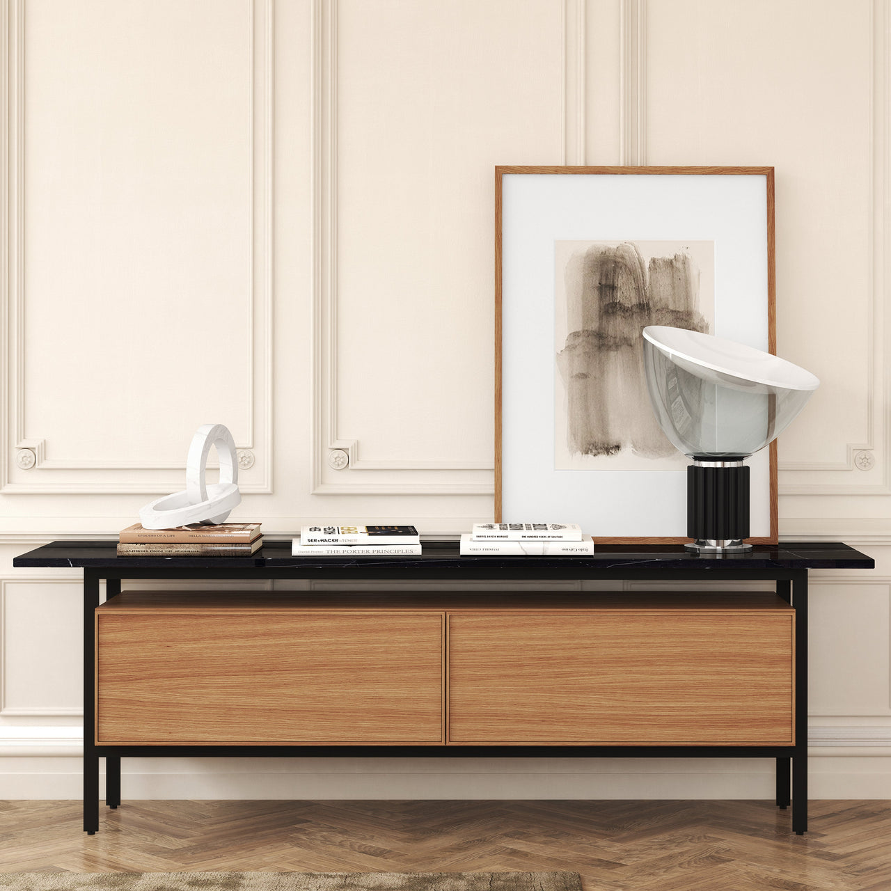 In an richly finished wood version, Punt’s sideboard conceived with Copenhagen’s Norm Architects has a warmly resonant presence. Inspired by modernist architecture, Chicago’s door-front cabinet seems to float within its elegant steel framework that comes in a range of metal finishes. Several luxe choices of marble tabletop are offered along with oak and walnut options to match the sideboard. All in all, this standout piece reflects the exceptional craftsmanship of its Spanish makers.