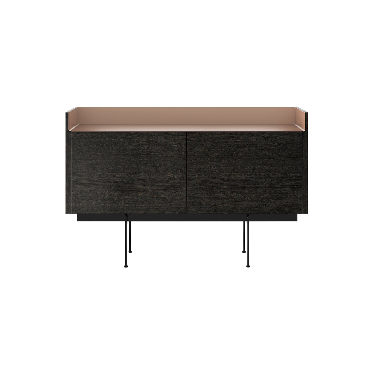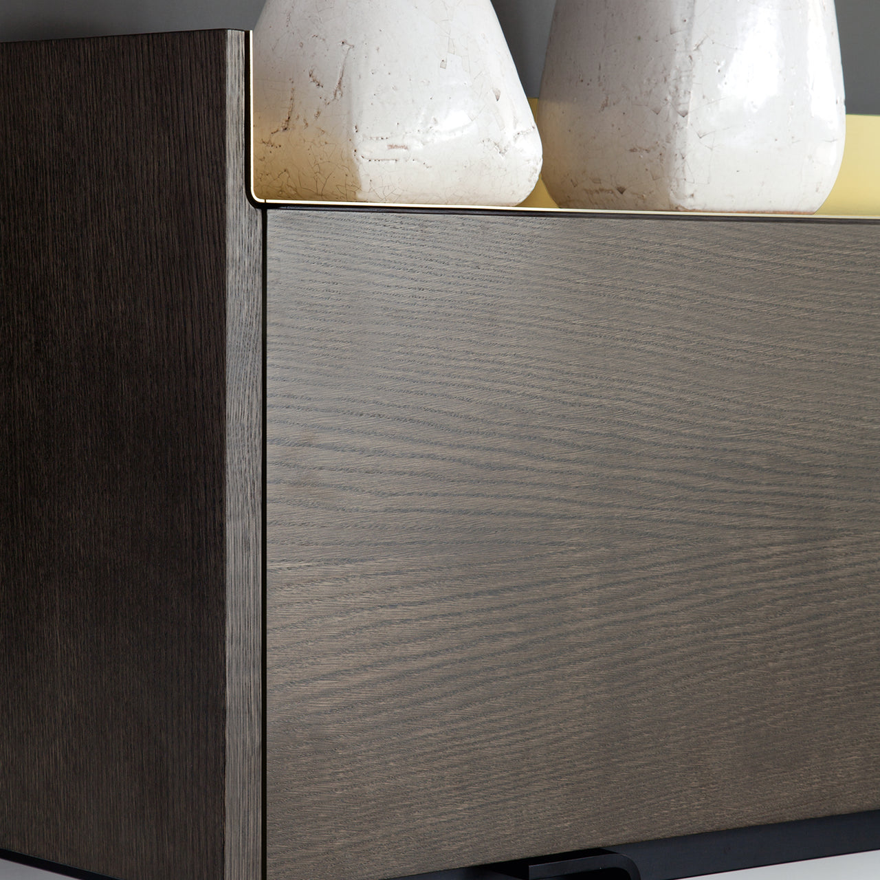 In the compact 2-door Stockholm Sideboard, like its larger sister versions, designer Mario Ruiz for Punt offers a clean-lined storage solution in a contrast of rich oak or walnut veneer with the collection’s signature gleaming metallic top in a choice of anodized aluminum hues. The sleek, flush-front cabinet features a height-adjustable shelf in each interior compartment as well as optional cable management and it sits on a plinth-style metal base in black or bronze.