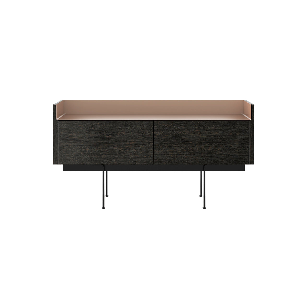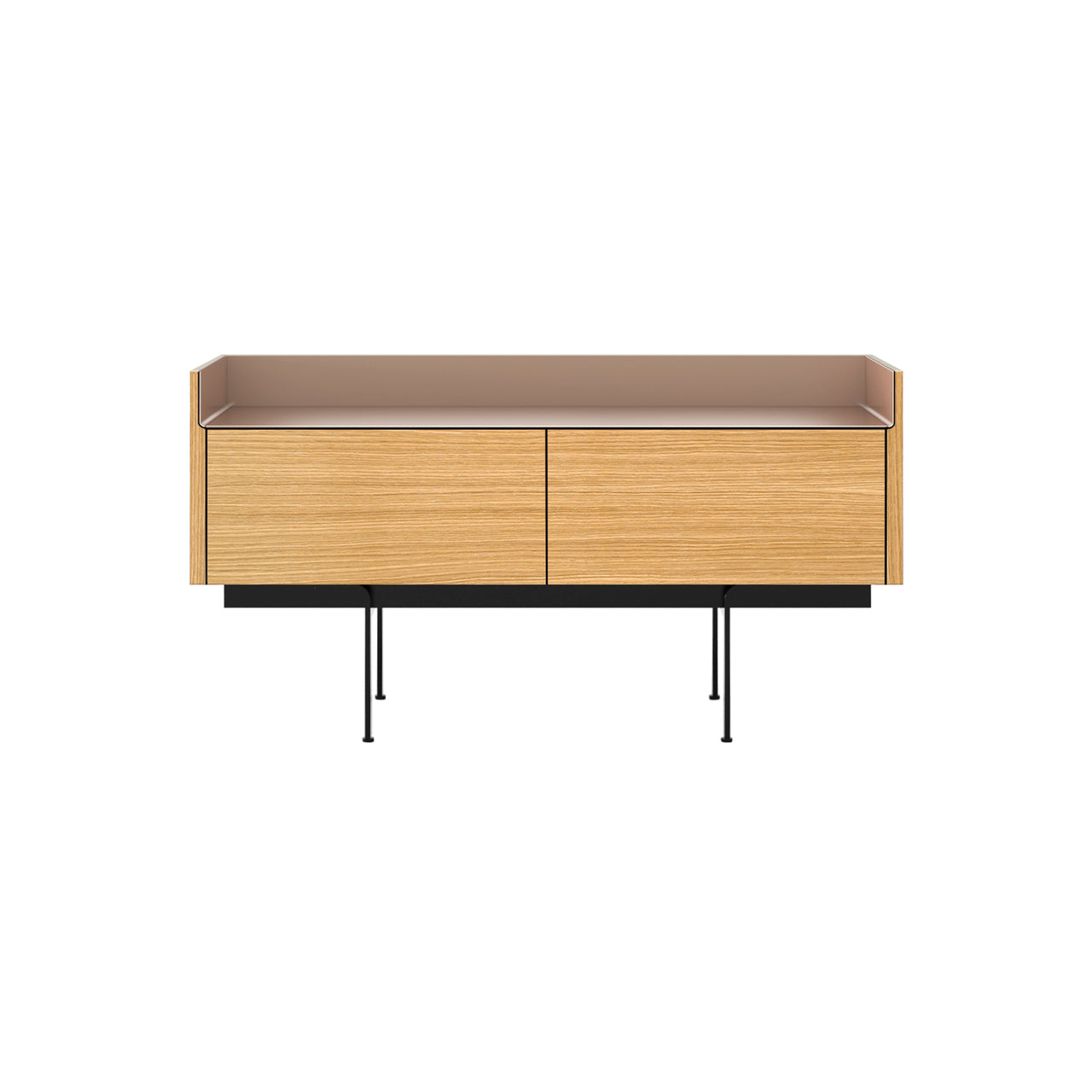 Designer Mario Ruiz adds to Punt’s signature lineup with Stockholm Slim, a slenderized take with a lower TV-friendly height, here with 2 drop-down solid doors that reveal a height-adjustable shelf within. Typified by its glimmering aluminum top, the sideboard is offered in oak or walnut veneer and sits on an epoxy powder-coated metal base.