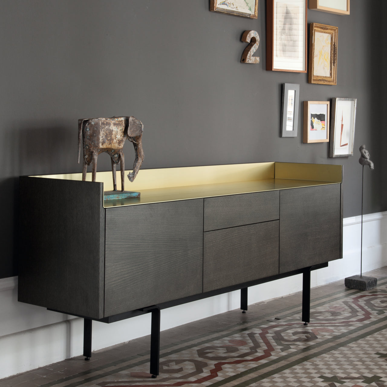 Stockholm STH302 Sideboard: Composition 3 + Ebony Stained Oak + Anodized Aluminum Bronze + Black
