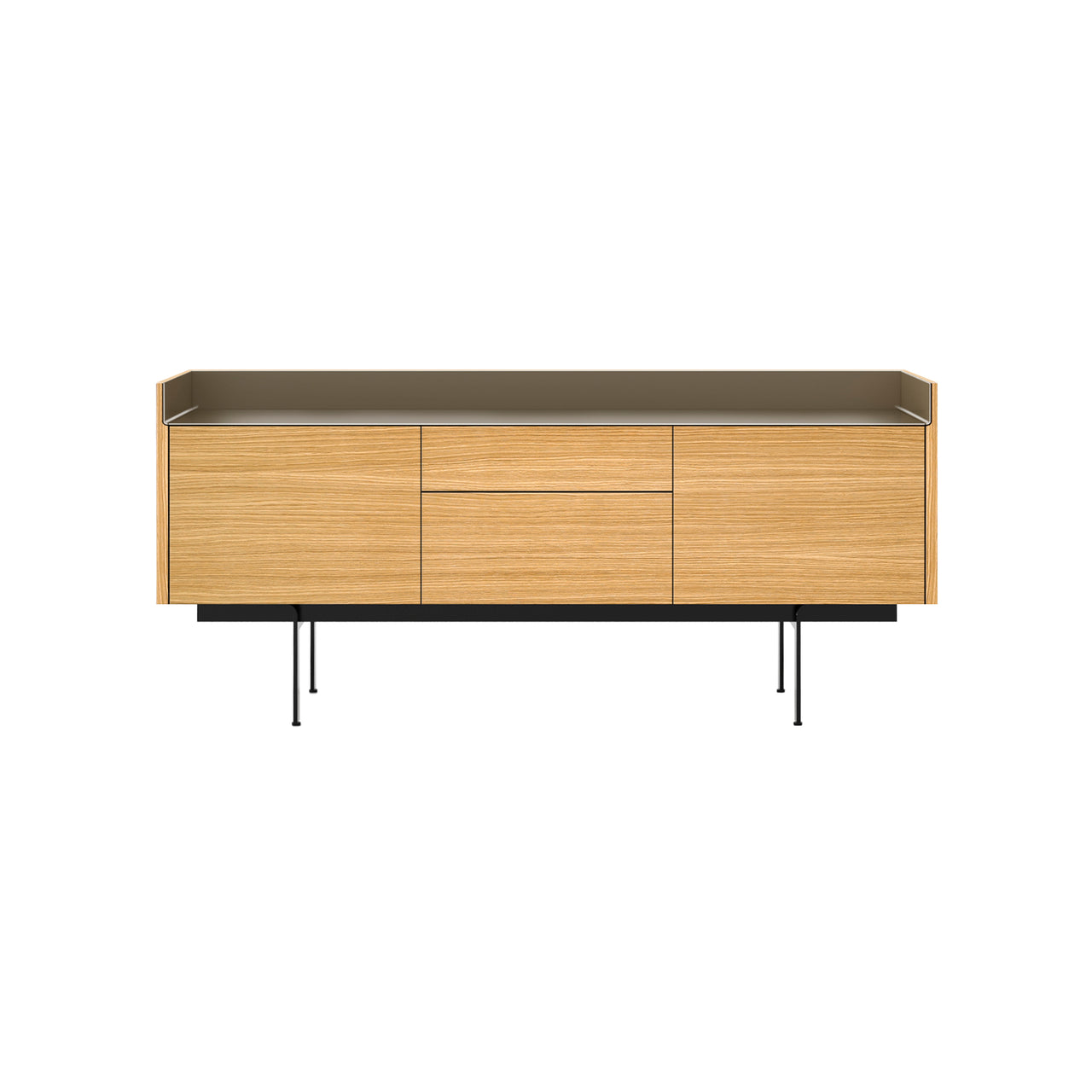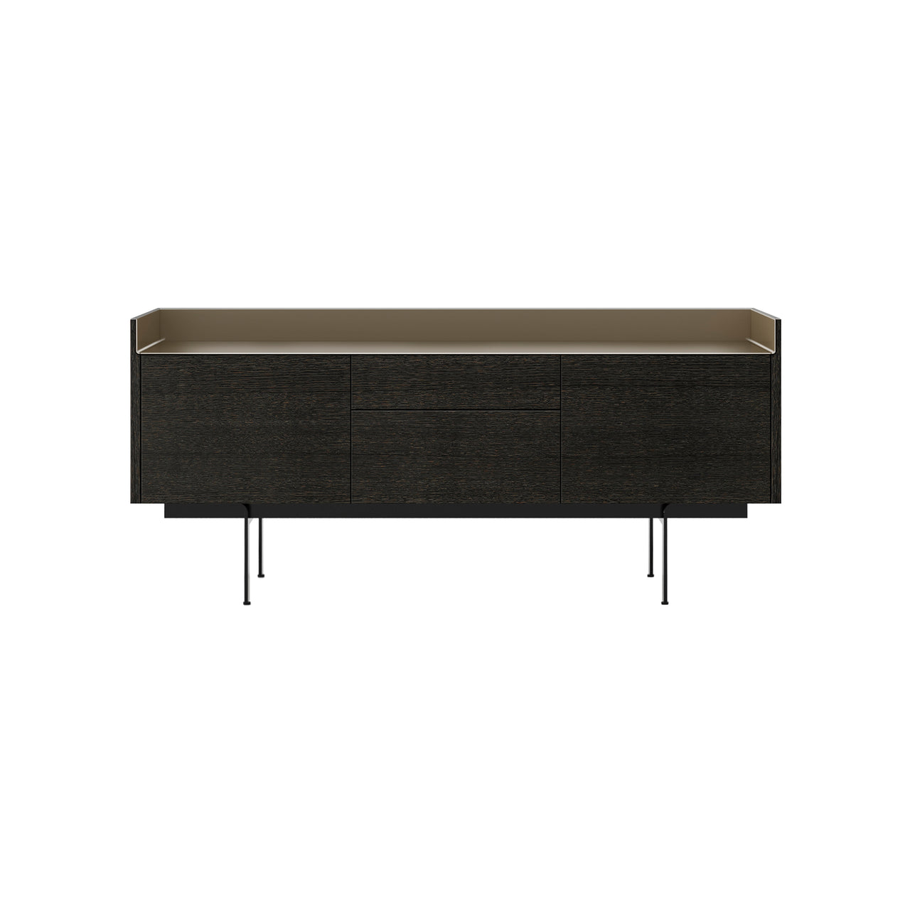 The STH302 Sideboard is a refined storage piece featuring two doors and two drawers, all handle-free for a sleek appearance. Inside, adjustable shelves provide customizable storage. An anodized aluminum top adds sophistication, available in 5 finishes. The sideboard stands on powder-coated steel legs with adjustable feet for stability. This design exemplifies a harmonious blend of aesthetics and practicality.