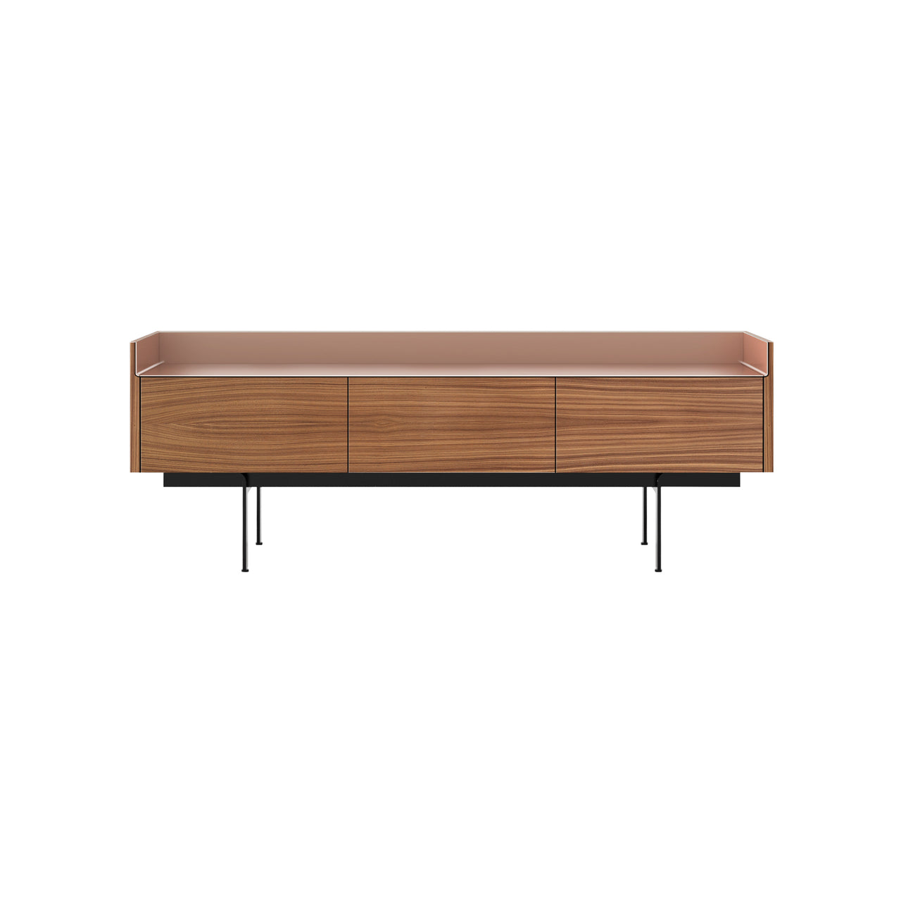 Three drop-down solid doors give a smooth look to Punt’s mid-size version of Stockholm Slim, with its lower TV-friendly height and triple storage compartments, each with a height-adjustable shelf. Designer Mario Ruiz appoints his crisply proportioned sideboard in oak or walnut veneer with a slender metal base and the series' signature aluminum top.