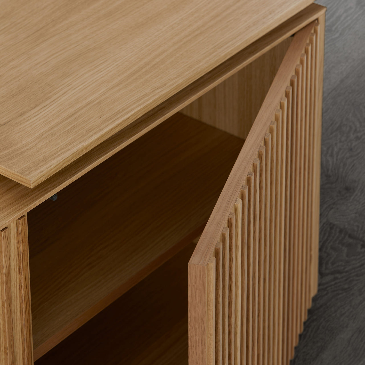 The triple-unit Composition 3 with an equal-size extendible top surface, like its siblings conceived by designers Ludovica + Roberto Palomba, lends versatility as its surface expands to suit an individual setting. Crafted in veneered oak, Velasca Extensible brings a warm approach to minimalism with the additional flourish of vertical slats on the doors and side panels.