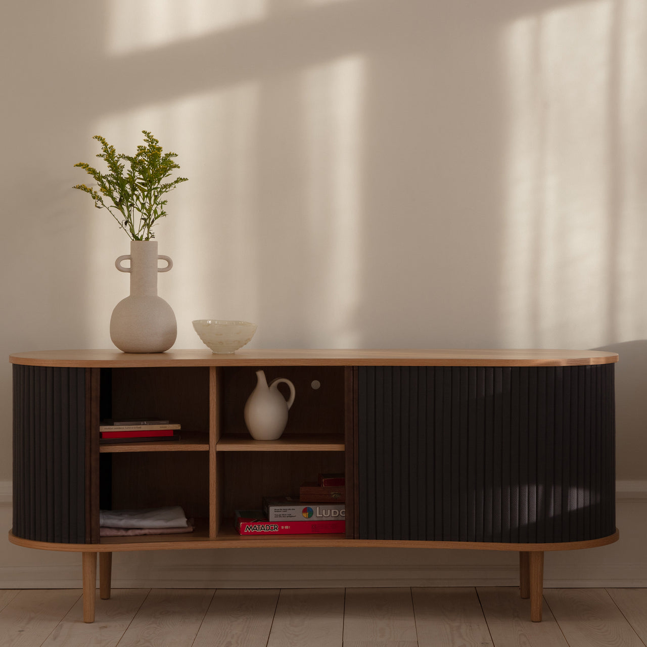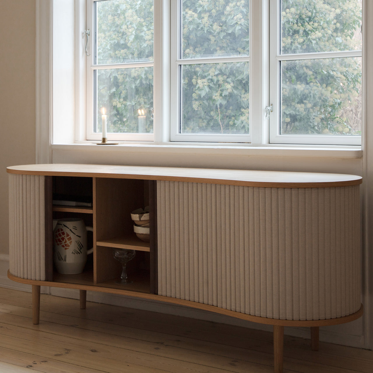 The Audacious Sideboard features a curved, organic silhouette complemented by sliding fabric tambour doors, offering a blend of Nordic grace and modern functionality. Designed by Jonas Søndergaard, it includes adjustable shelves and discreet outlets for concealing electronic equipment. The tambour doors are easily interchangeable, allowing for customization without replacing the entire piece.