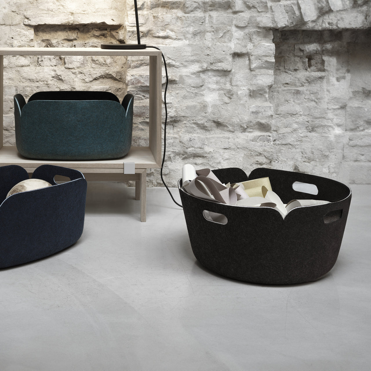 Muuto's capacious round basket augments the eco-friendly storage lineup from Finnish designer Mika Tolvanen. This collection of round and rectangular containers are molded from scratch-free felt, inventively fabricated from recycled PET plastics. Large enough to hold newspapers or firewood, stow toys or collect blankets. We even think they make a cool pet basket. And the clean lines and soft texture fit in any living spaces.