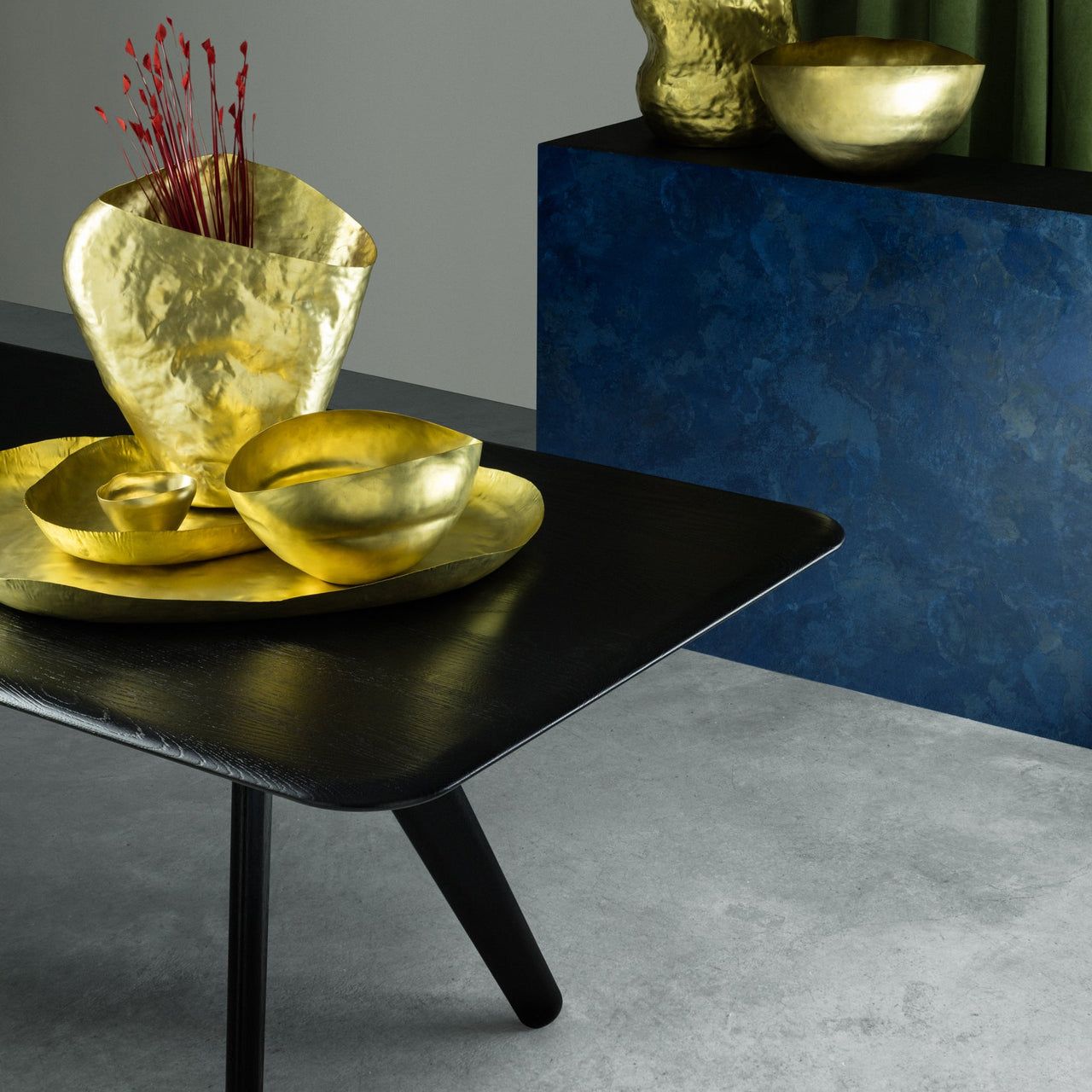 There’s an appealing spontaneity in this Bash crimped and hammered wide brass vessel. Each one bears the unique imprint of the craftsman and is fashioned from a single sheet of metal. Surprisingly delicate in appearance, the final product gets a wash for a matte finish but will develop a fine oxidized patina over time.